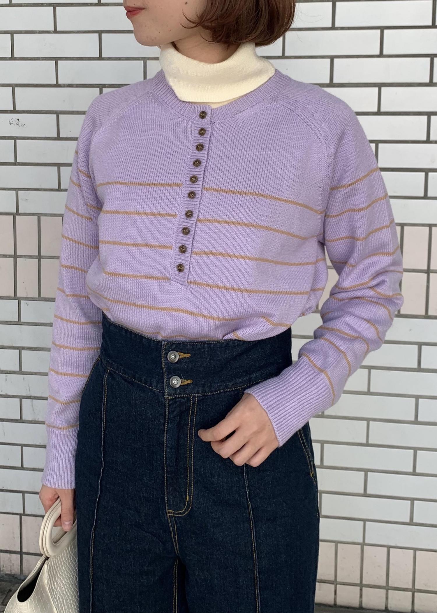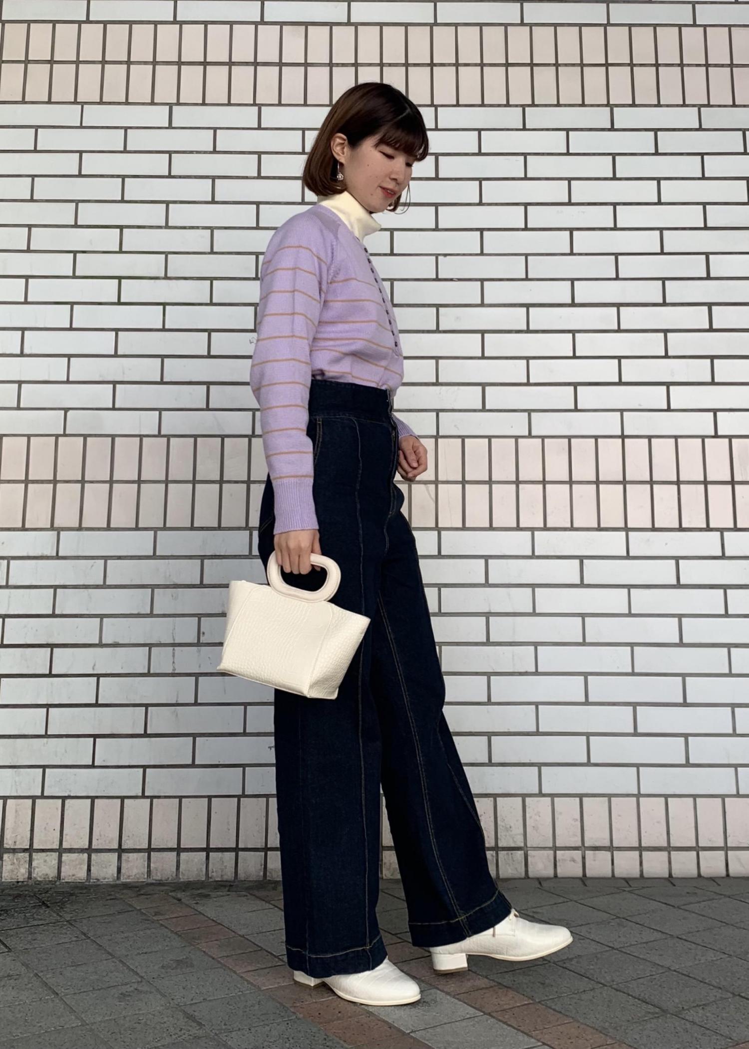 トップスはパープルでフェミニンな印象なので、デニムパンツを合わせてバランスよくしてみました。靴と鞄は明るい印象にしたかったのでホワイトを選びました!ポップな色合いで気分も上がります♪