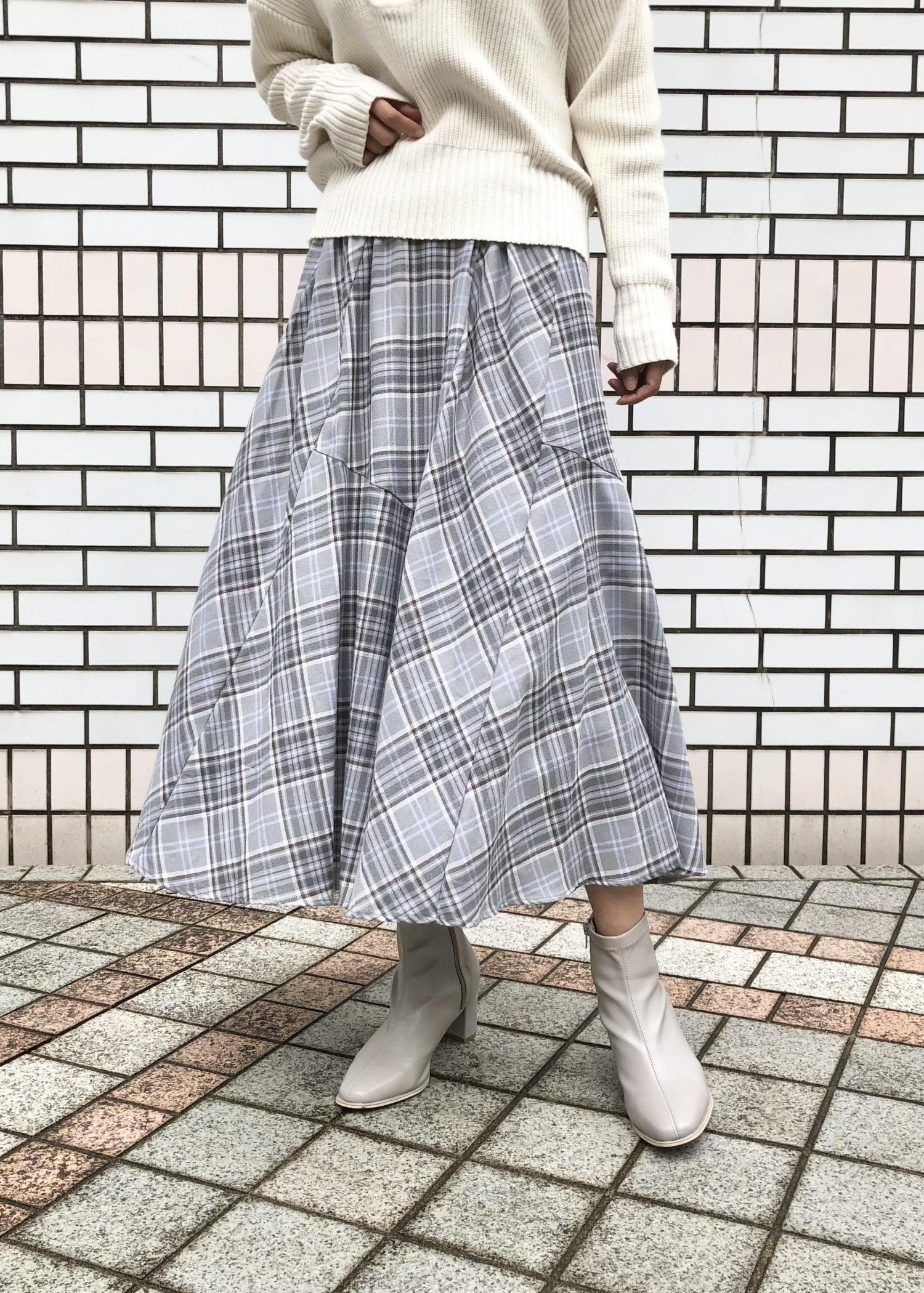 ブルー系スカートにグレーのブーツを合わせることで甘すぎない大人可愛いコーデにしました。