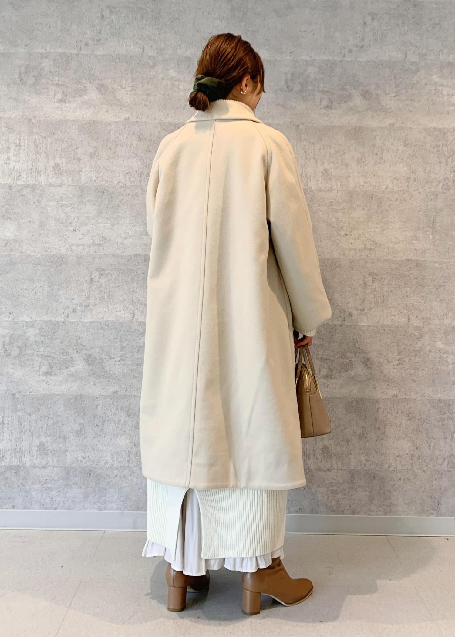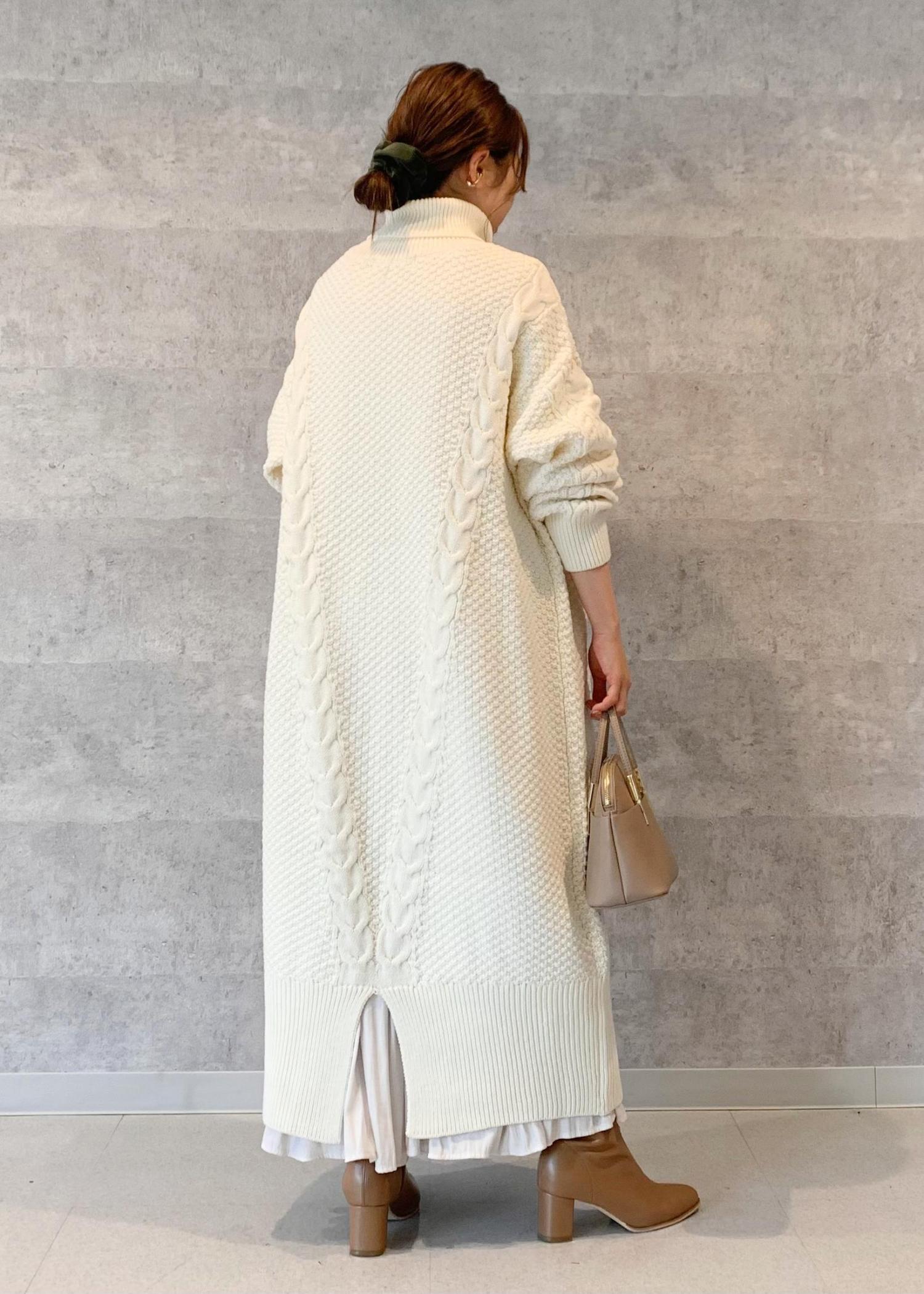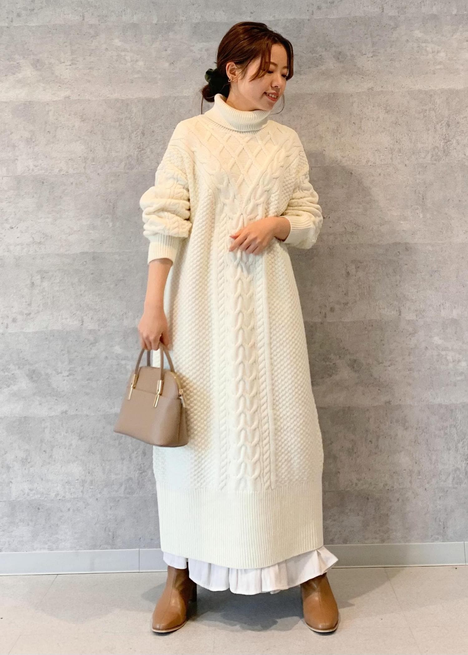 冬の定番のニットワンピースにプリーツスカートを合わせたコーディネートです。
