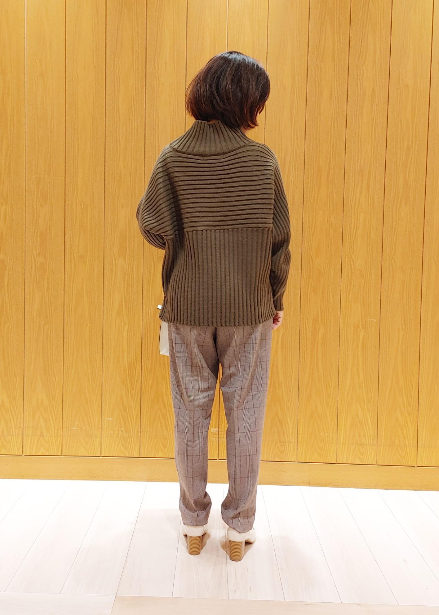 人気のリブ切替ニットにチェック柄テーパードパンツを合わせました。オフィスカジュアルでも合わせやすいニットです。