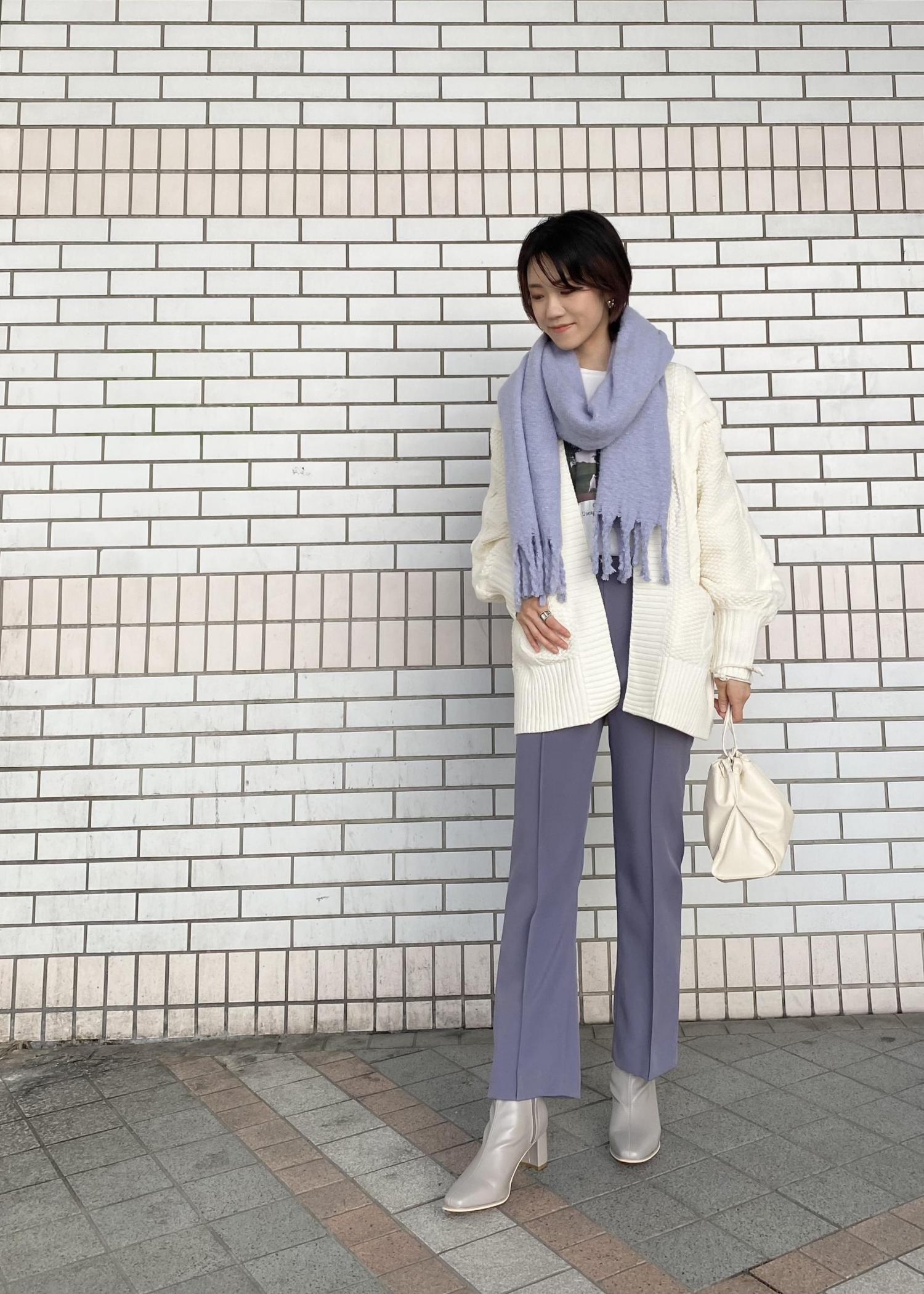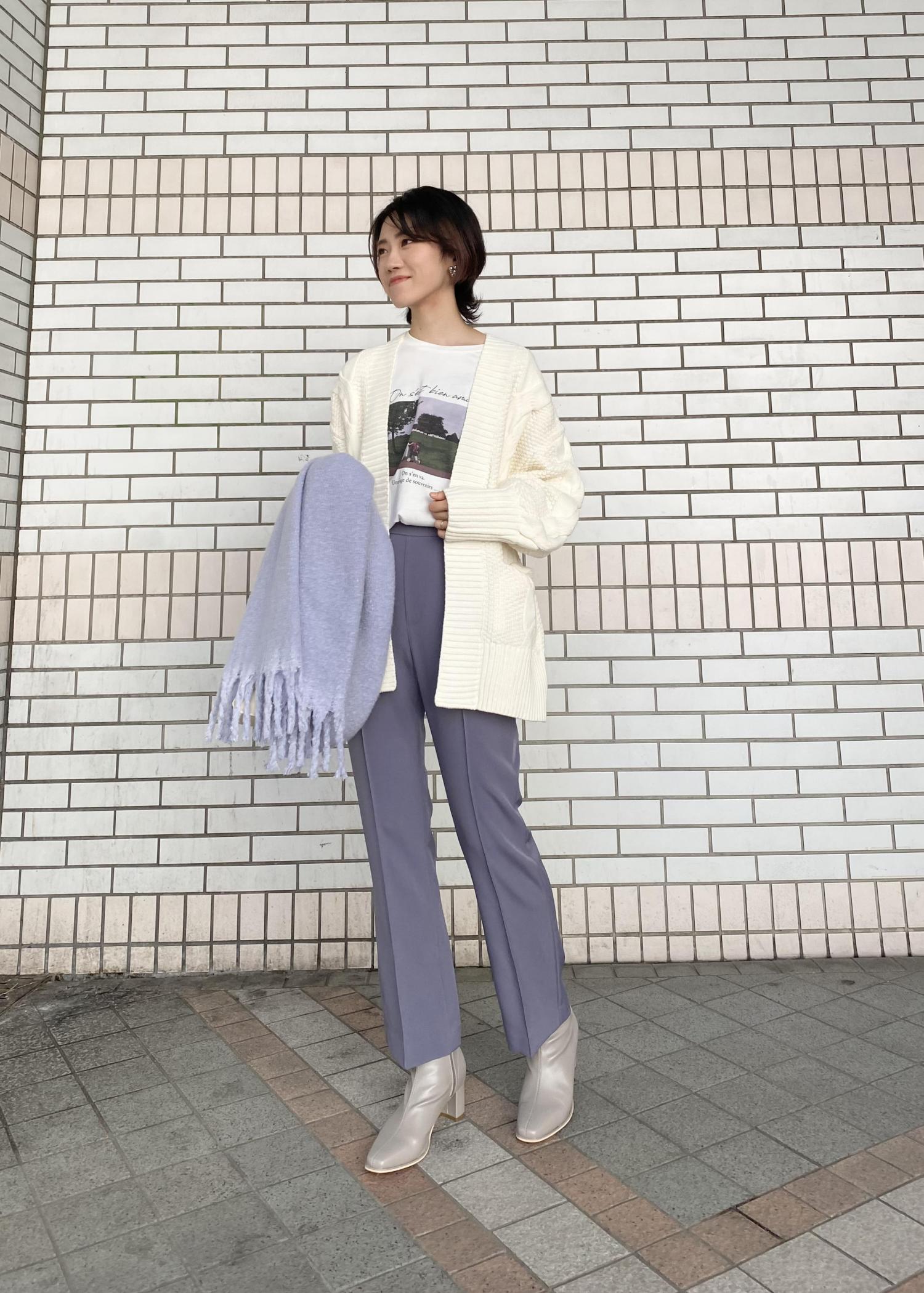 パープルを基調にカジュアルコーデ。 上品なくすみパープルは大人のカラーコーデに取り入れやすく、シック且つ華やかなコーディネートに仕上がります。