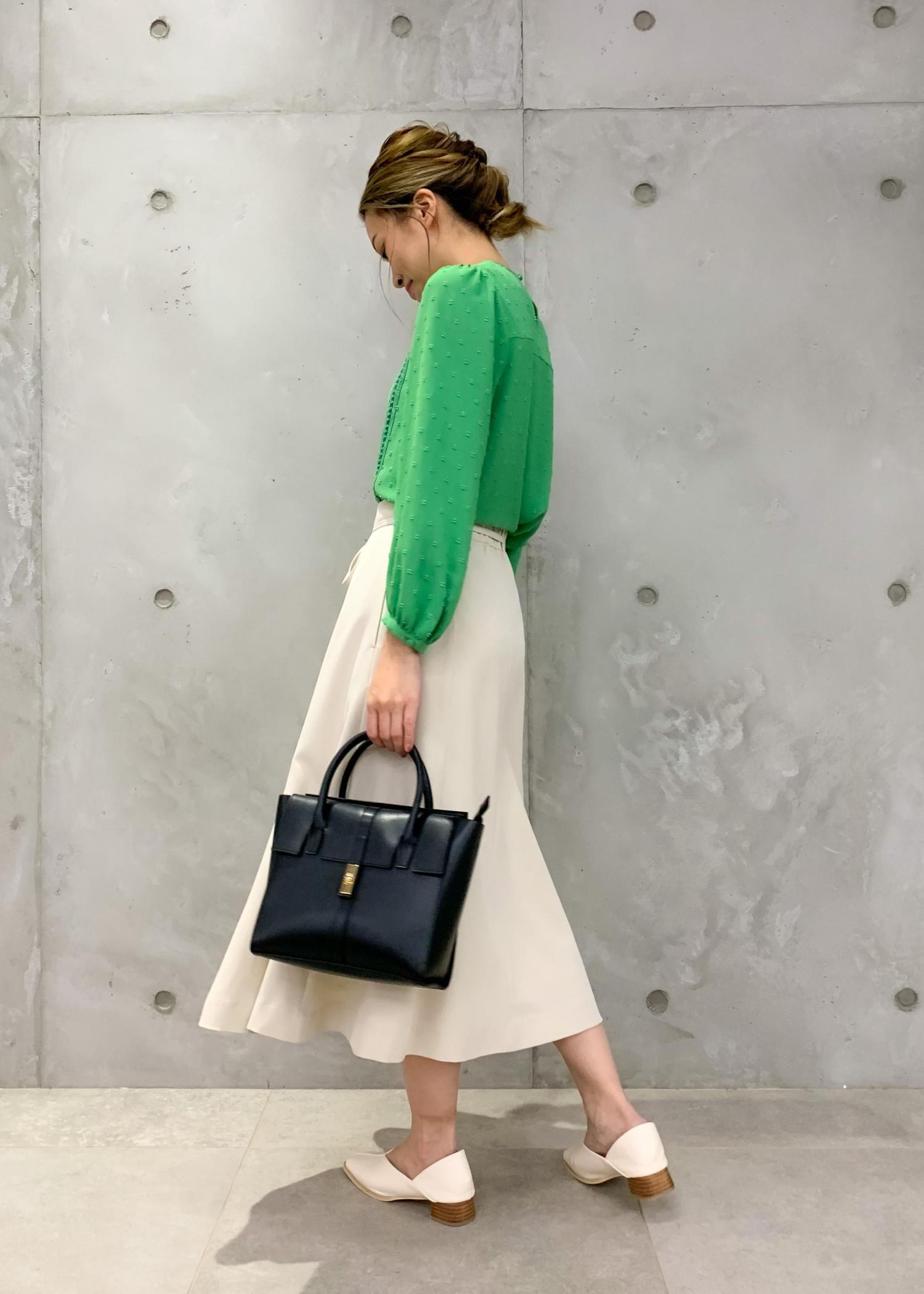 合わせたスカートは自然になびくフレアシルエットで、ミモレ丈が上品なデザイン。