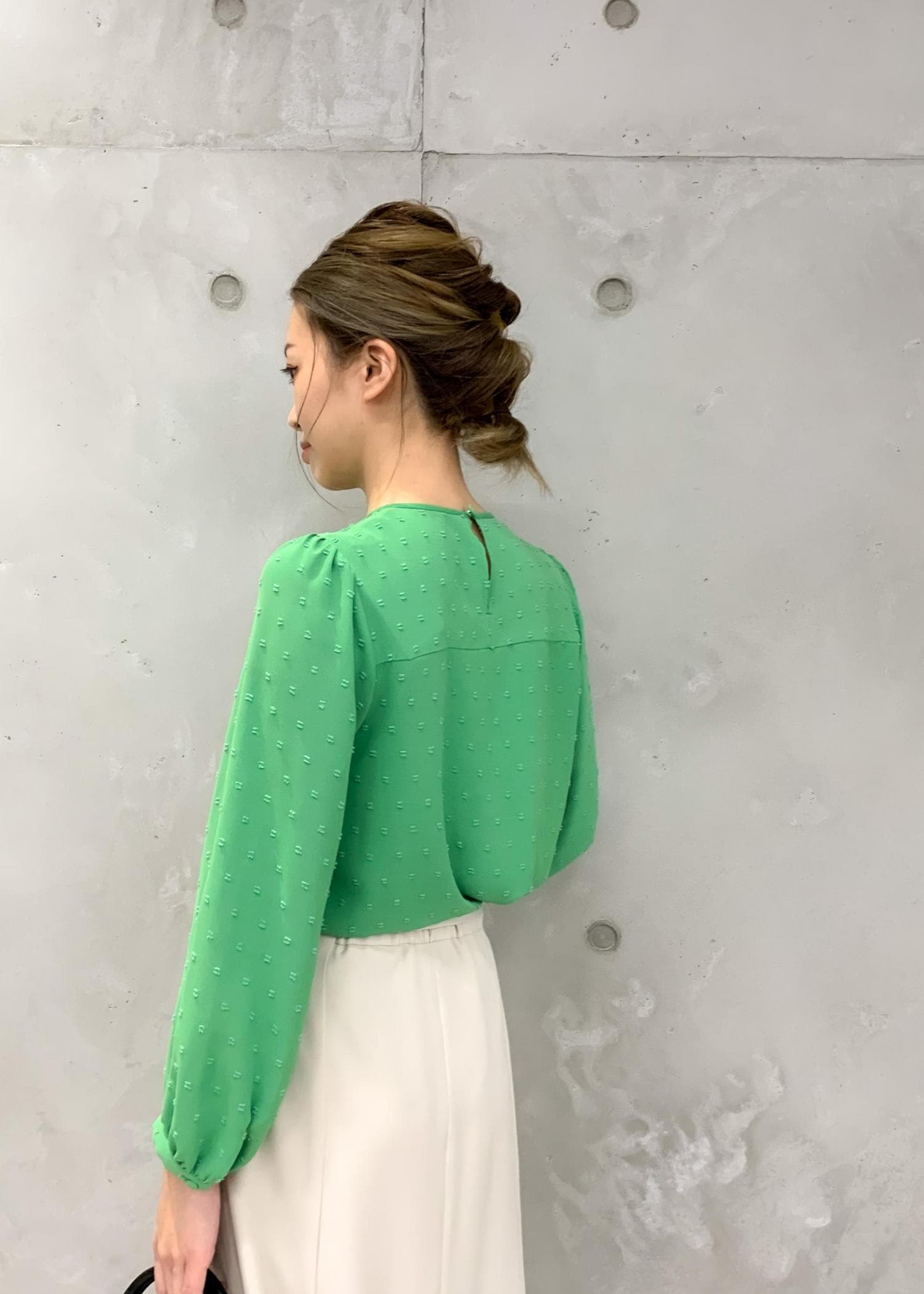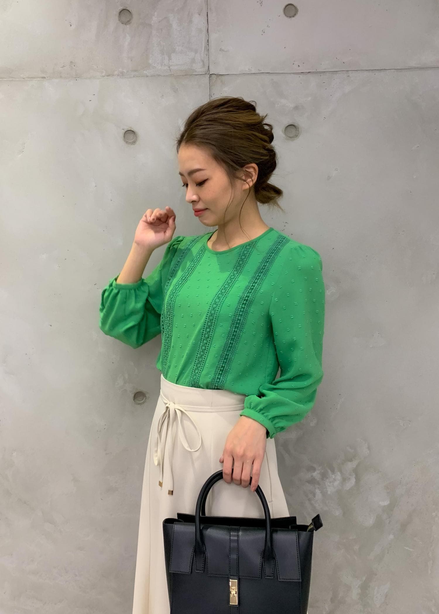 ブラウスはレースの切替が春夏らしい涼しげな印象。