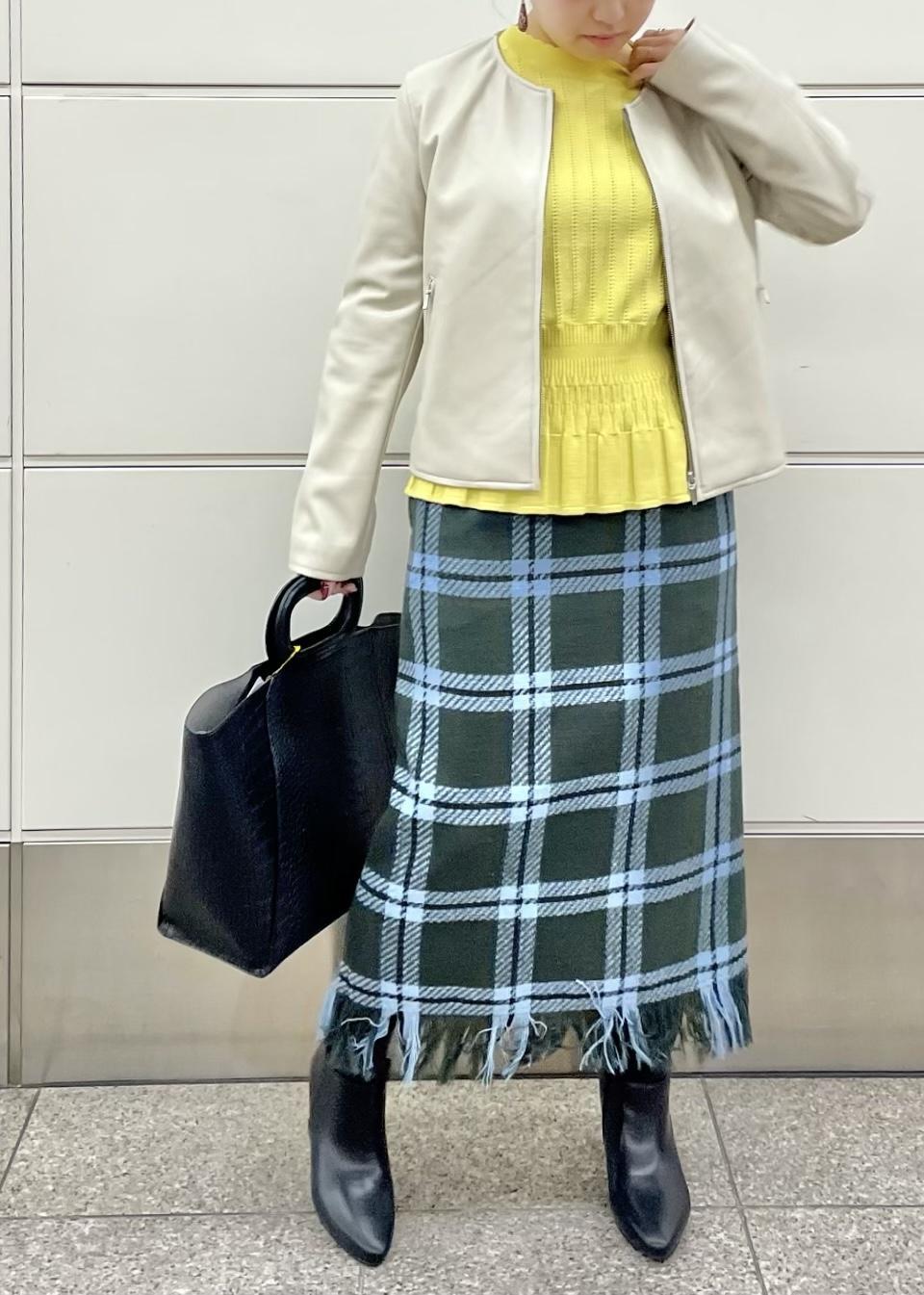 顔写りの良いカラーのトップスに落ち着いたチェックのiラインスカートを合わせてフェミニンなコーディネートにしました♪