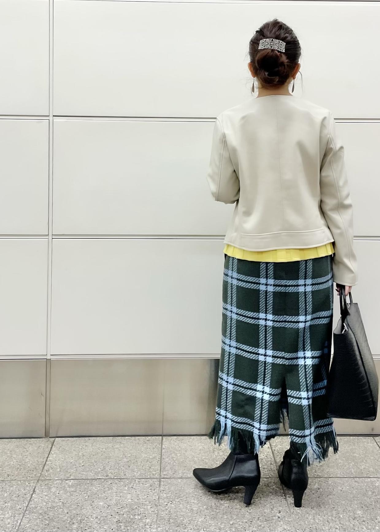 フェイクレザーのジャケットもオフホワイトで全体の印象が落ち着いてまとまるように☺︎