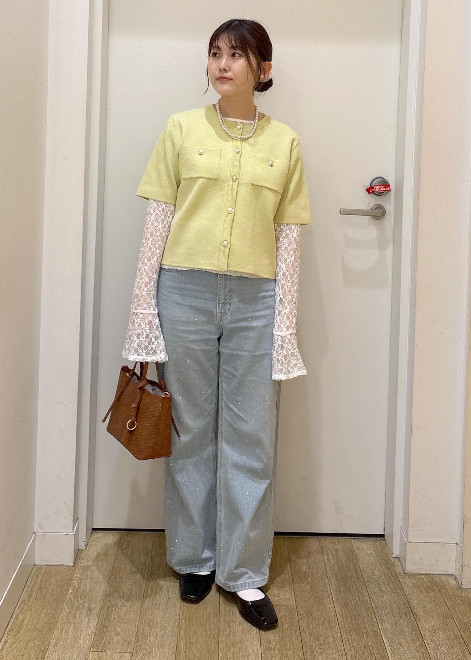 ワンピースにトレンドのグリーンのパンツをレイヤードして着用しました。