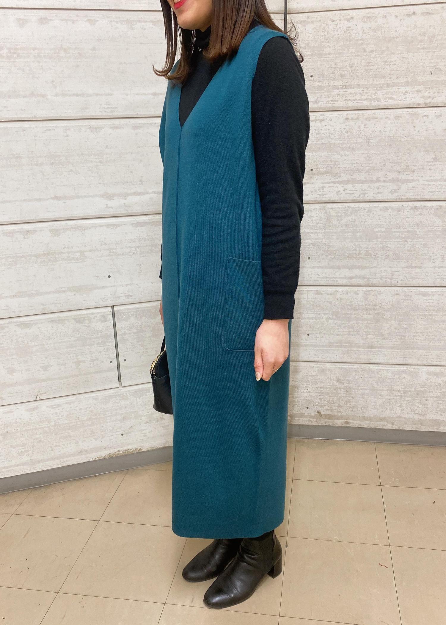 珍しい色味のジャンパースカートに黒のタートルを合わせて落ち着いたコーディネートに仕上げました。