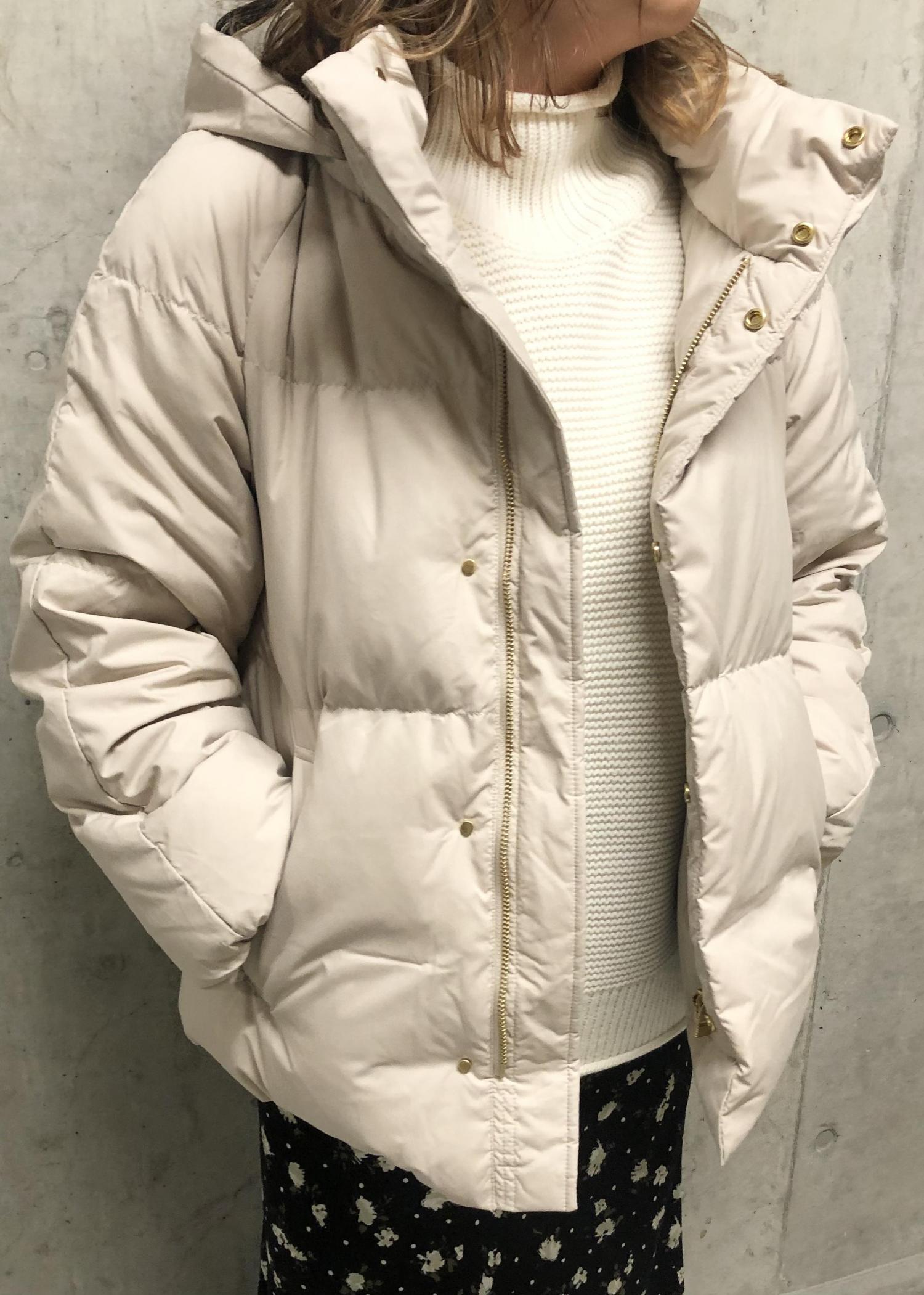 ダウンはショート丈なのでスカートとの相性が抜群です。トップスはシンプルなのでスカートに柄物をプラスしました。ドット柄と花柄のミックス柄なのでワンポイントになります。