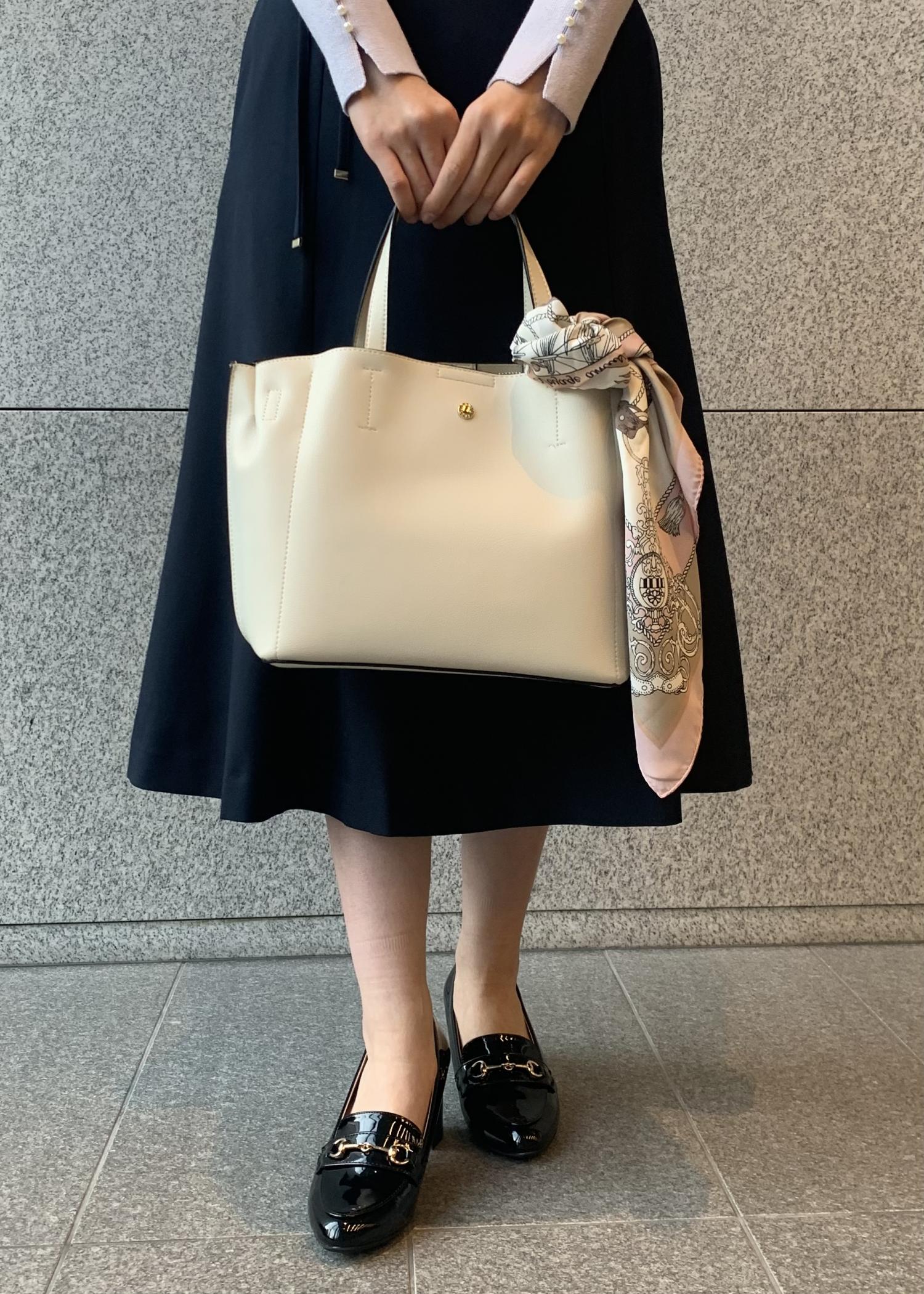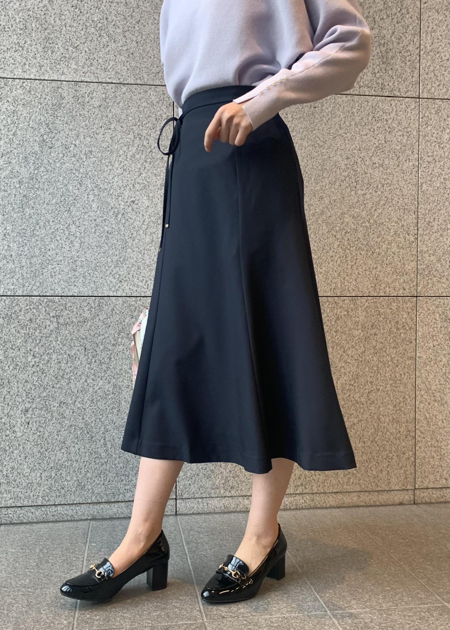 パープルのトップスにスカートを合わせてフェミニンな印象に。デザインはフェミニンですが、色味をネイビーやブラックを取り入れてメリハリを出してみました。