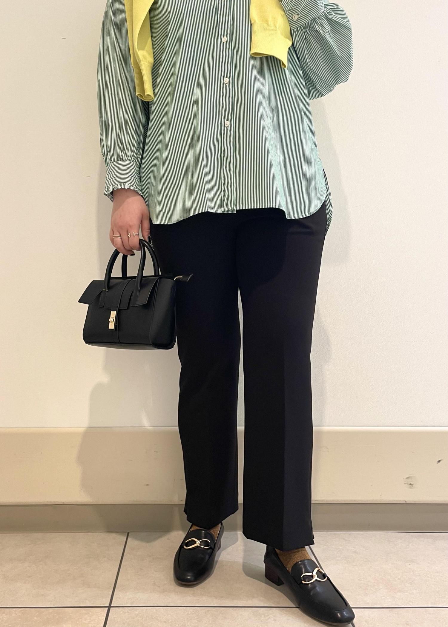 着用しているバンドカラーシャツは1枚でも可愛いですが、スエットなどとレイヤードしたスタイリングも素敵です!