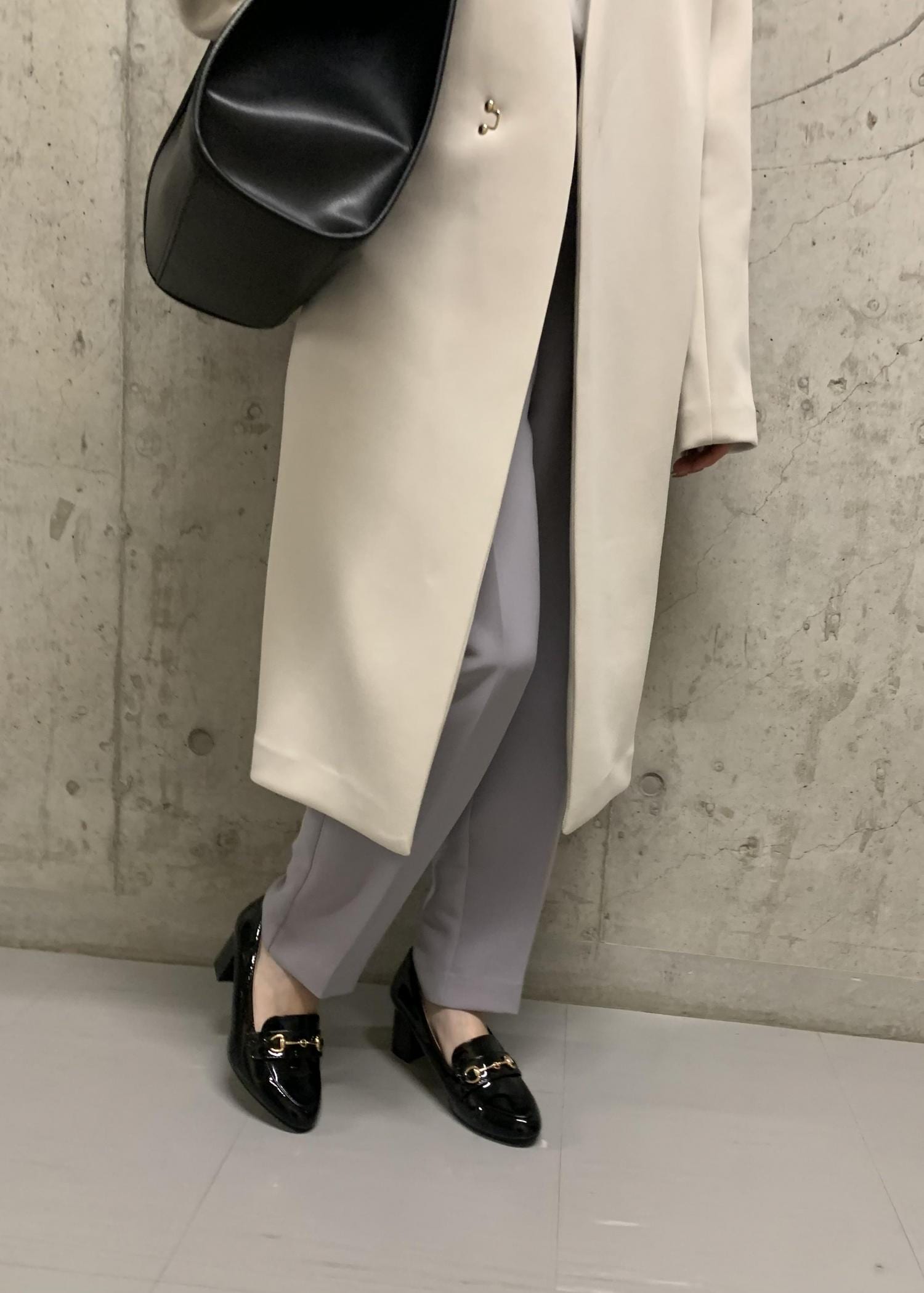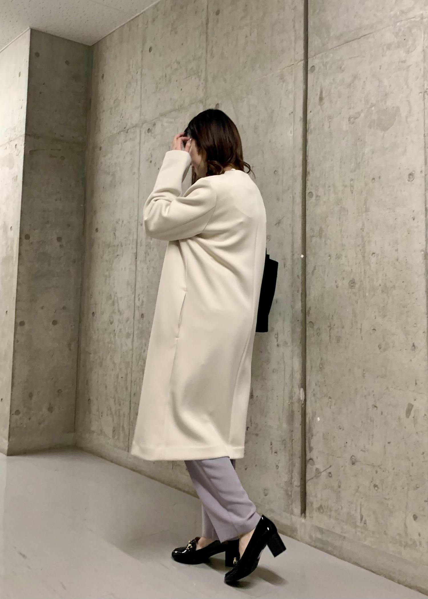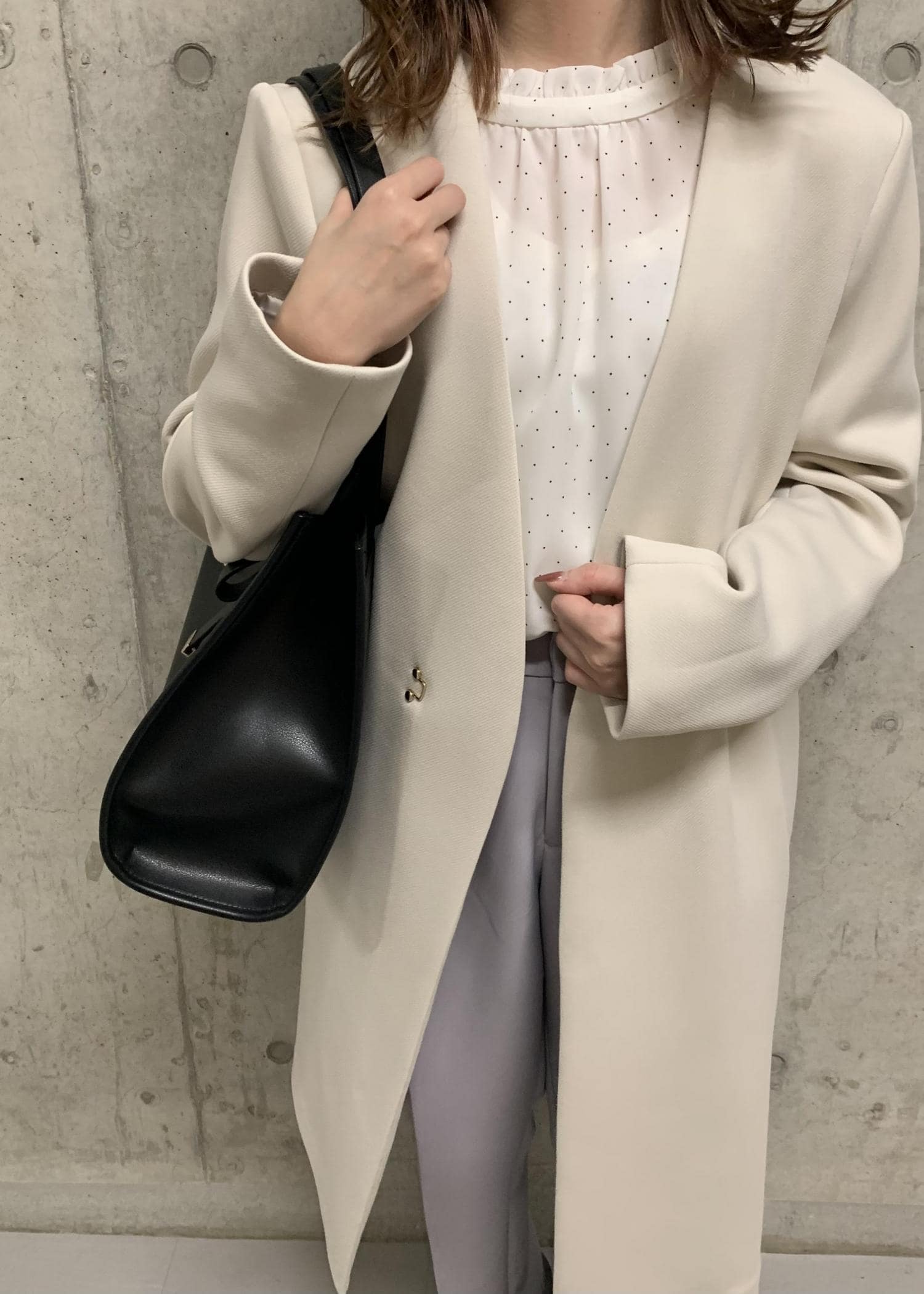 ドット柄のかわいいフェミニンなブラウスに、きちんと感のあるテーパードパンツ、サッと羽織れるアウターを合わせて淡いカラーでまとめました。