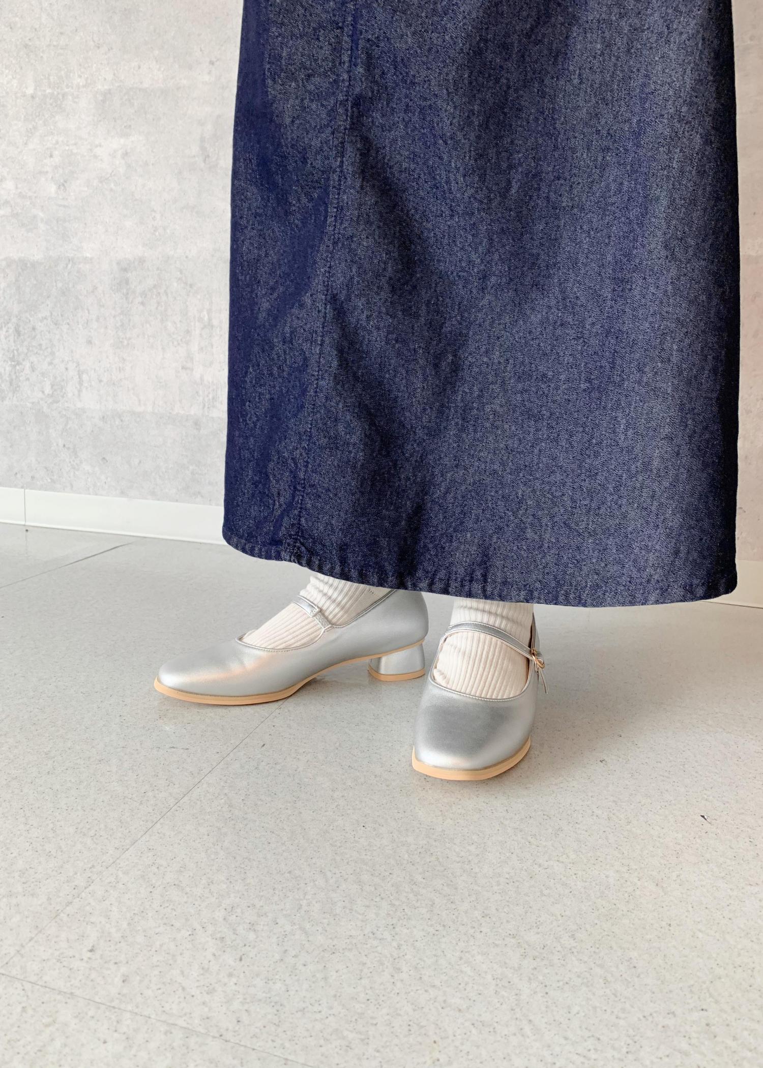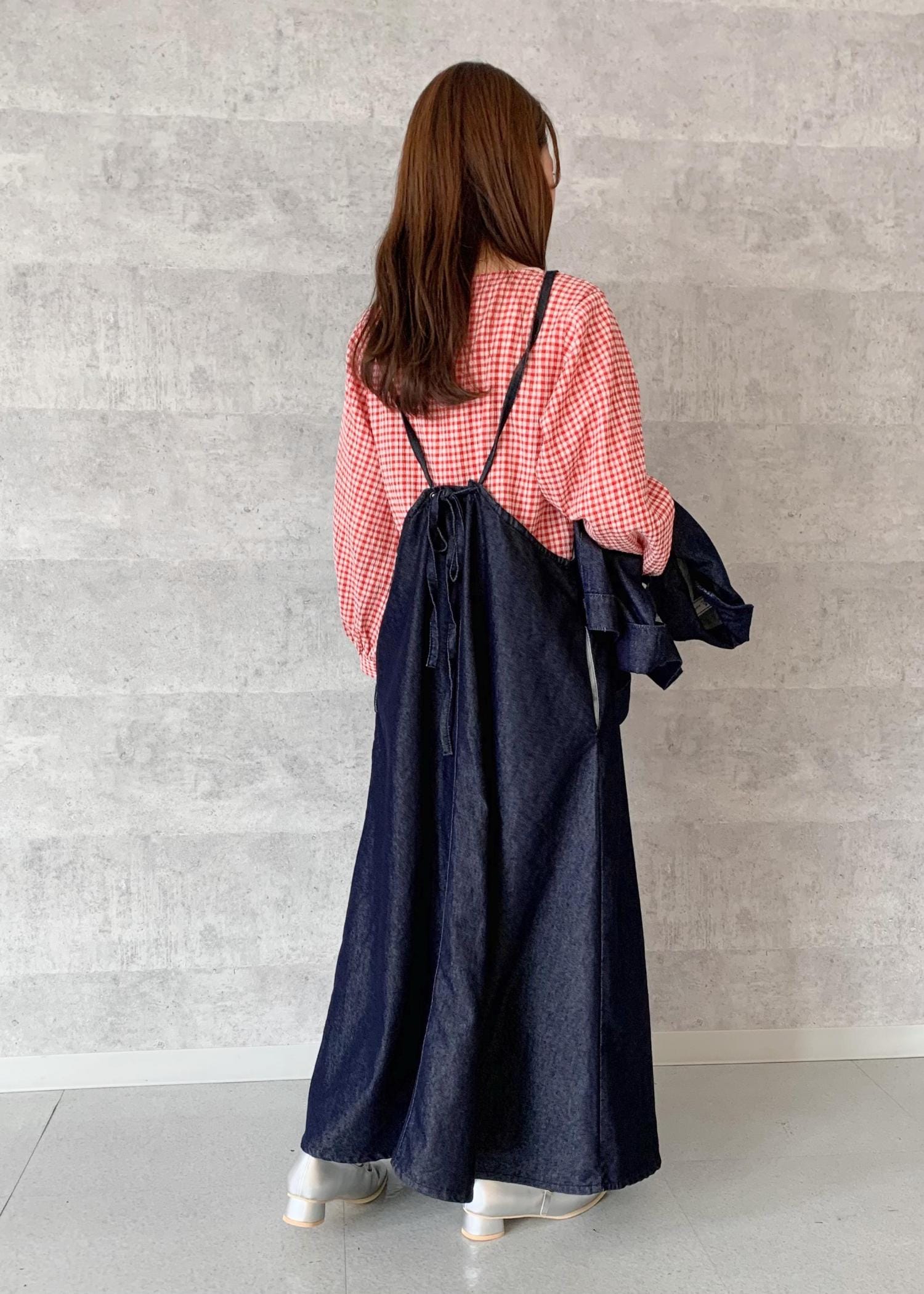 トレンドの原色系を取り入れ、デニムのセットアップと合わせたことでレトロな雰囲気にまとめました。足元はシルバーを合わせて軽い印象に◎
