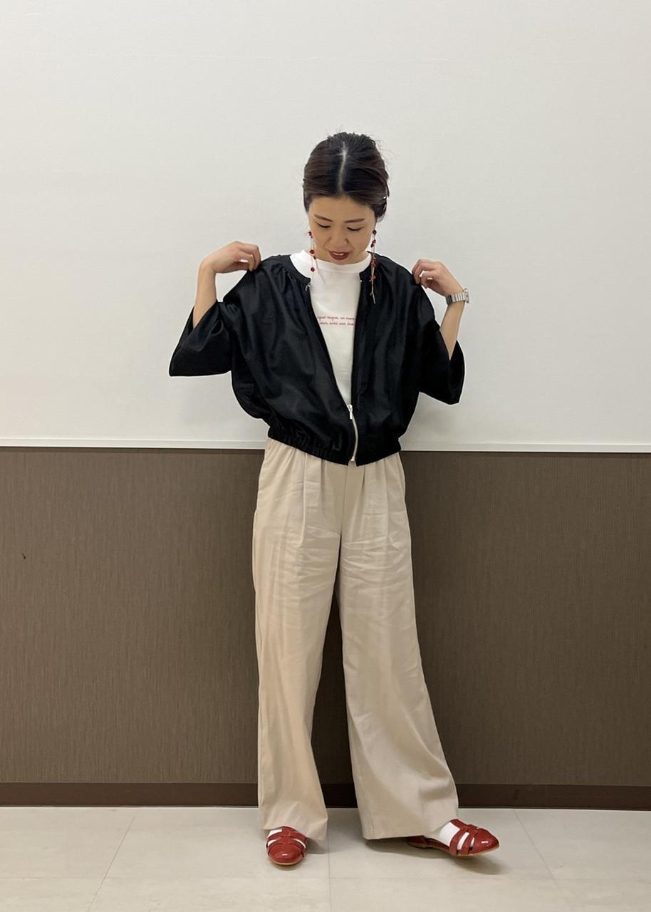 モノトーンコーデに、ポイントで赤を取り入れました。シアーのような透け感のあるブルゾンは、ブラウス感覚で羽織れるので、これから暖かくなる時期にも着回ししやすいアイテムです。
