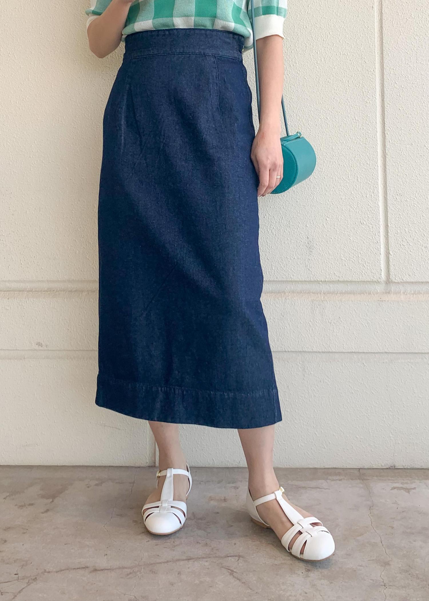 スカートは伸縮性のあるデニム生地で、ウエスト後ろのレースアップがワンポイントに。