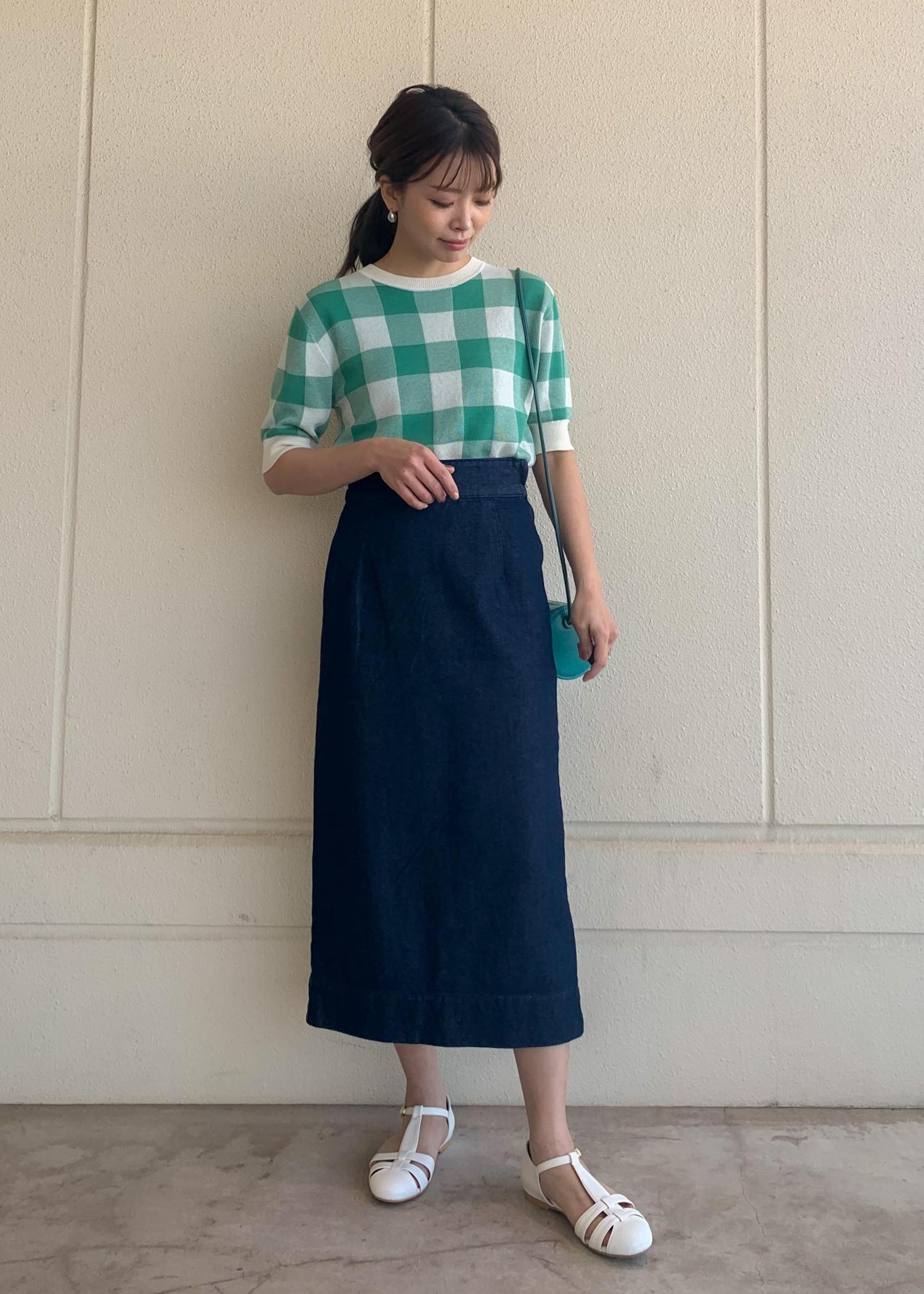 爽やかなグリーンのギンガムチェック×デニムのカジュアルコーデです。