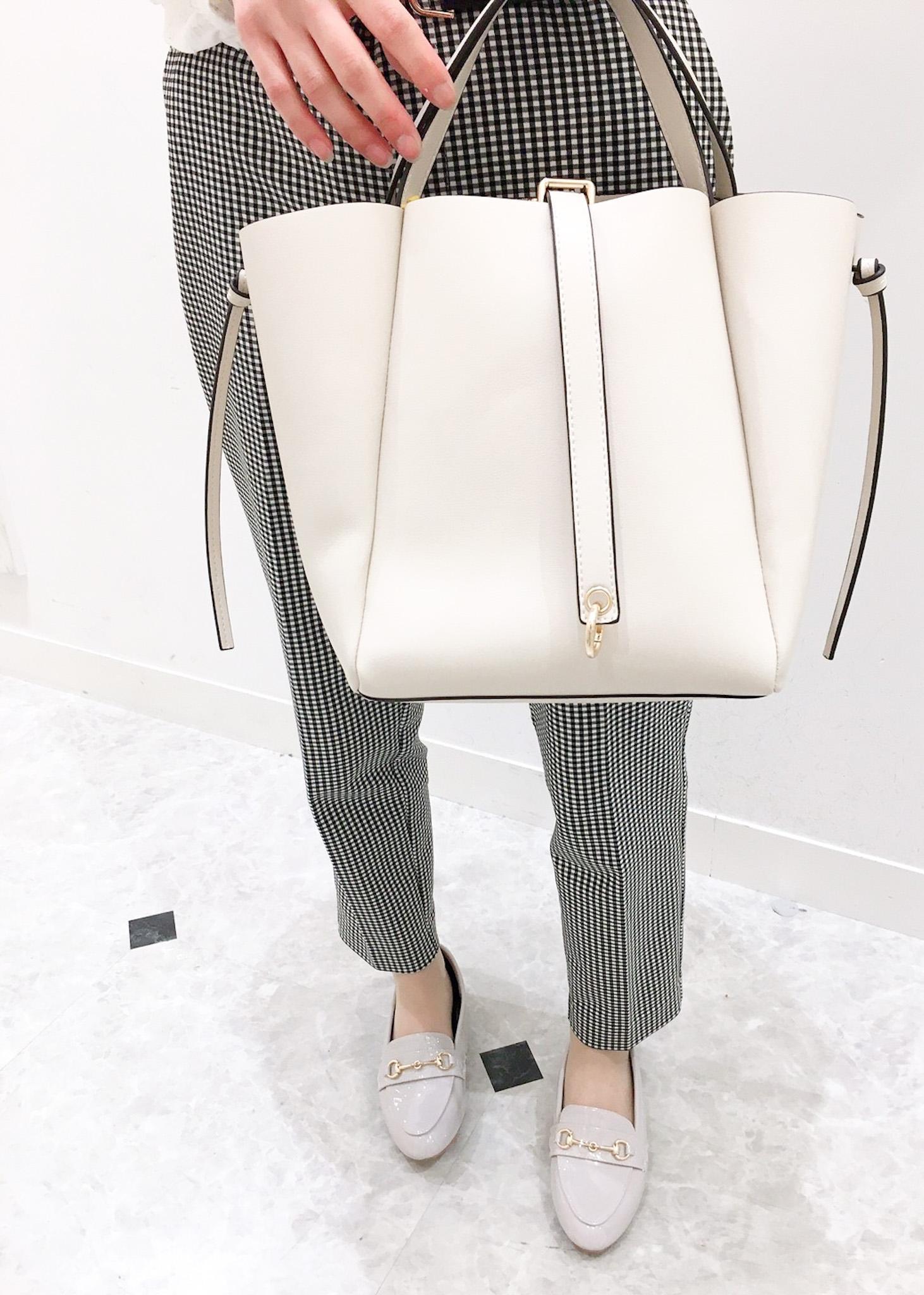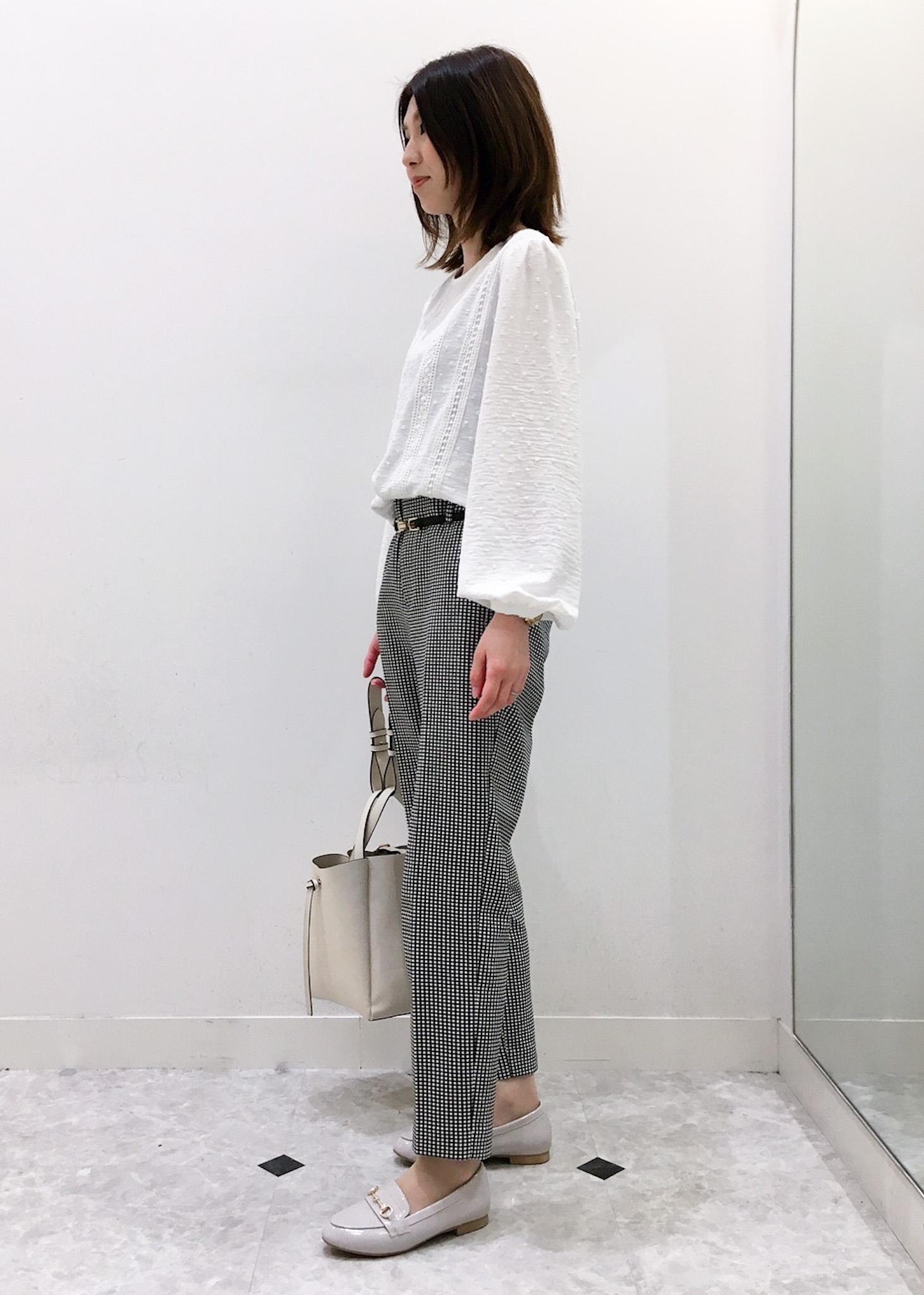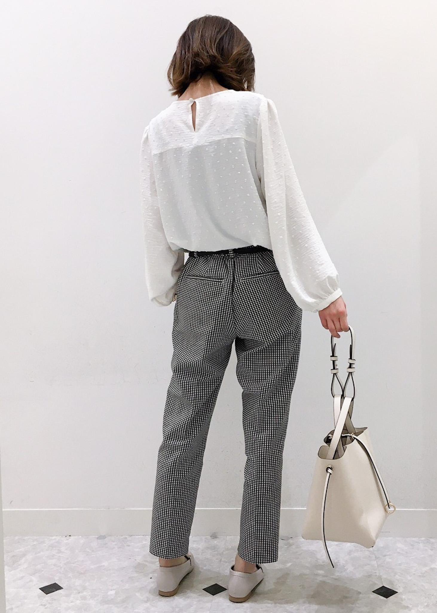 ギンガムチェックのテーパードパンツを主役にした綺麗めコーディネートです。 ギンガムチェックのパンツを引き立てるため、トップスはシンプルなレース切り替えのブラウスで合わせてみました。 シンプルなコーディネートが好きなので、色味もモノトーンでまとめました。