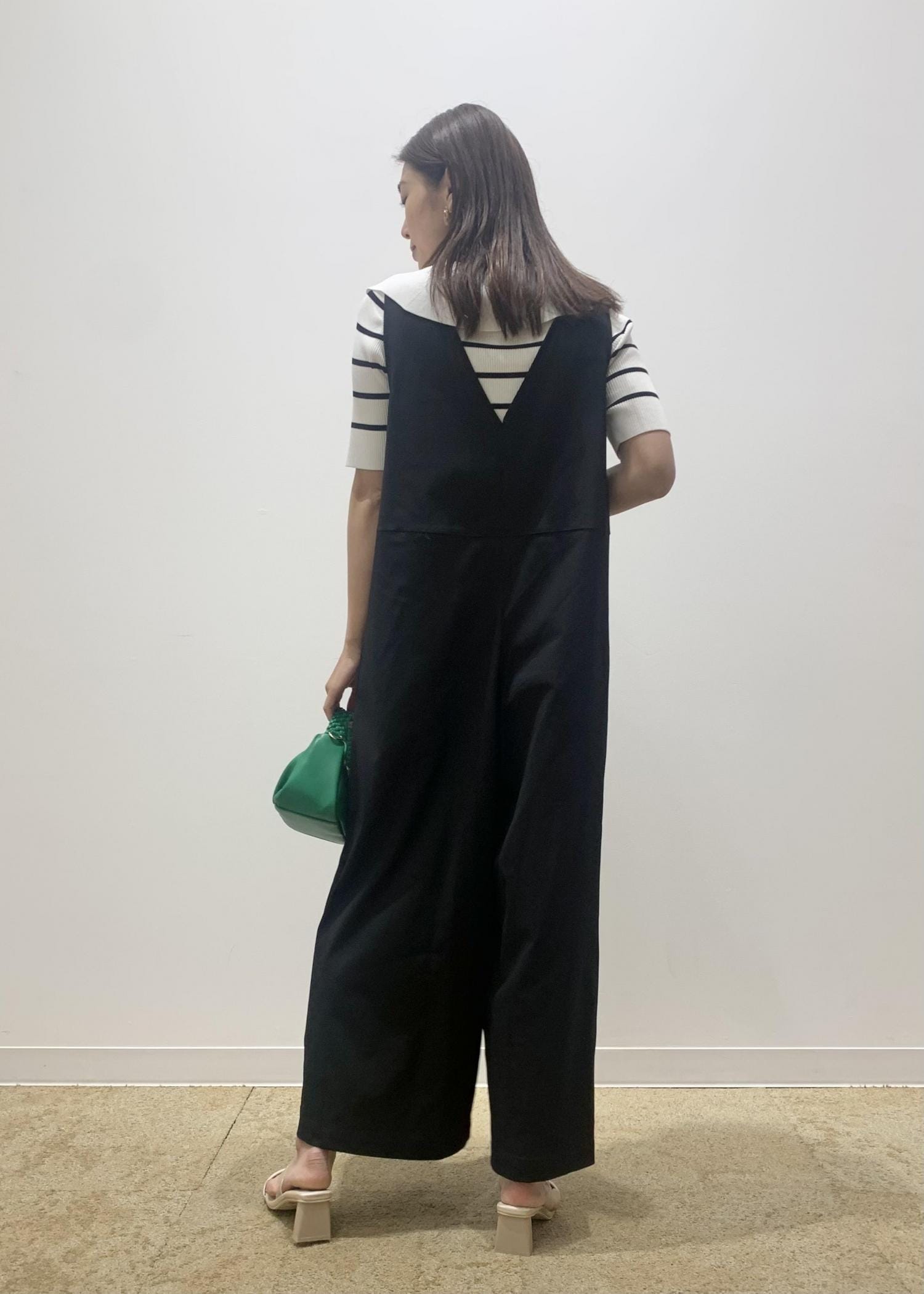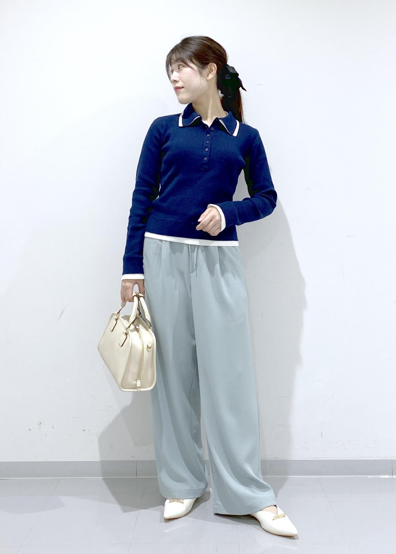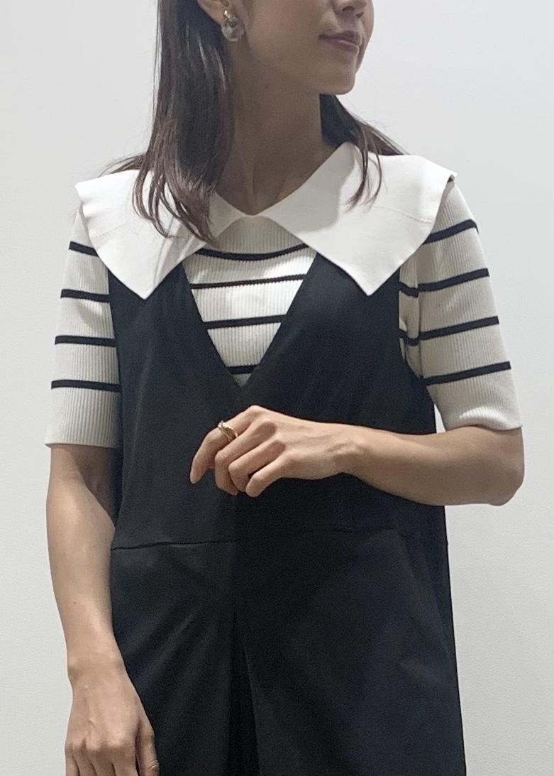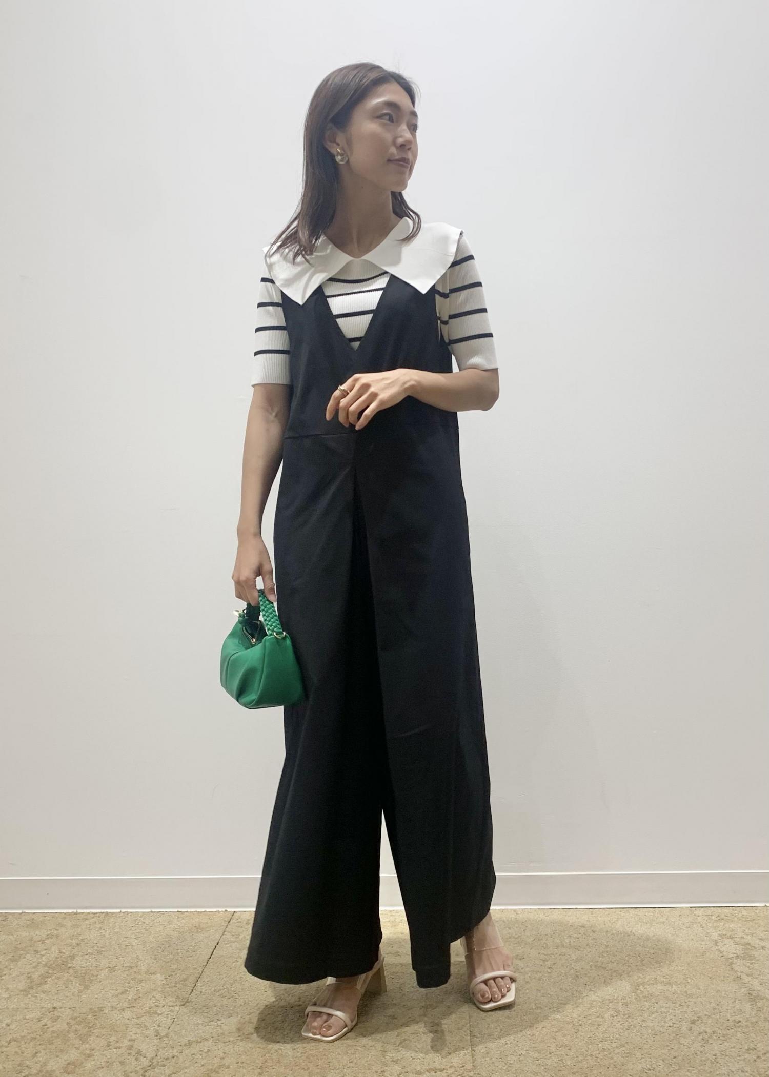 オールインワンのインナーはコンパクトトップスにすることで大人なっぽく着こなせます。 エリ付きニットで可愛らしさもプラスして、モノトーンコーデでも柔らかい印象になるようにしてみました。