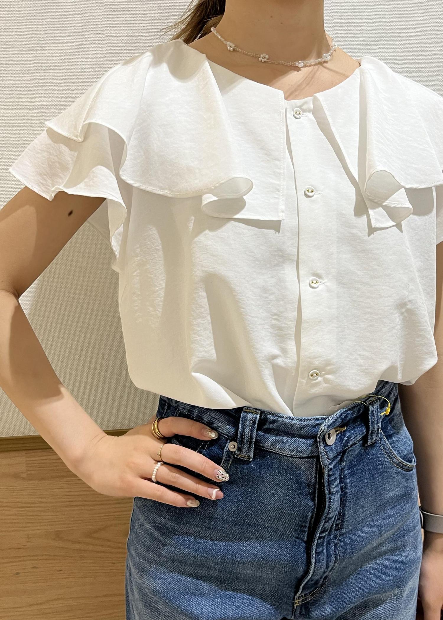 甘めのホワイトのラッフルブラウスをデニムに合わせてカジュアルコーデにしました。 ホワイトとデニムの王道の組み合わせですが、ラッフルがアクセントになり新鮮な印象になります。 足元にはクリアサンダルを持ってきて涼しい印象にしました。