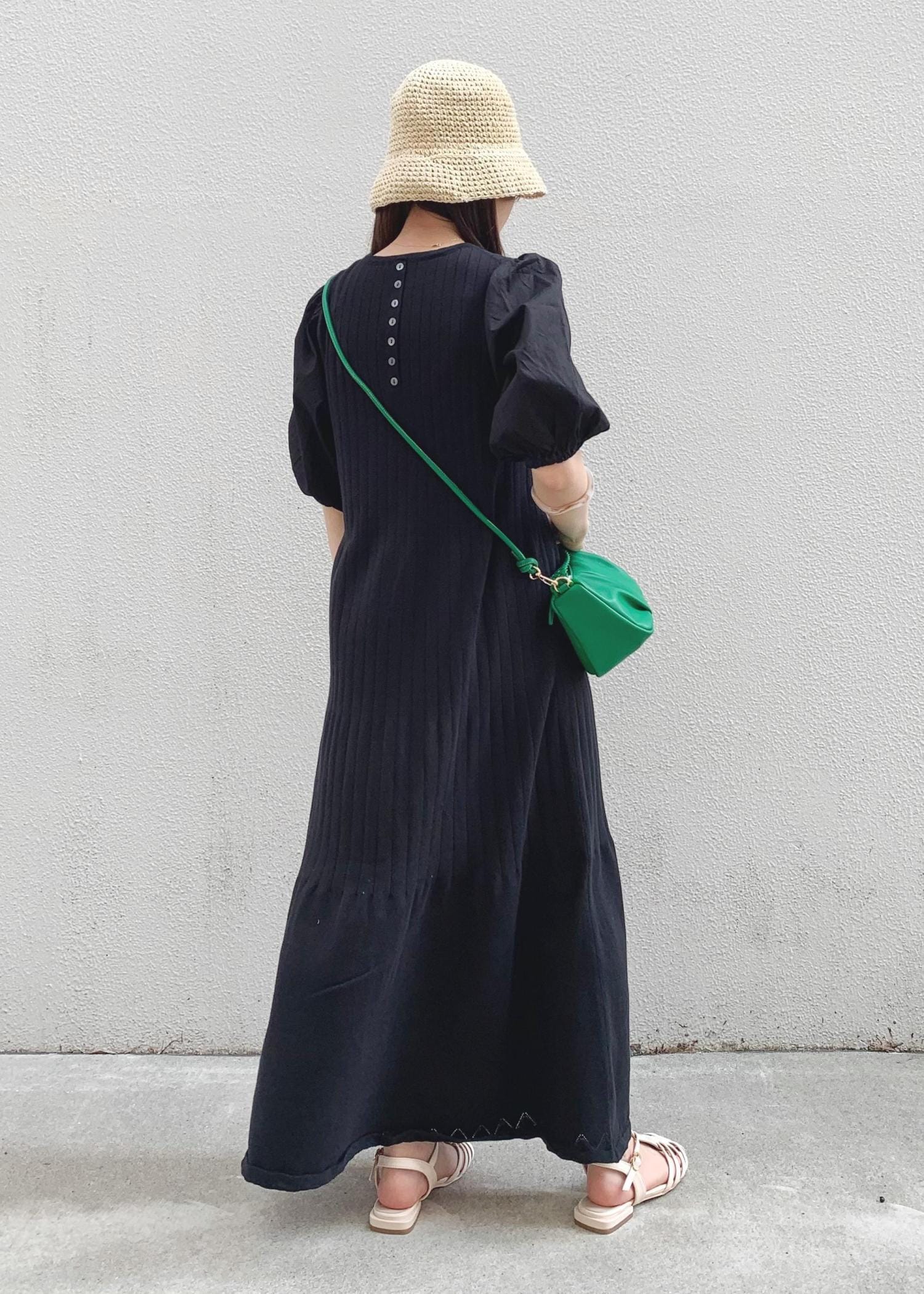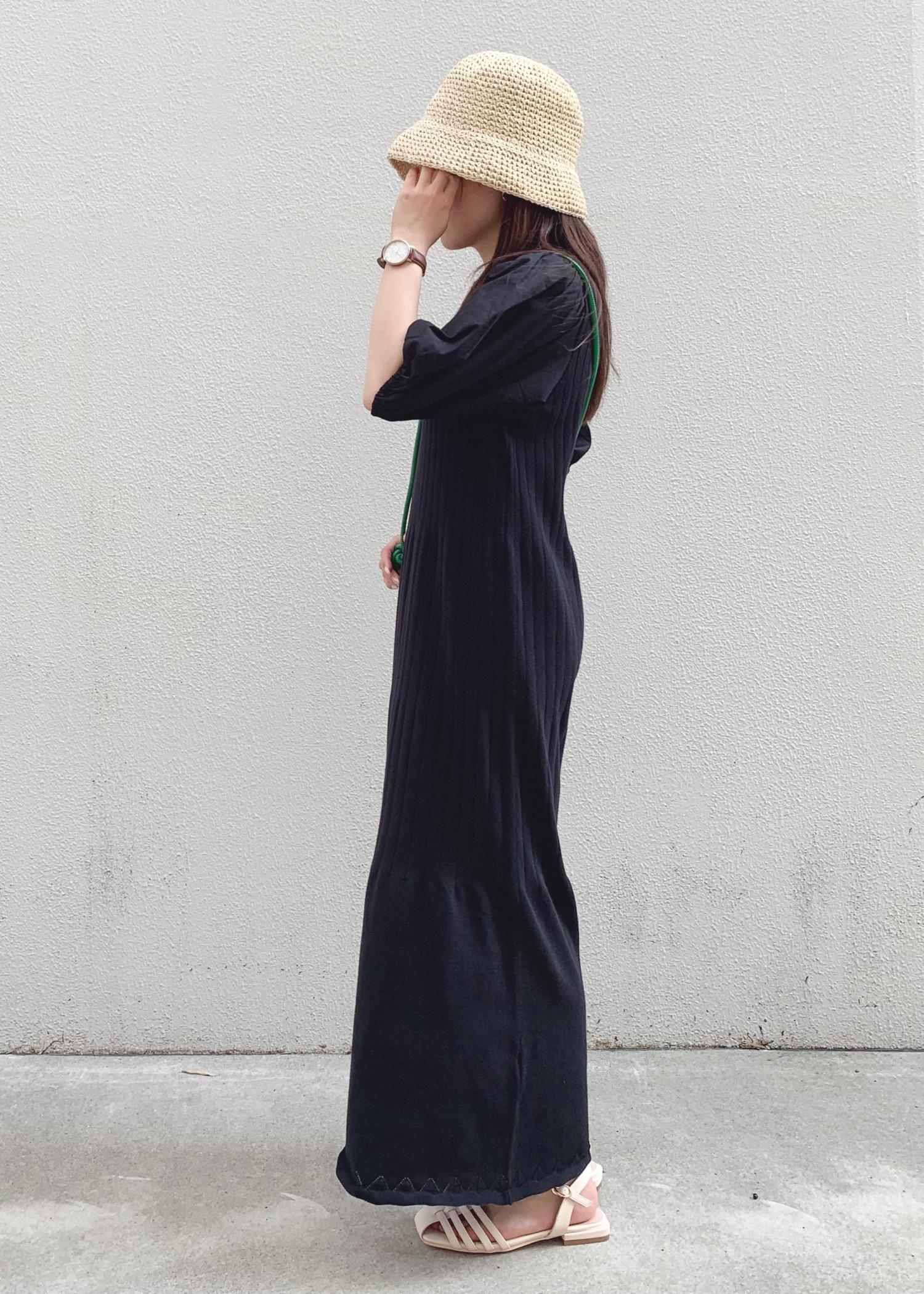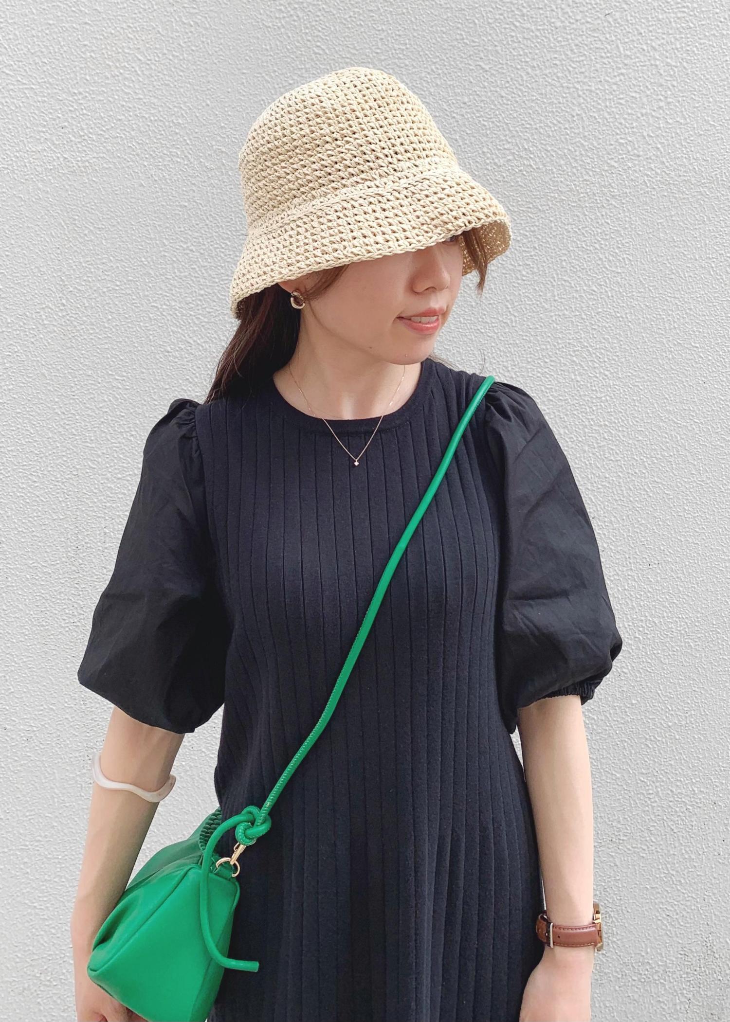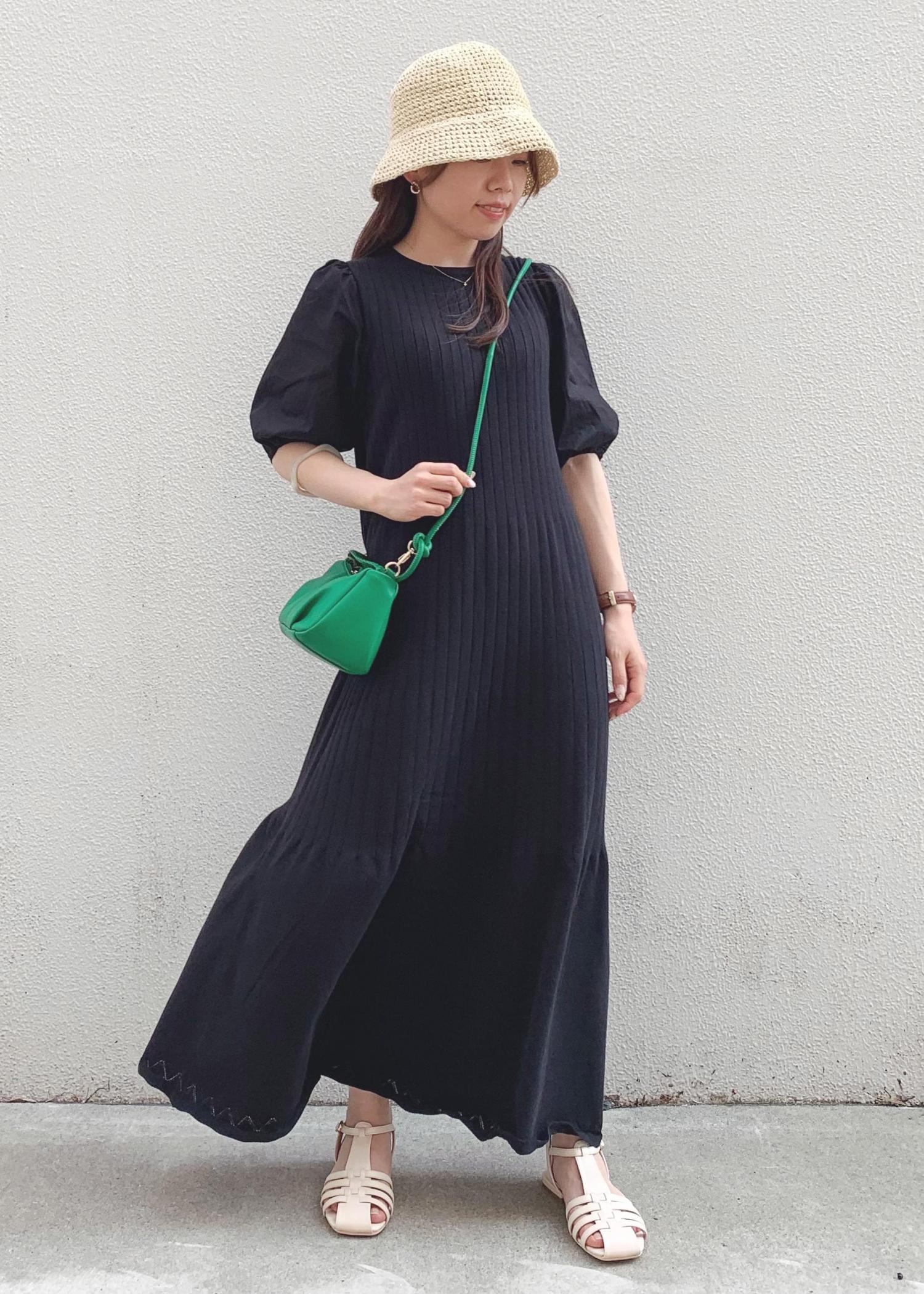 ボリュームスリーブでデザイン性のあるワンピースをメインに夏素材のバケハやサンダルを合わせて、涼しげなお出かけスタイルを意識しました。