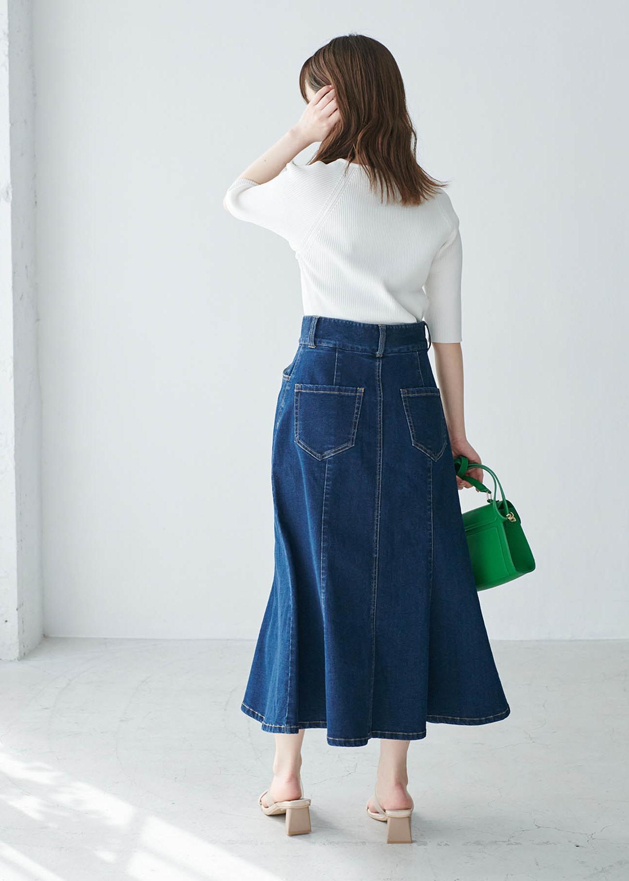 白トップスにデニムのスカートを合わせたシンプル定番コーデ。 スカートはマーメイドシルエットなので女性らしい印象になります。 グリーンのバッグをアクセントにしました。