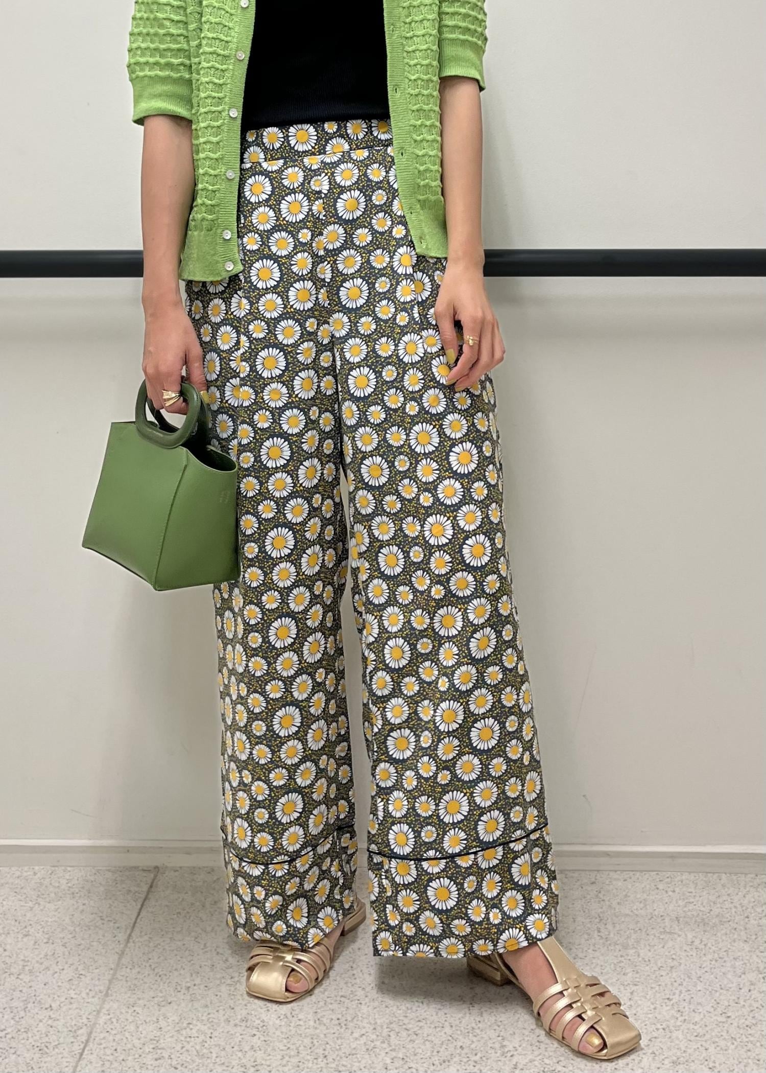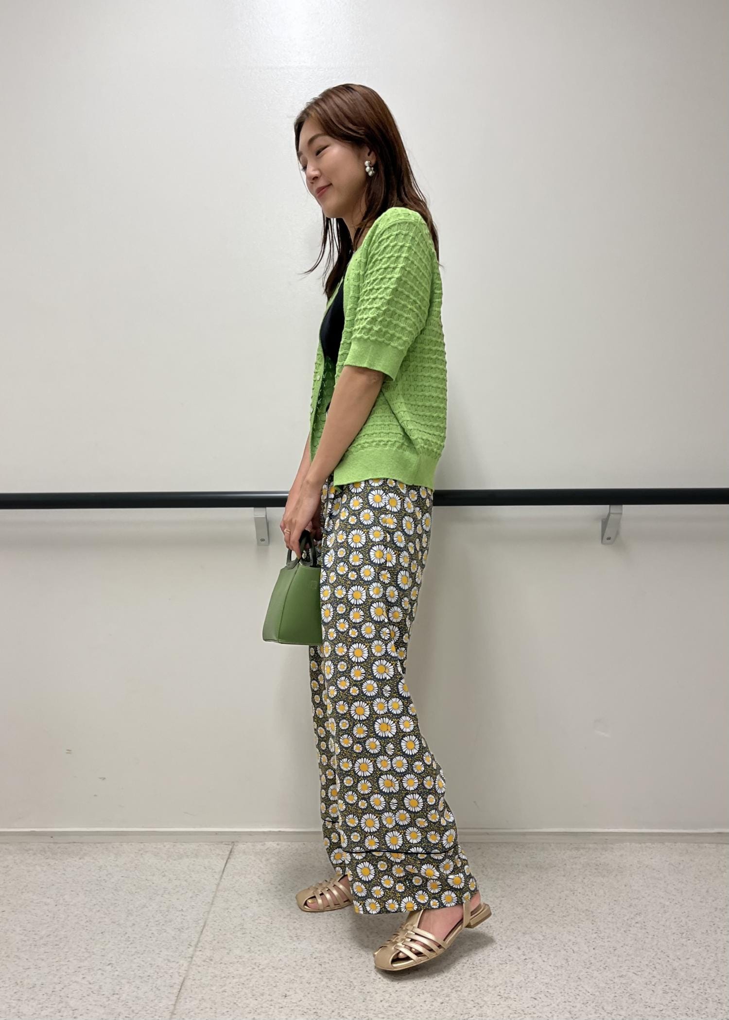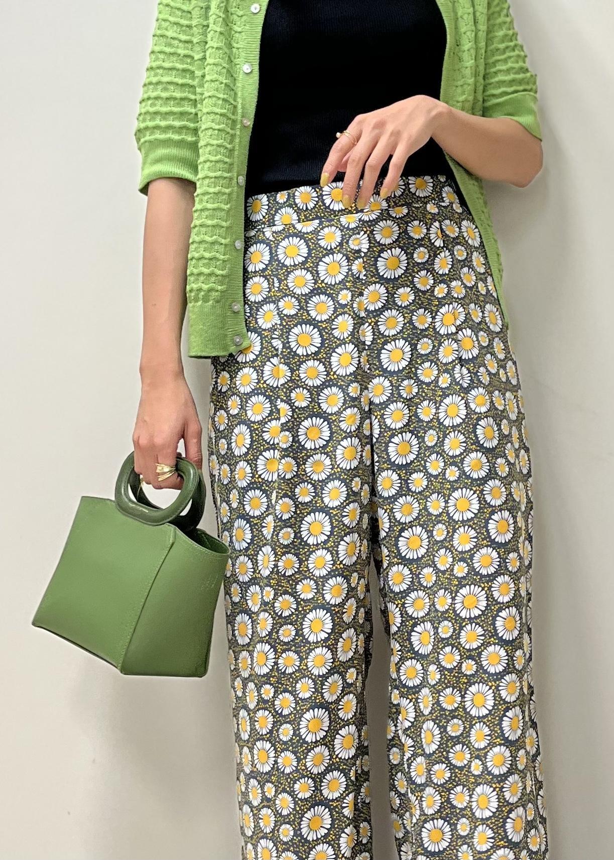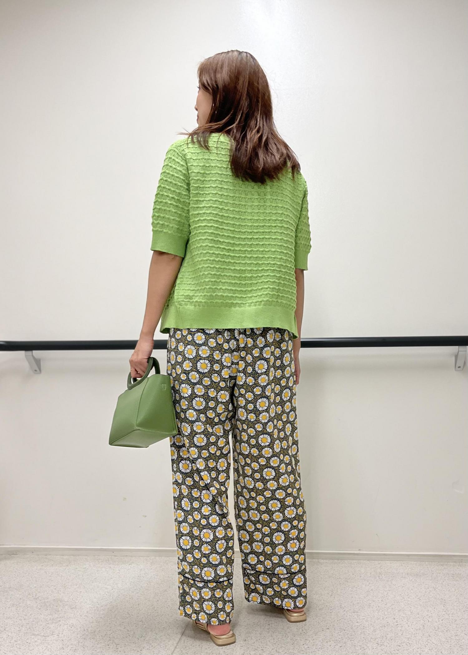 総柄パンツのため、トップスは黒や白のベーシックカラーにすると大人な印象で着用できます。