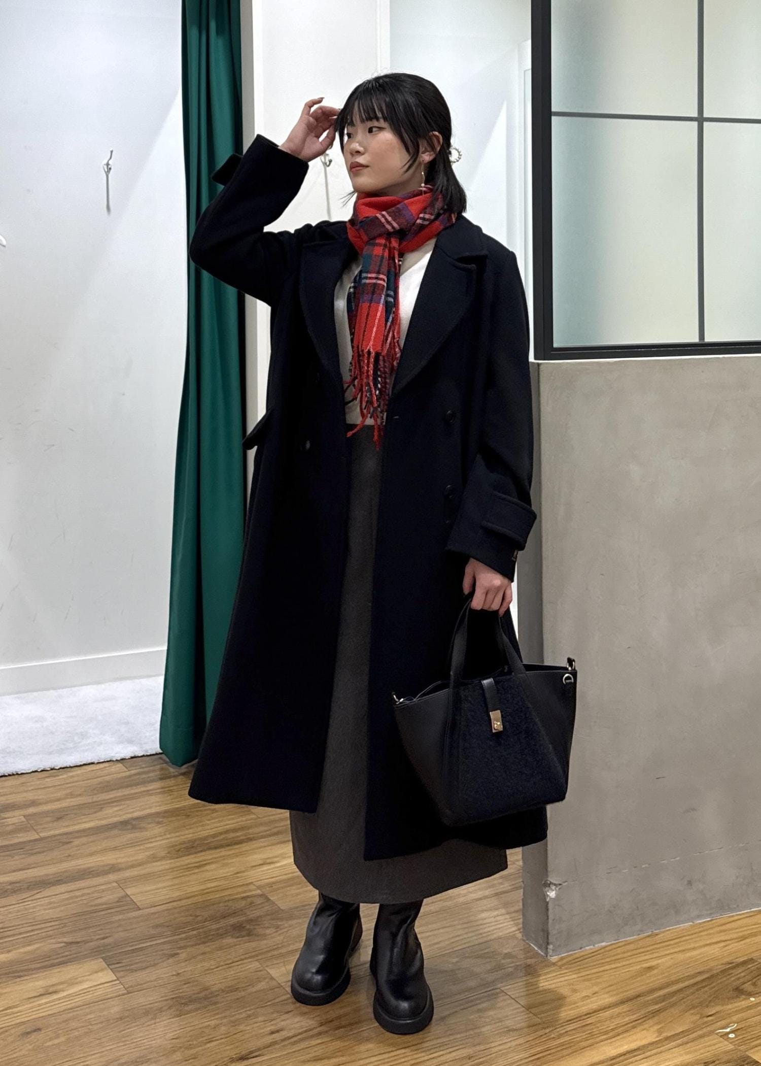 ドット柄×フリルデザインが可愛いブラウスにタイトスカートを合わせてオンオフ着回しできるキレイめコーデにしました。ドット柄ブラウスはクロを選ぶことで甘くなり過ぎずに大人っぽい印象で着用できます。小物は重くなり過ぎないように淡いカラーで合わせました。