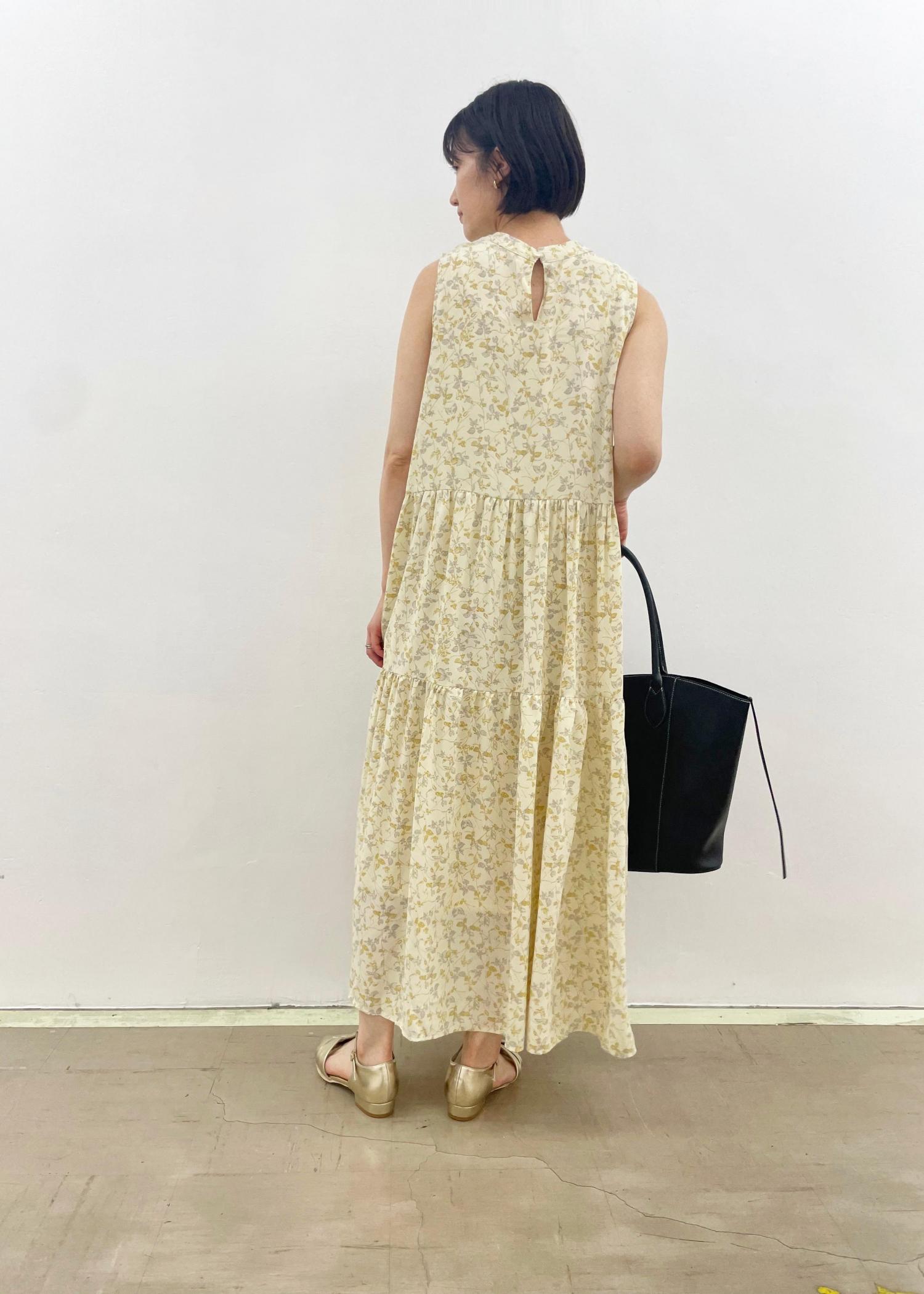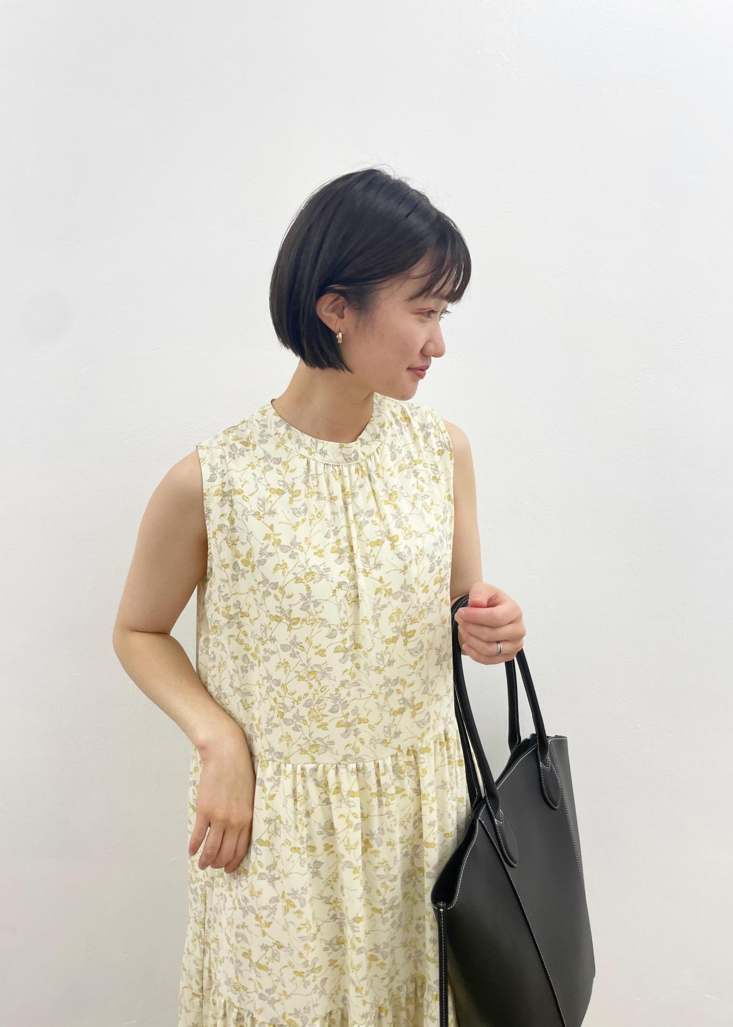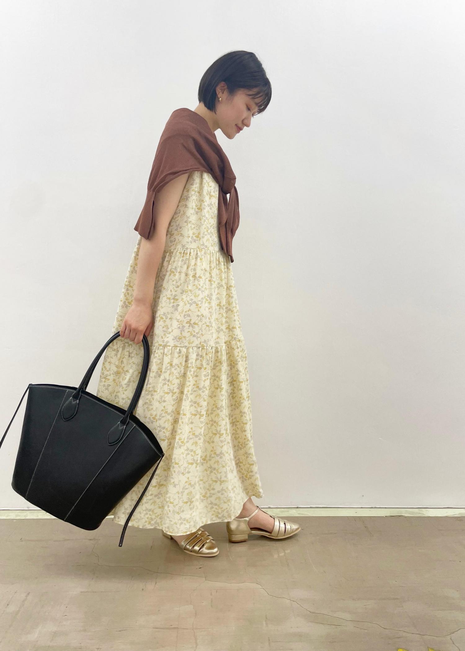 選べる着丈、ティアードノースリワンピを使った コーディネート♩ シンプルなワンピースなので、大きめバックを目立たせて。 足元はゴールドで抜けのあるコーデにしました。 温度調整やちょっとした日除け対策には シアーガーデが万能です! 薄手で持ち運びも便利ですよ。
