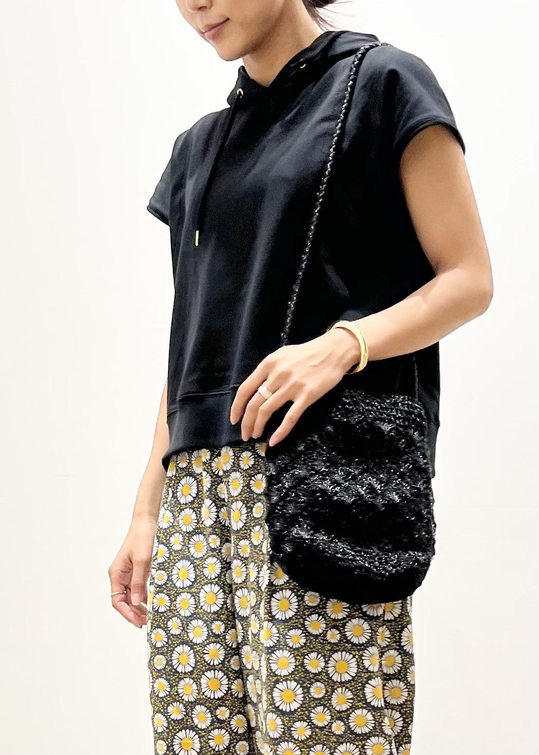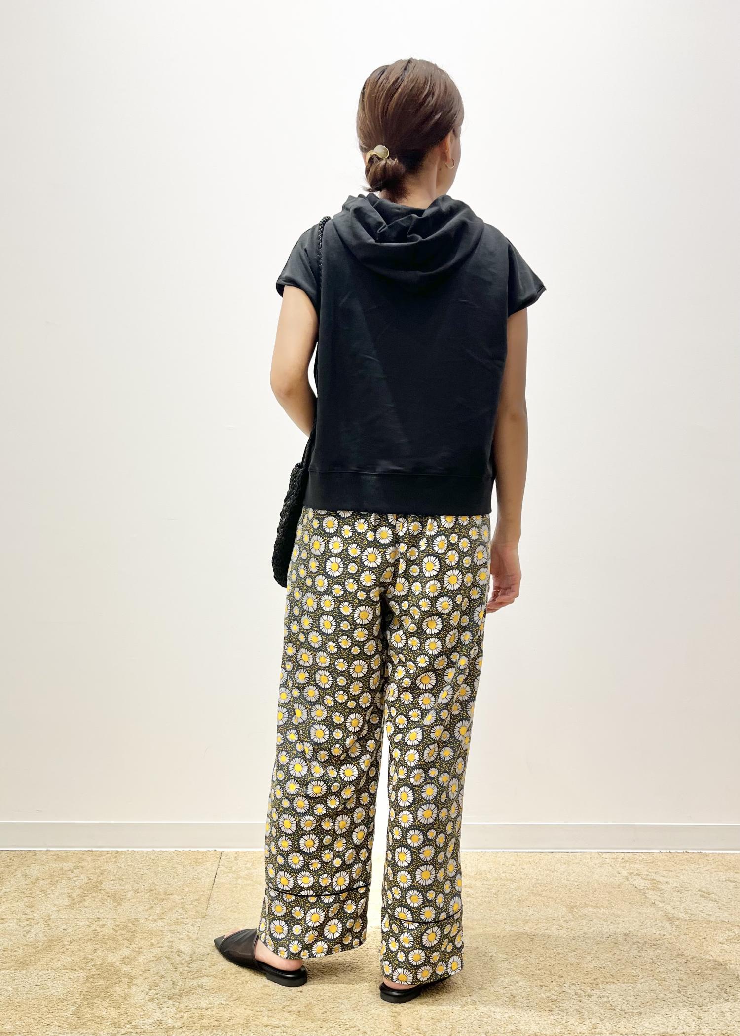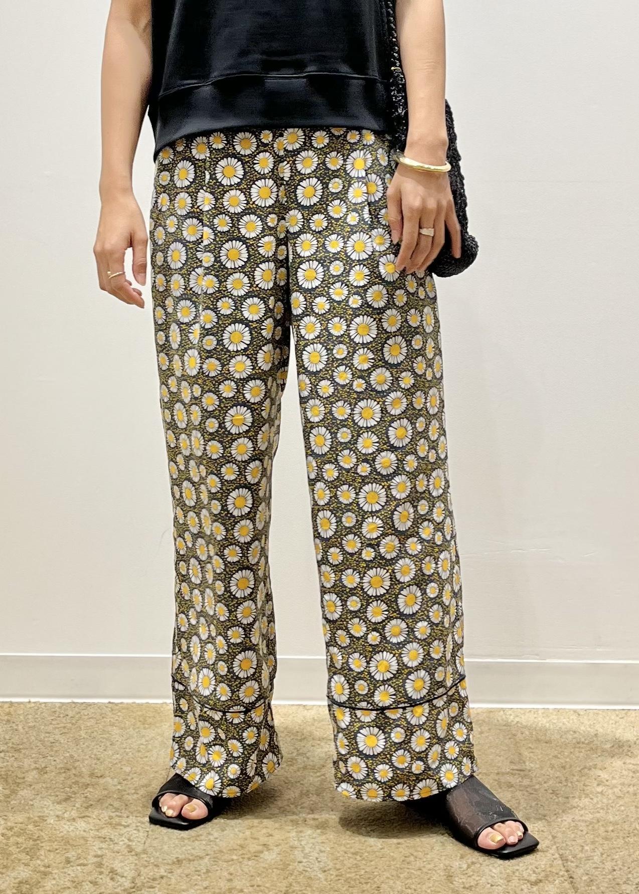 総柄パンツをポイントに他アイテムは高見えするブラックでシンプルにまとめました。