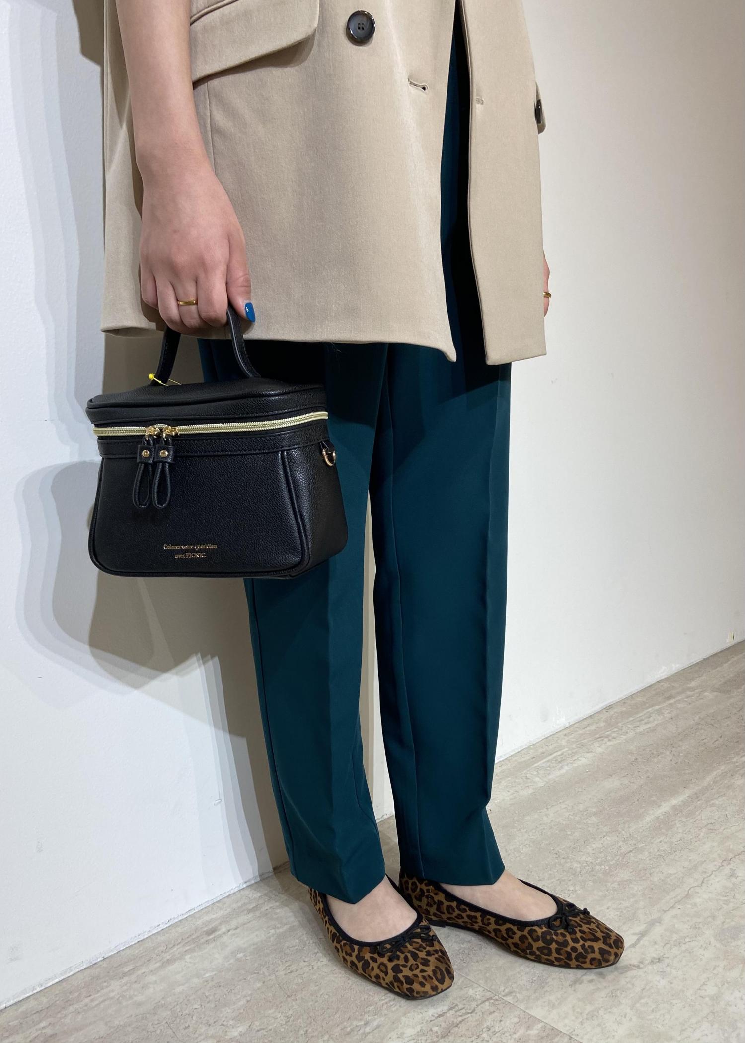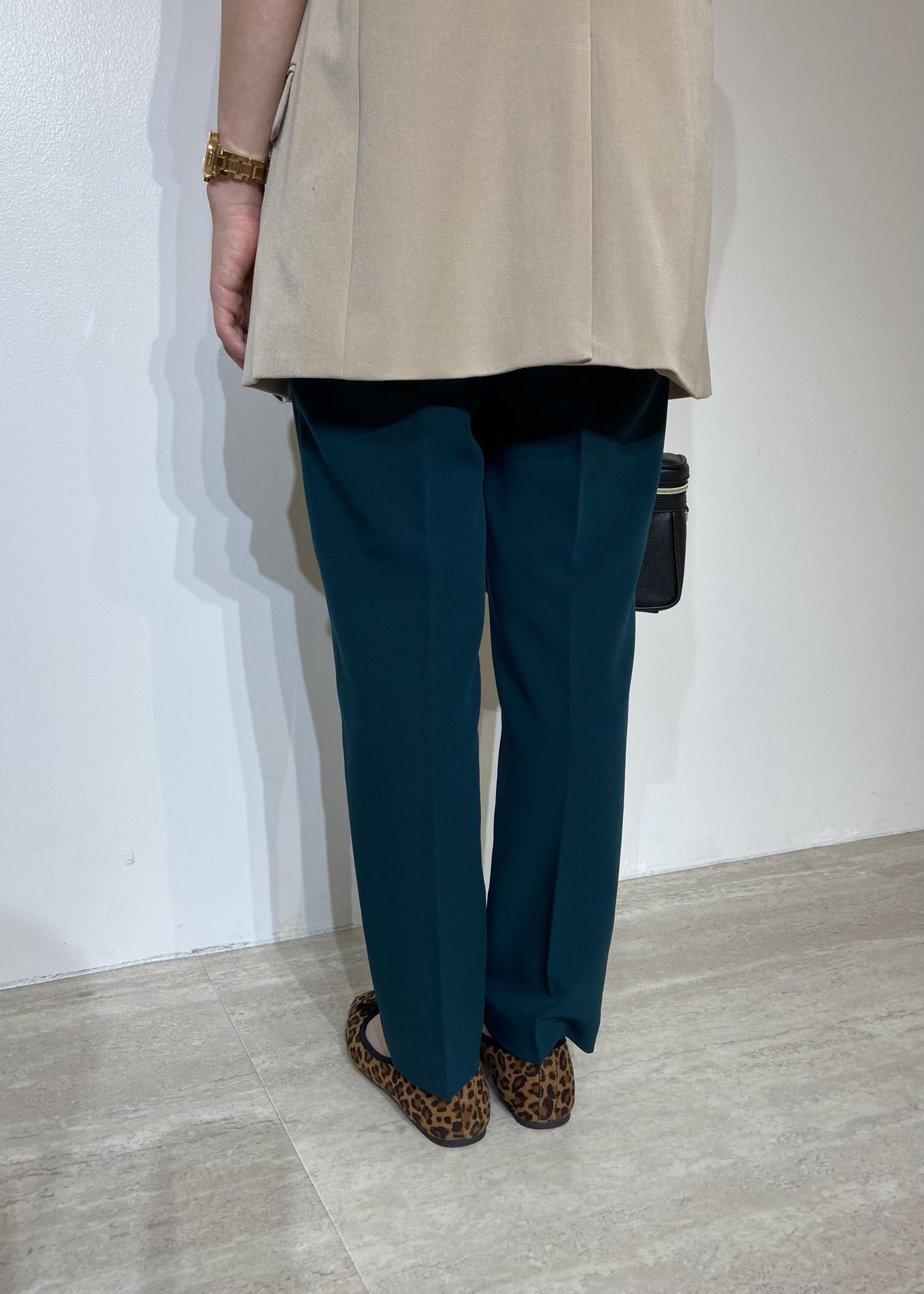 毎年人気のラク美パンツのグリーンにジレを合わせた秋のお出かけスタイルです。
