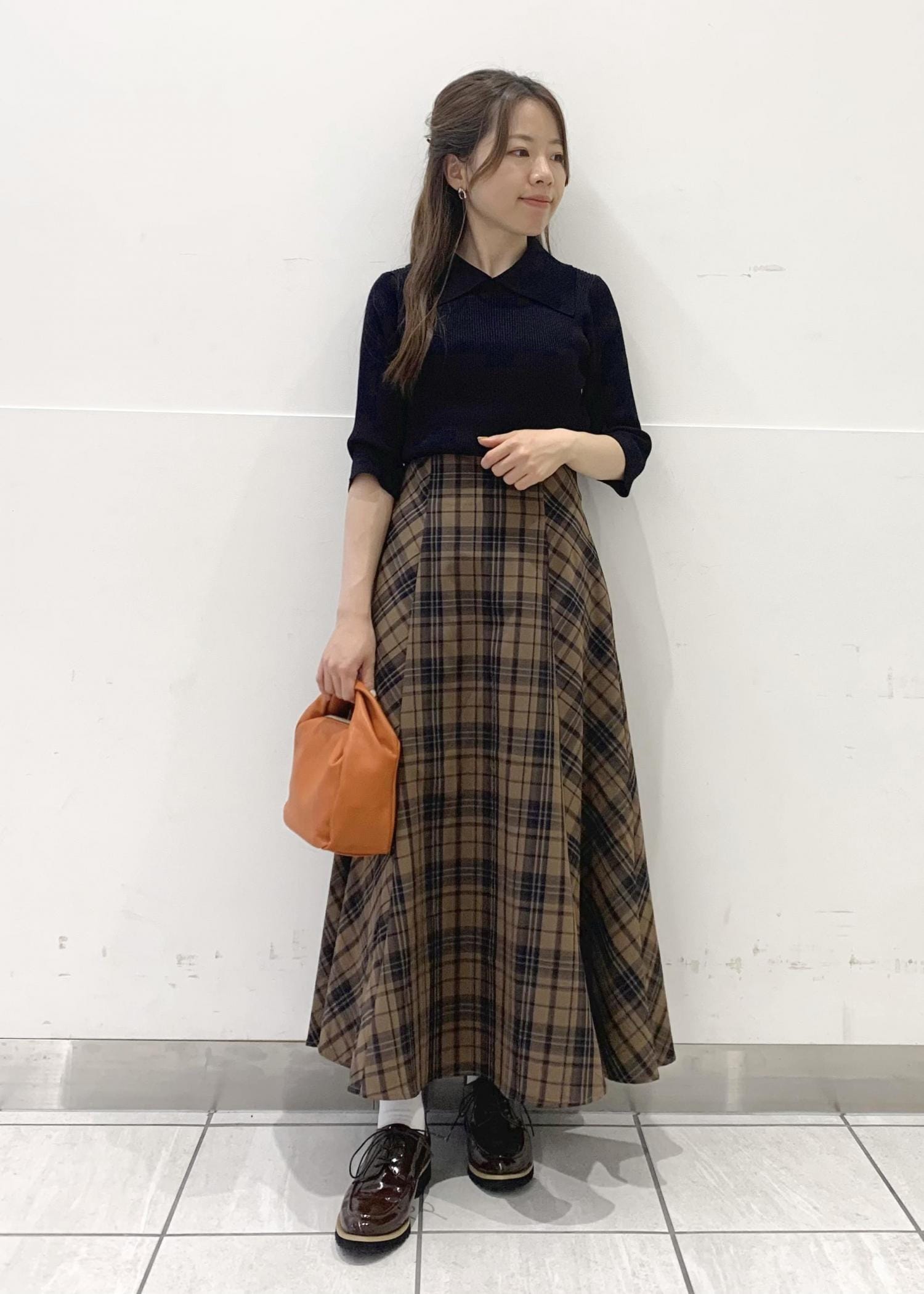 衿付きのトップスにチェックスカートを合わせた秋らしいトラッドスタイルです!
