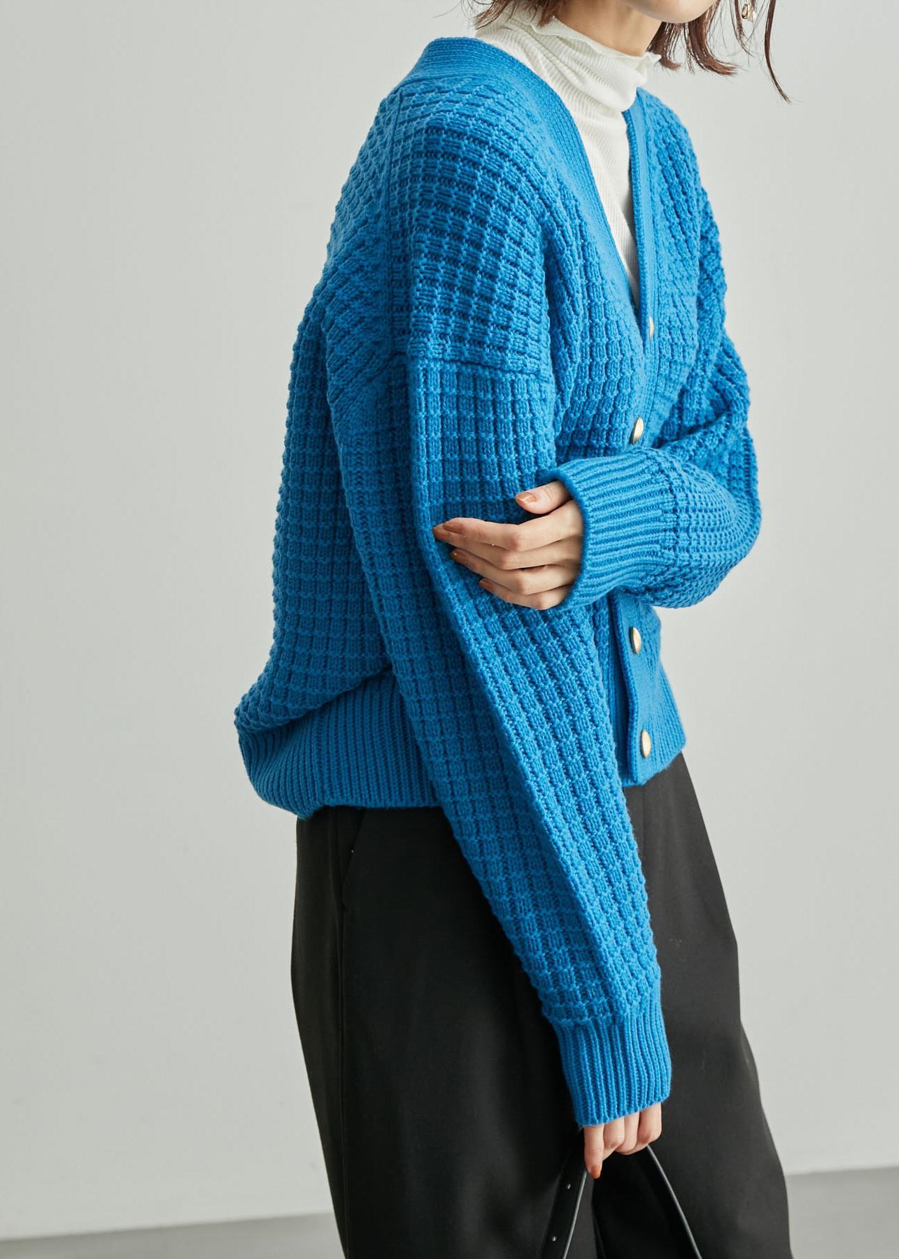 立体感のある編地が可愛らしいVネックカーデはブルーがトレンド!