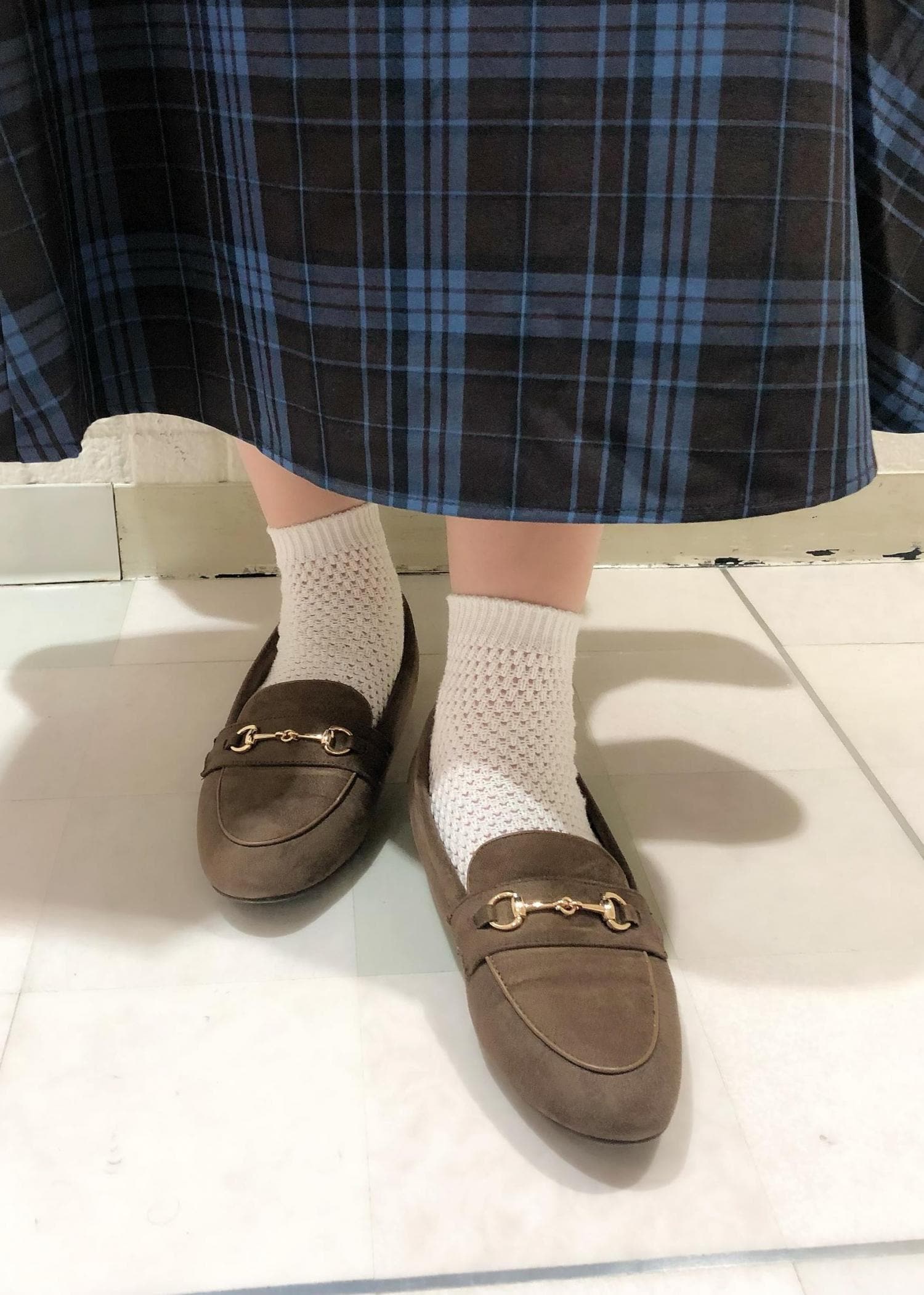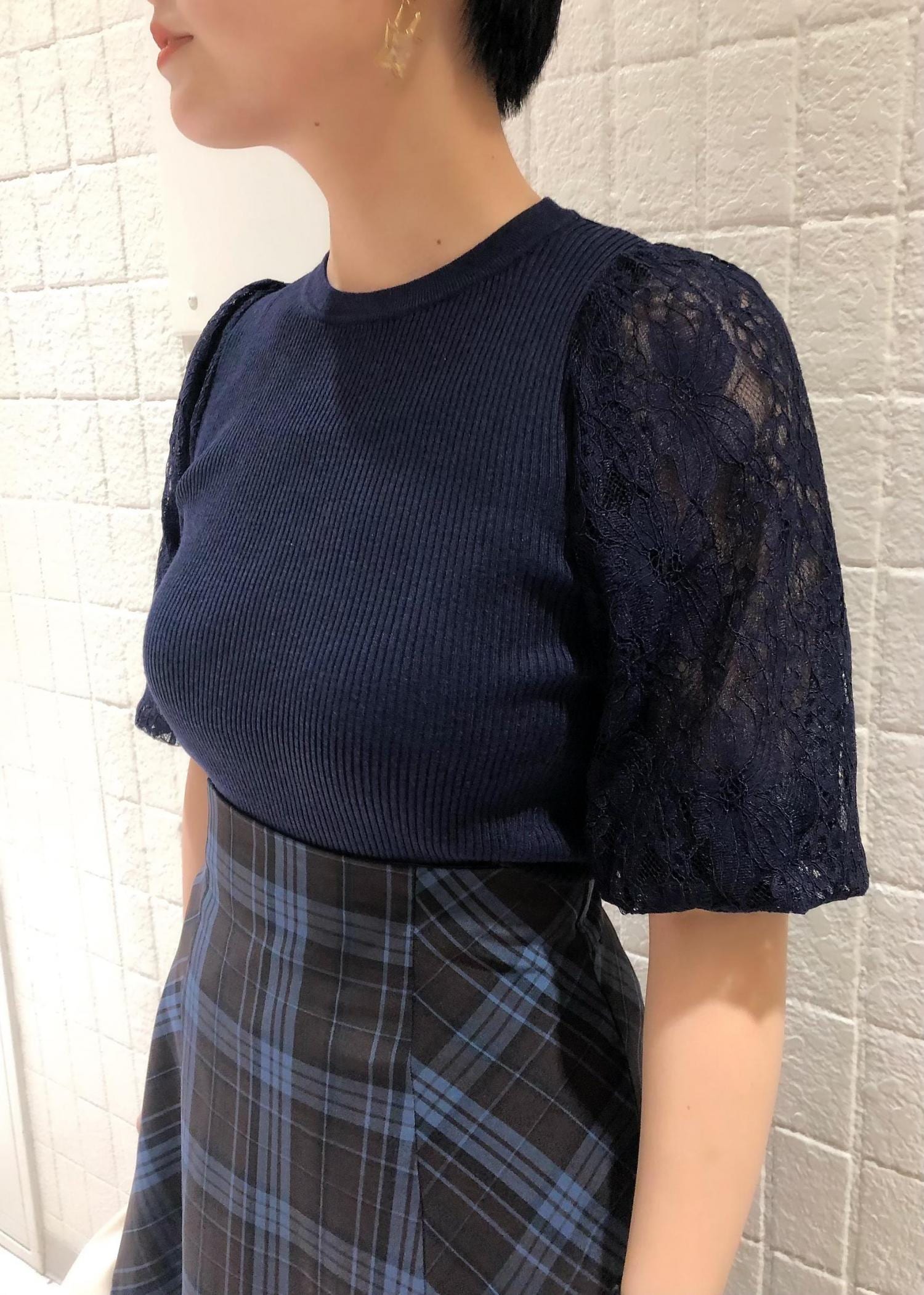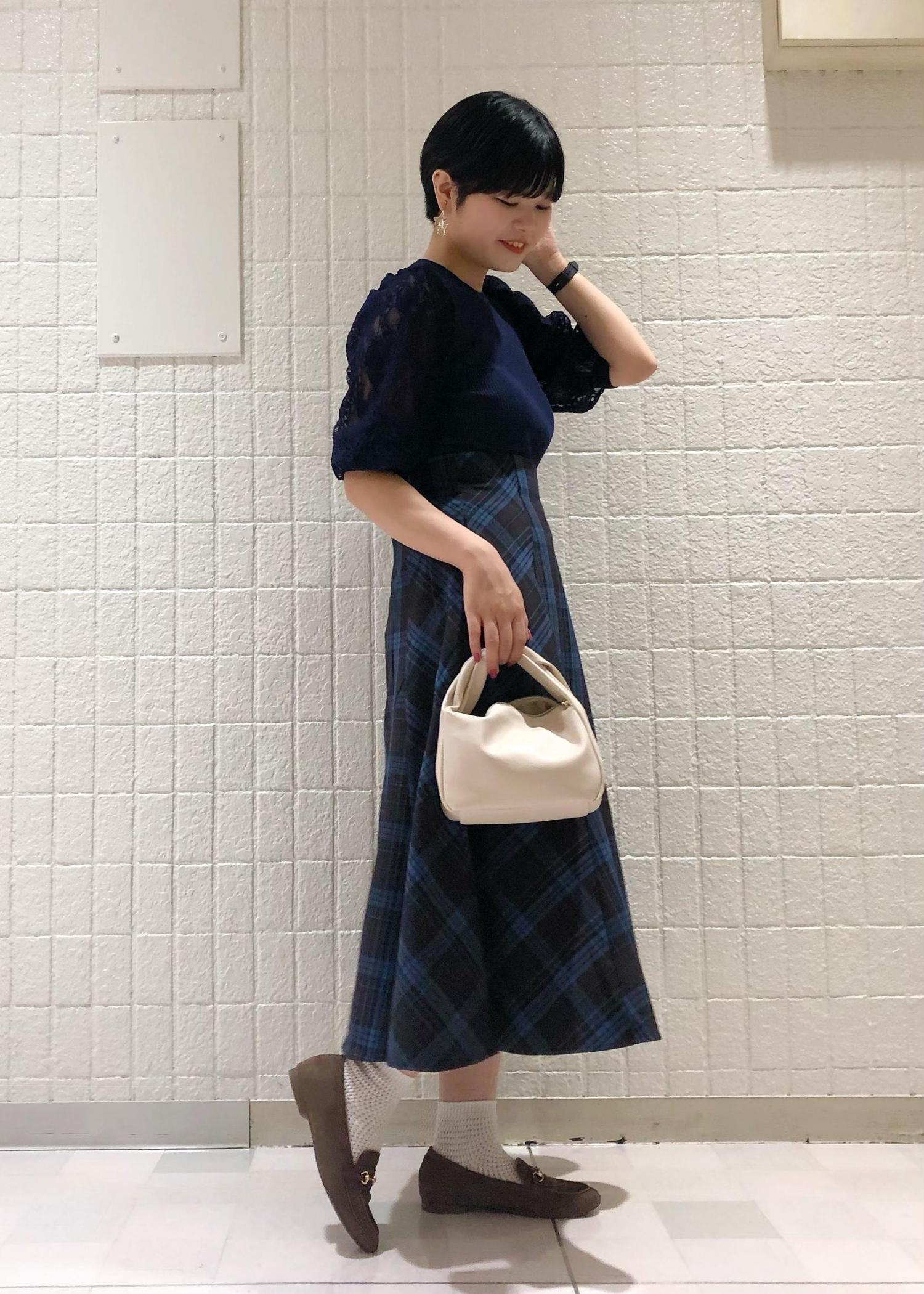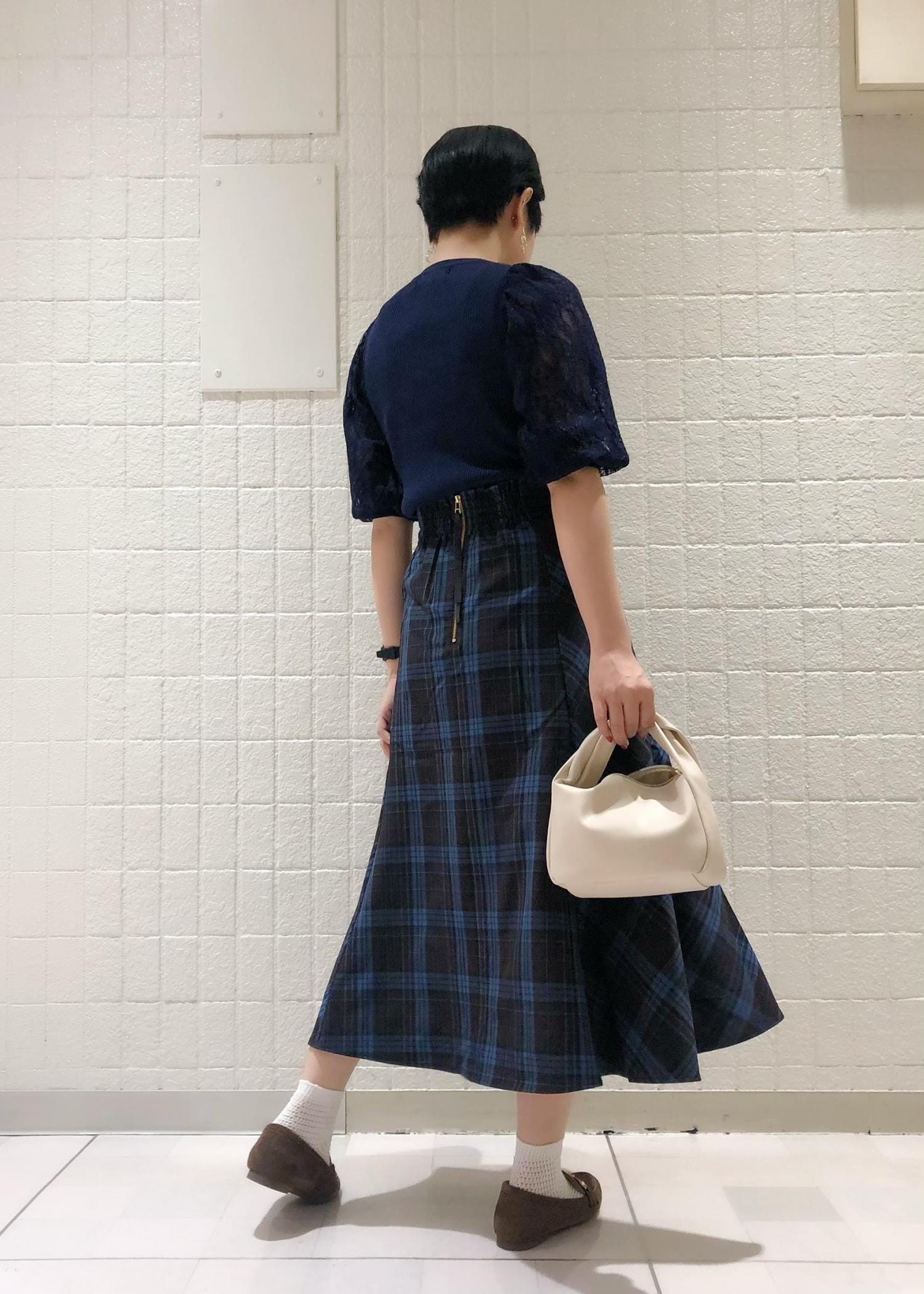 またチェック柄は1枚で華やかな印象になりますが、トップスでレースアイテムを組み合わせることで女性らしい、フェミニンさも+しました◎
