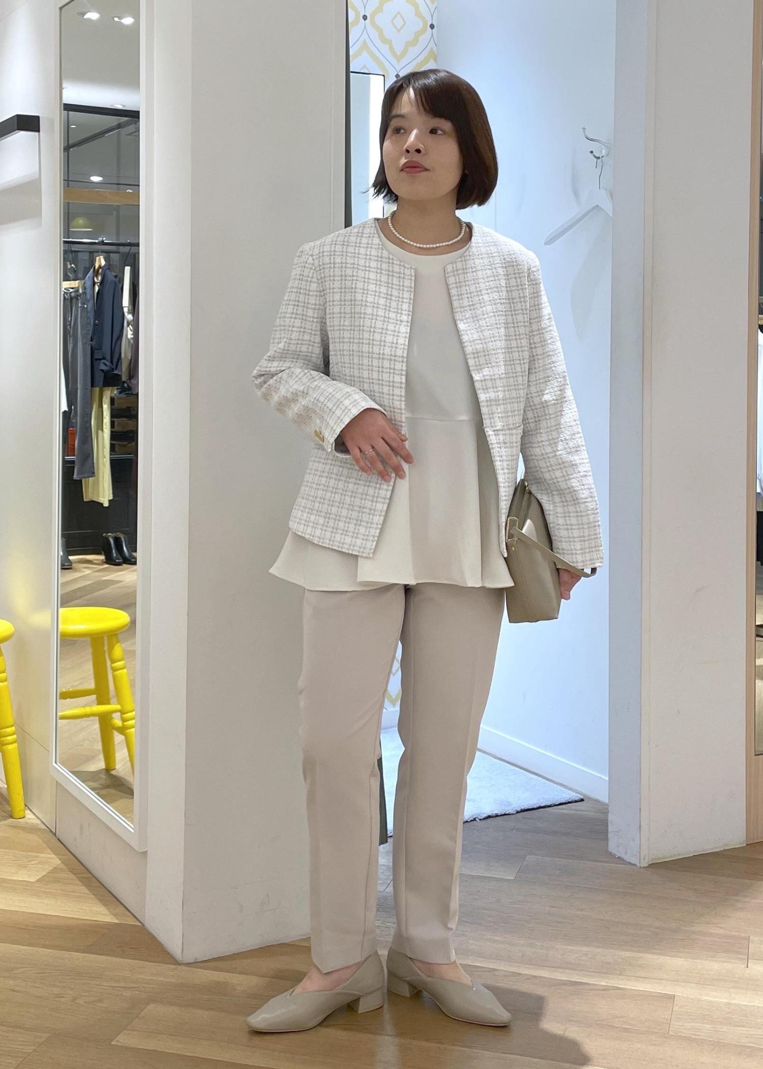 パープルのニットにグリーンとブラックのチェックスカートという深みあるカラー合わせだったので、ジャケットは軽さの出るベージュをチョイスしました!