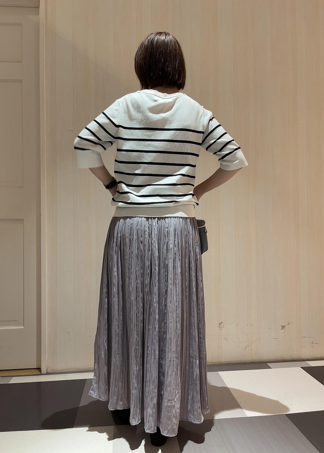 (スカートは、着丈が短い36サイズのお作りに比べて、16.5cm 着丈が長い38サイズを着用しています)