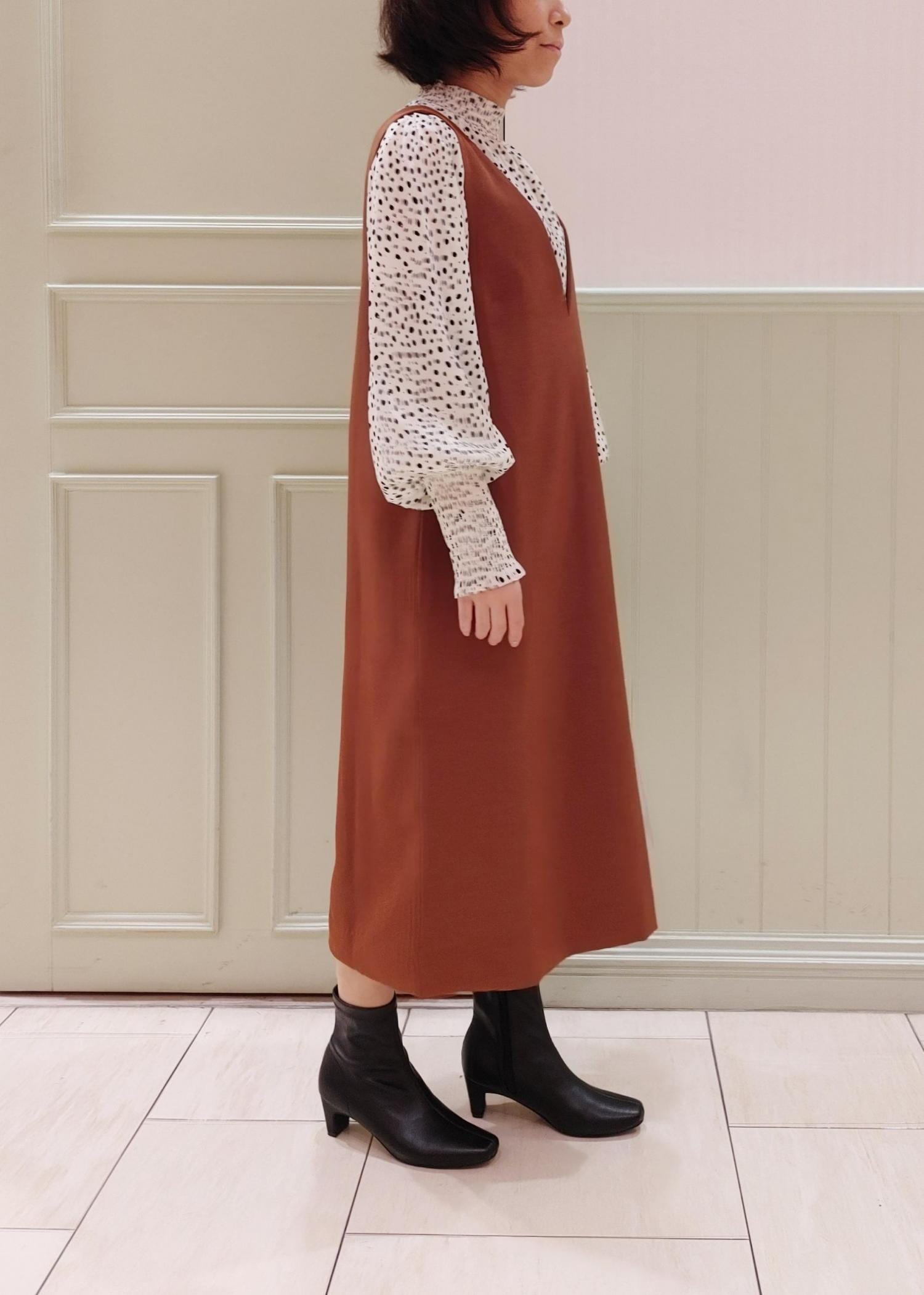 秋カラーのジャンパースカートに柄ブラウスを合わせて華やかな印象にしました。一枚あると着回し抜群です!