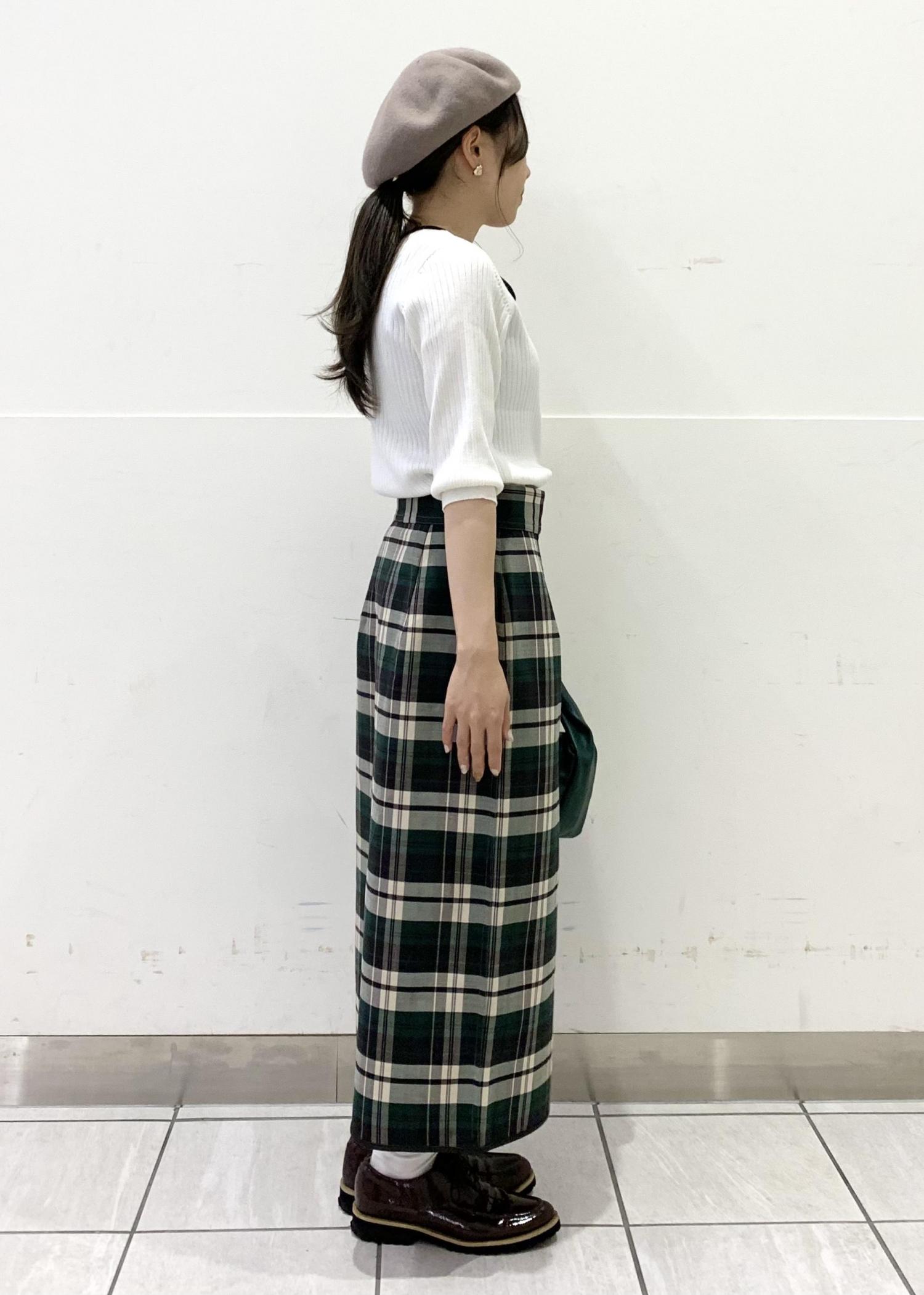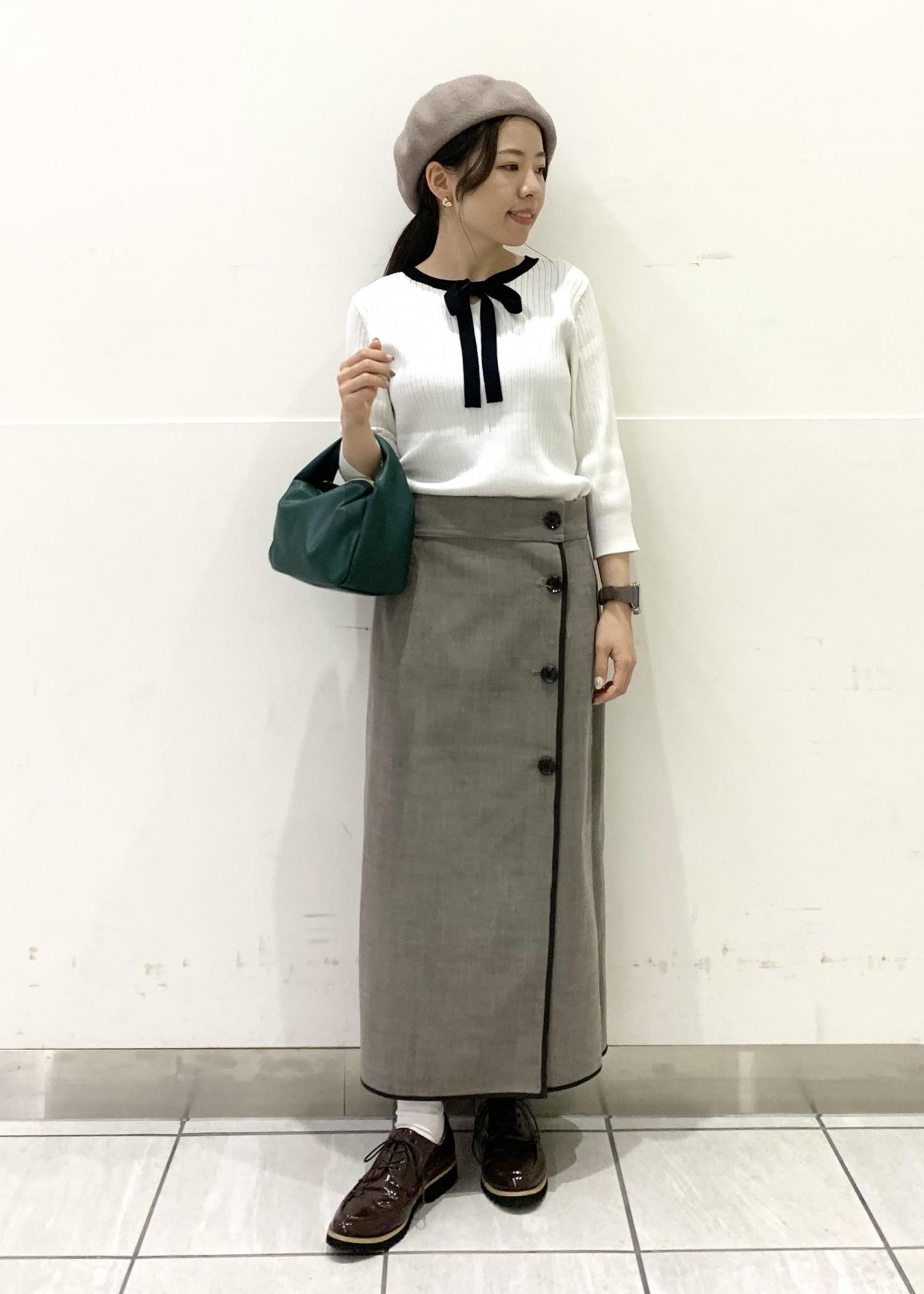 スカートとバッグの色をリンクさせて統一感を出しました。
