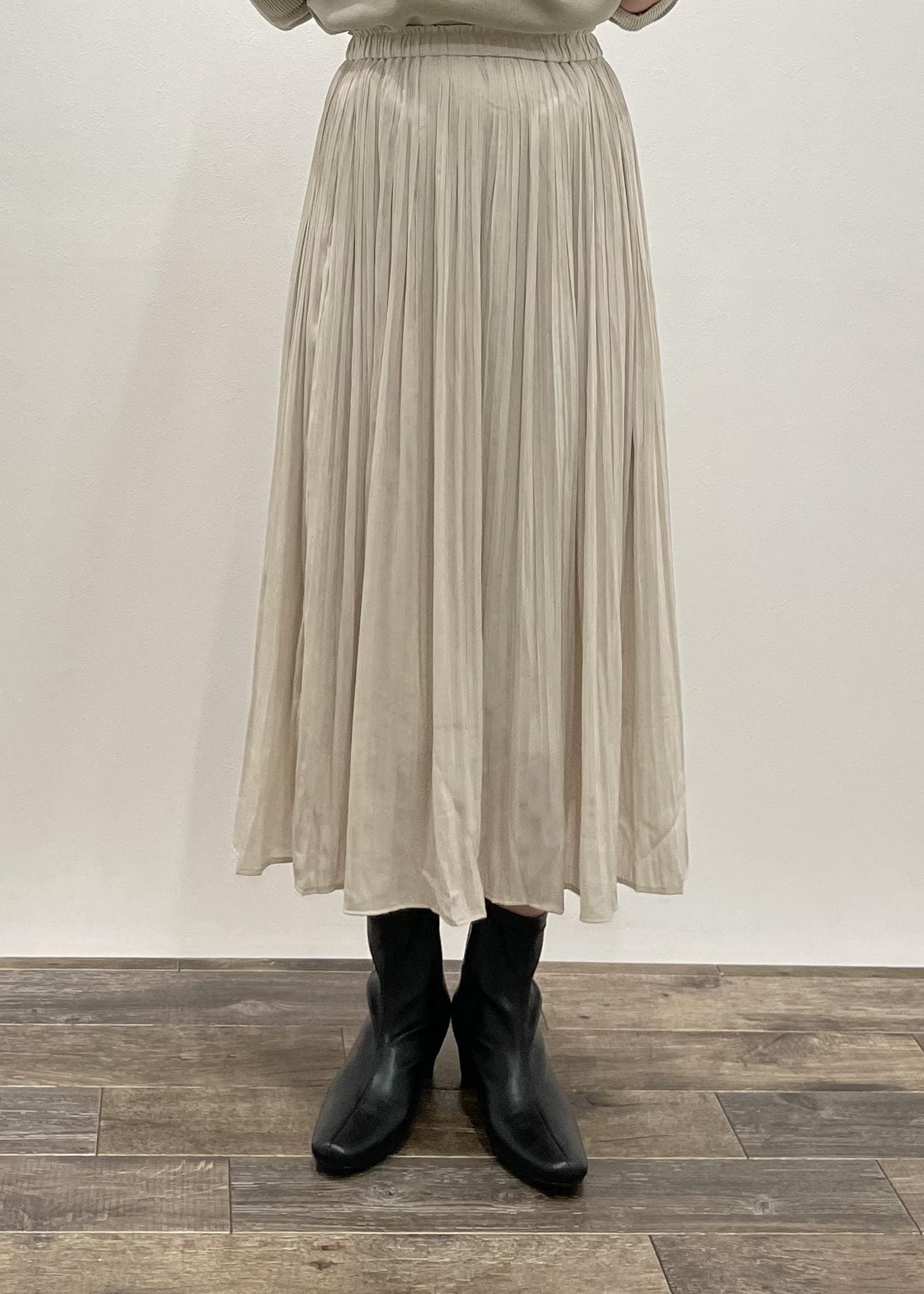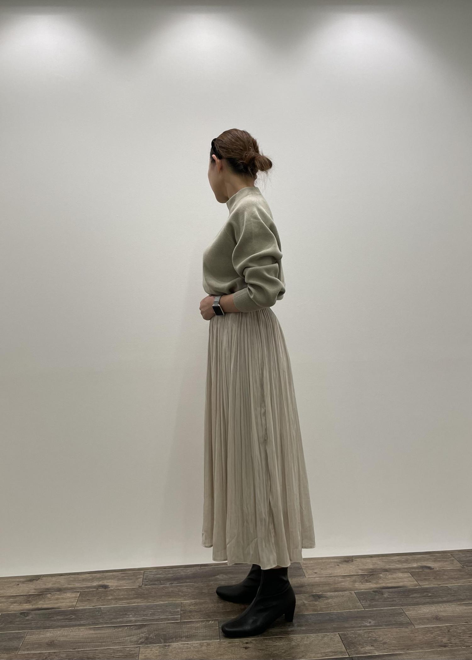 通年使えるプリーツスカートを使ったコーデです。柔らかいトーンでまとめてみました。