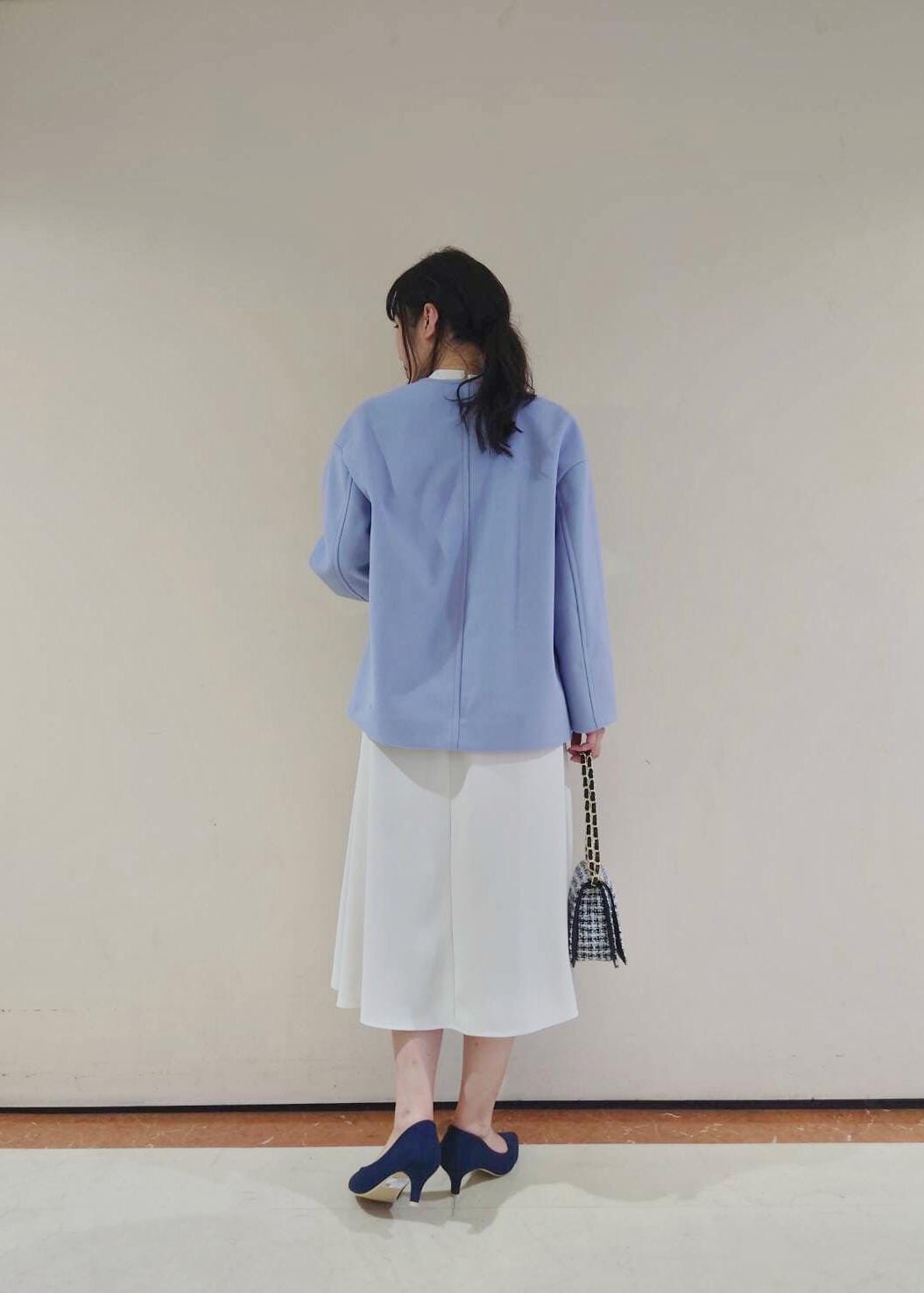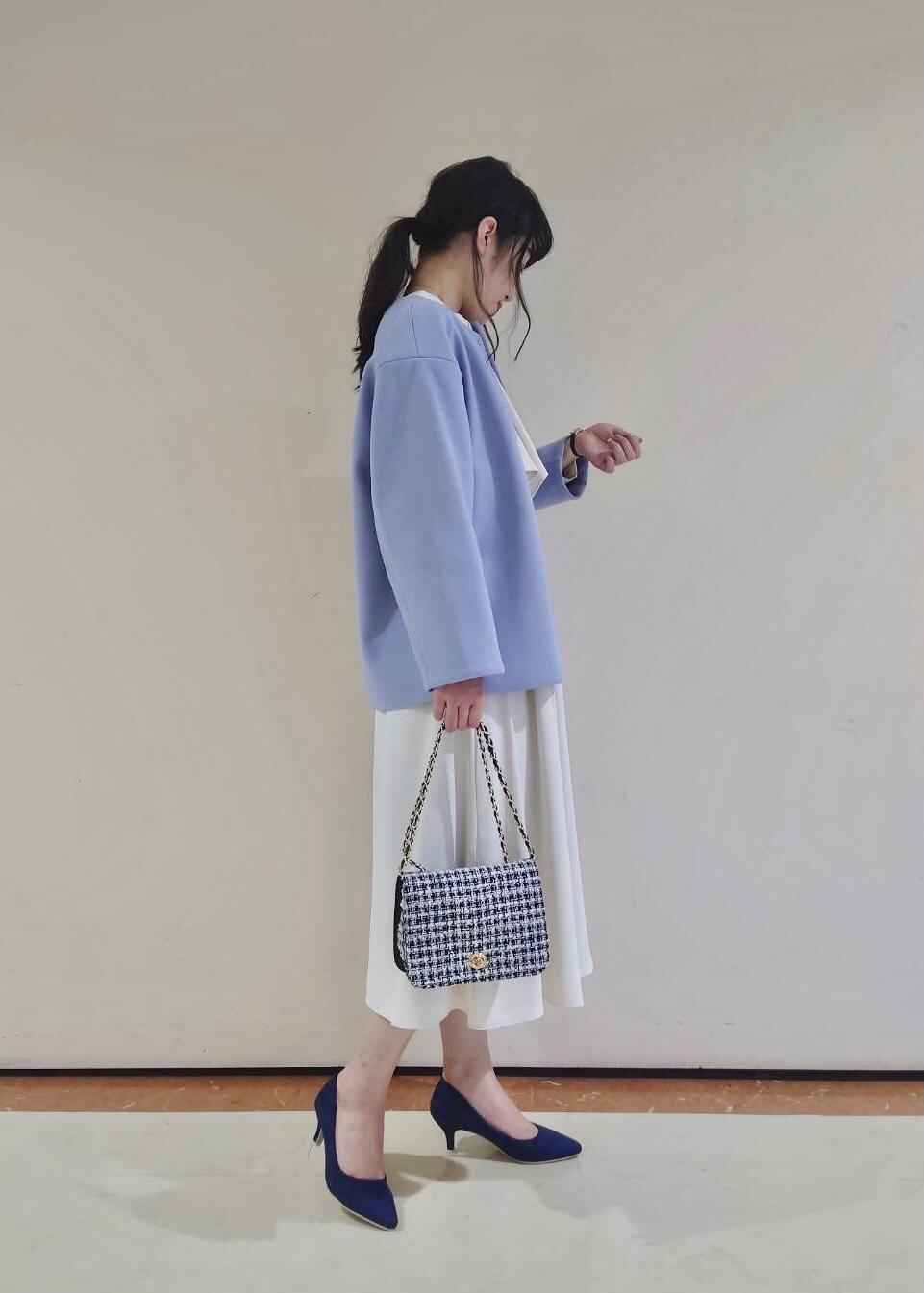 白のボウタイワンピース×優しい印象の水色が女性らしい組み合わせなので、顔合わせやデートなどにもおすすめです(^.^)
