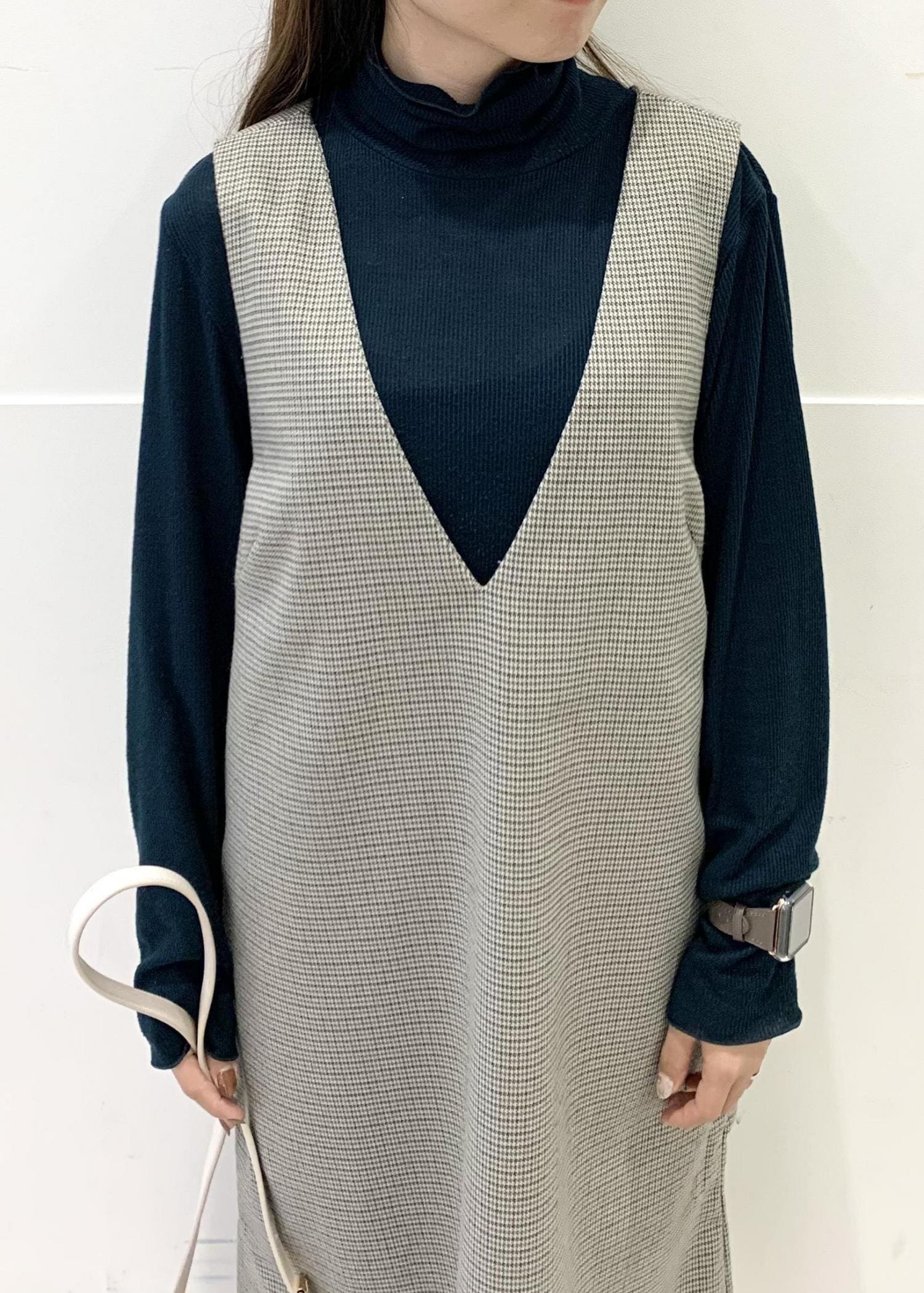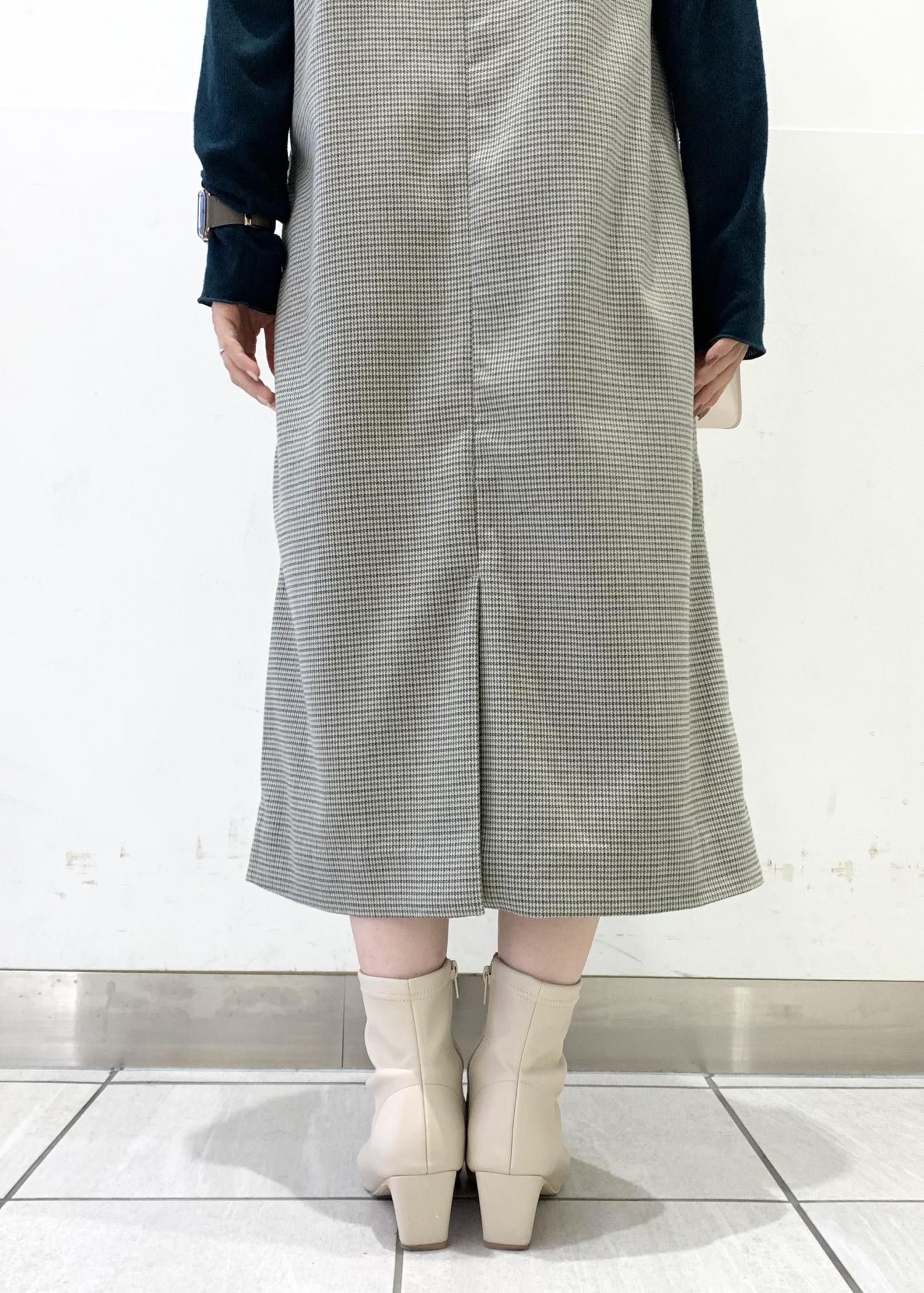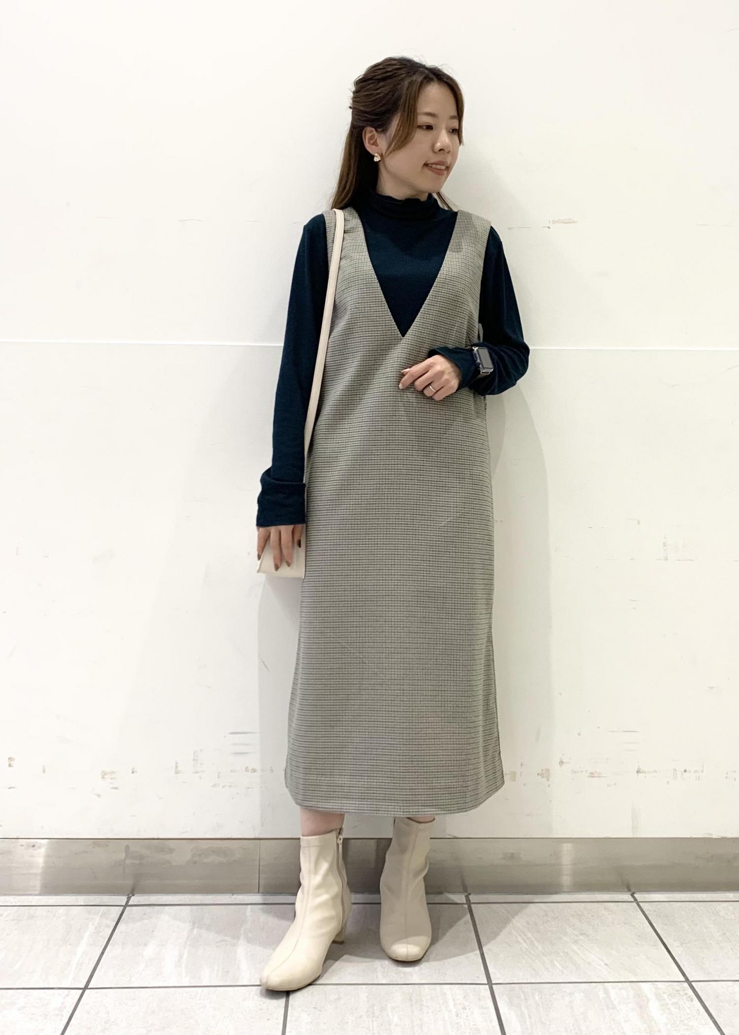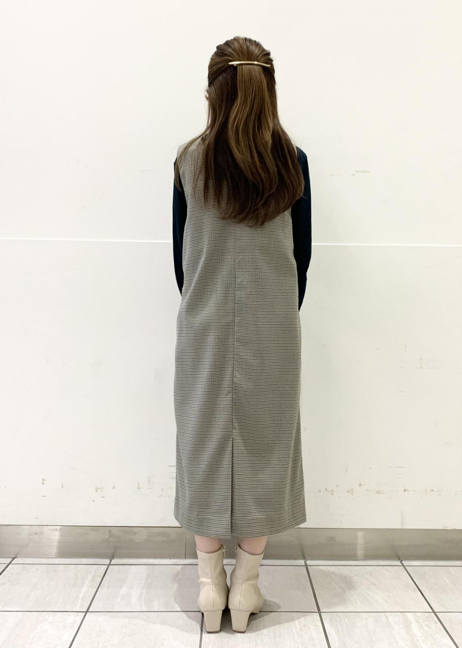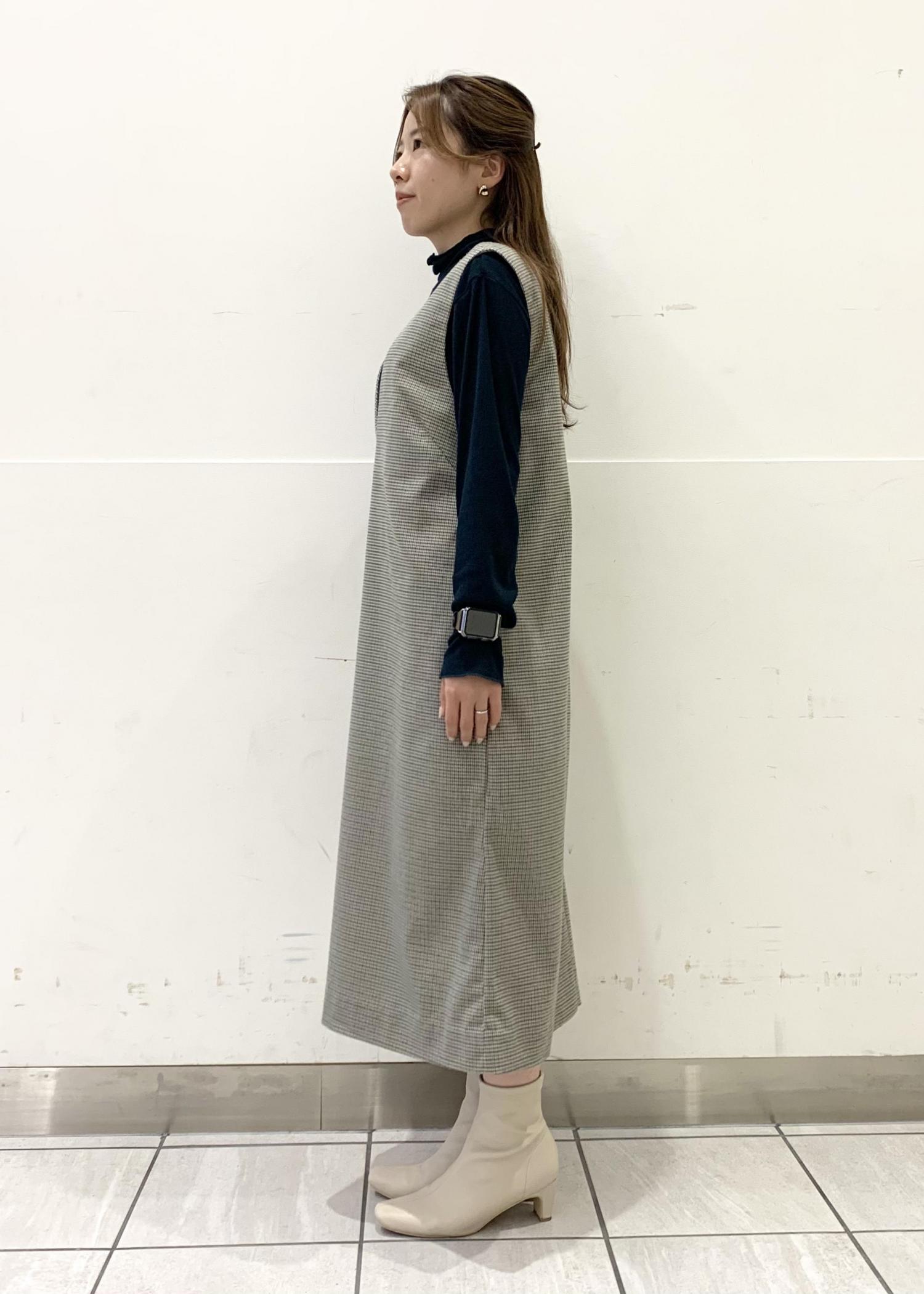 チェックのジャンパースカートに、同系色のトップスを合わせて統一感を出しました!