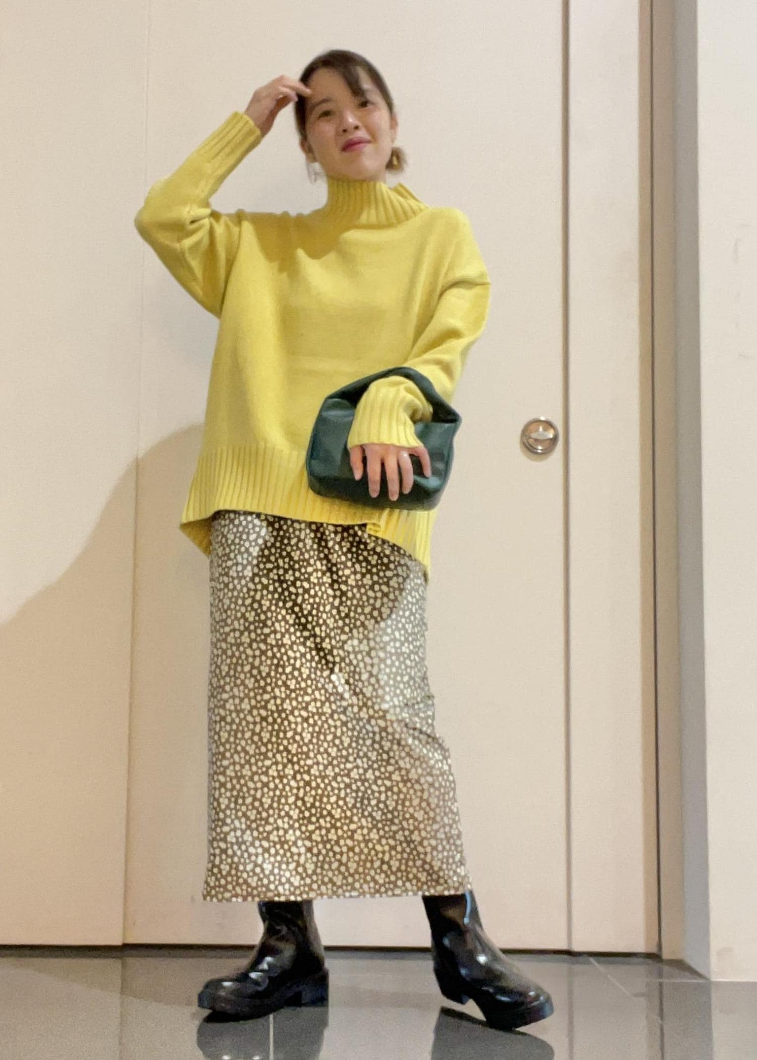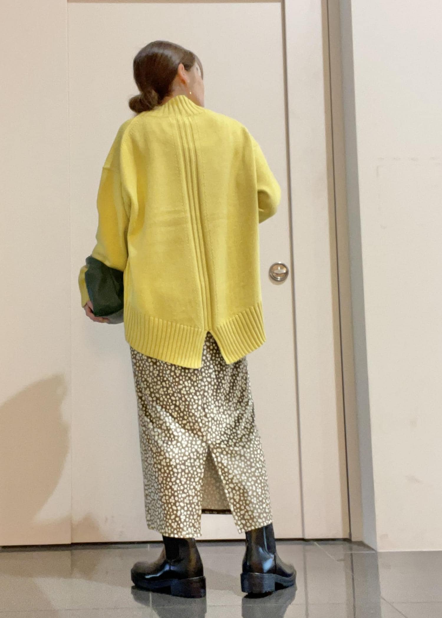 イエローとカーキで色味を馴染ませるスタイルで、カラーアイテムスタイルですが、少し落ち着いた印象で合わせて頂けます。