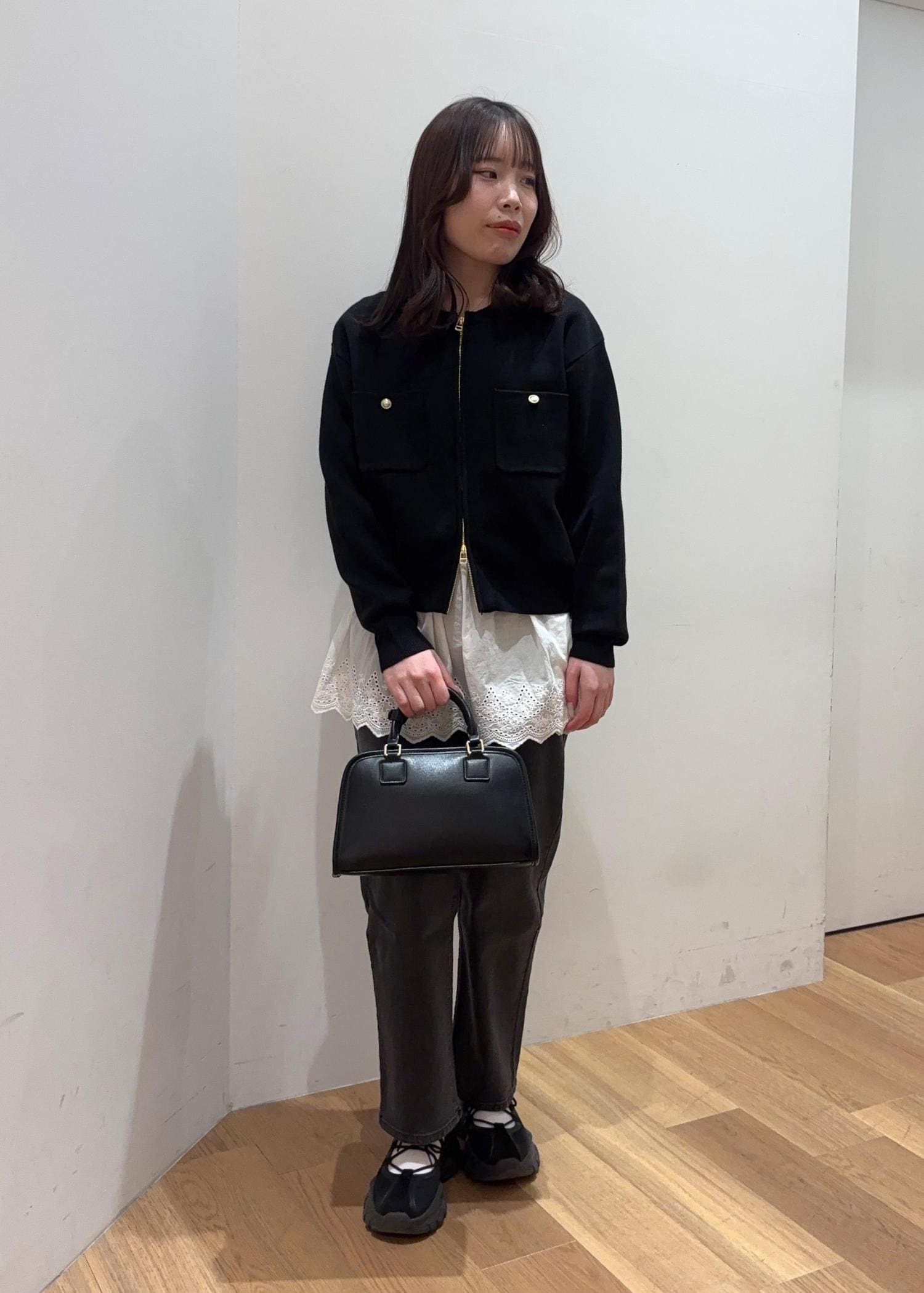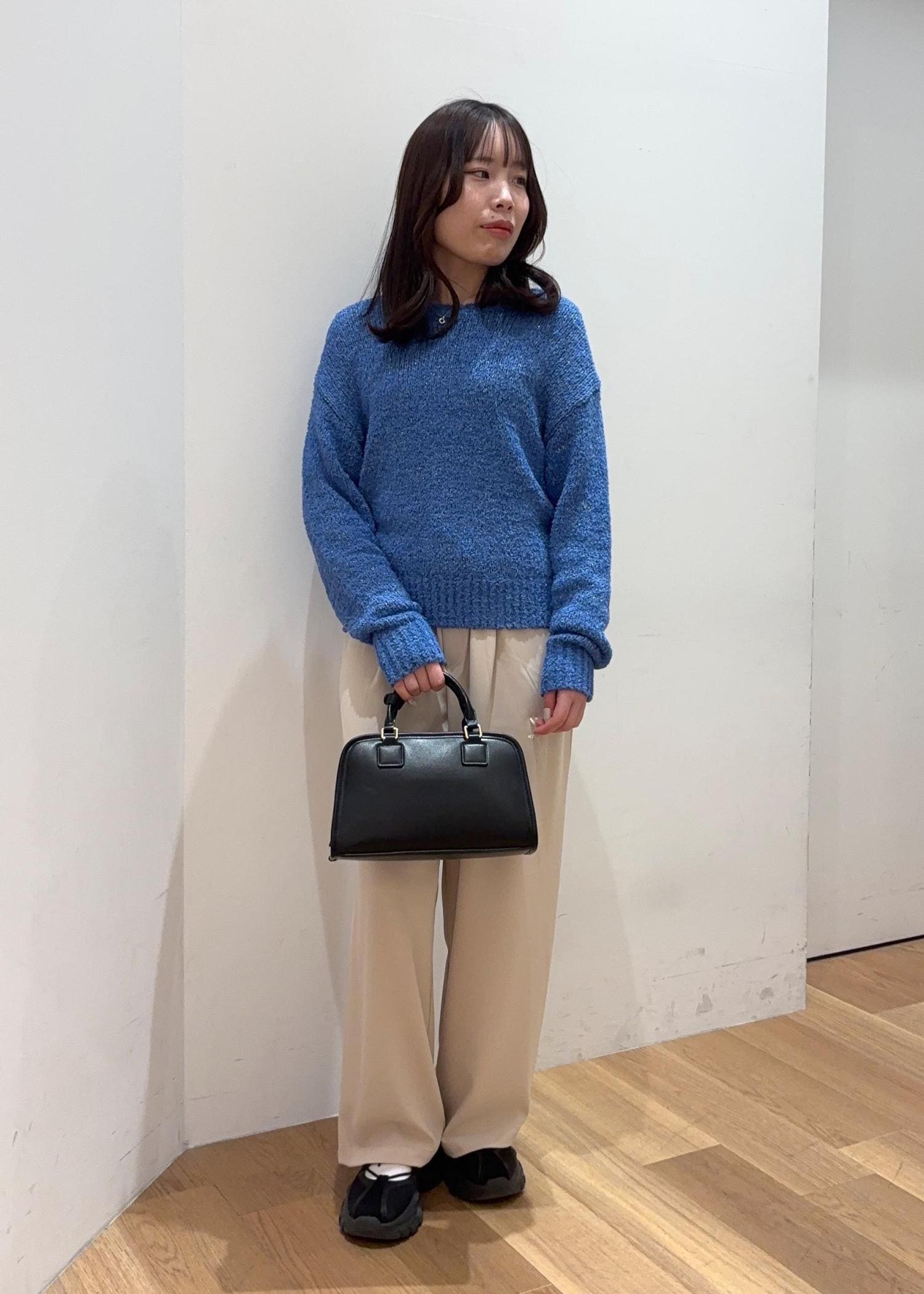 ブルー×カーキのチェック柄スカートをメインに、季節感あるコーディネートにしました。大きめチェックが目を引き、1枚でオシャレになるのでオススメです。