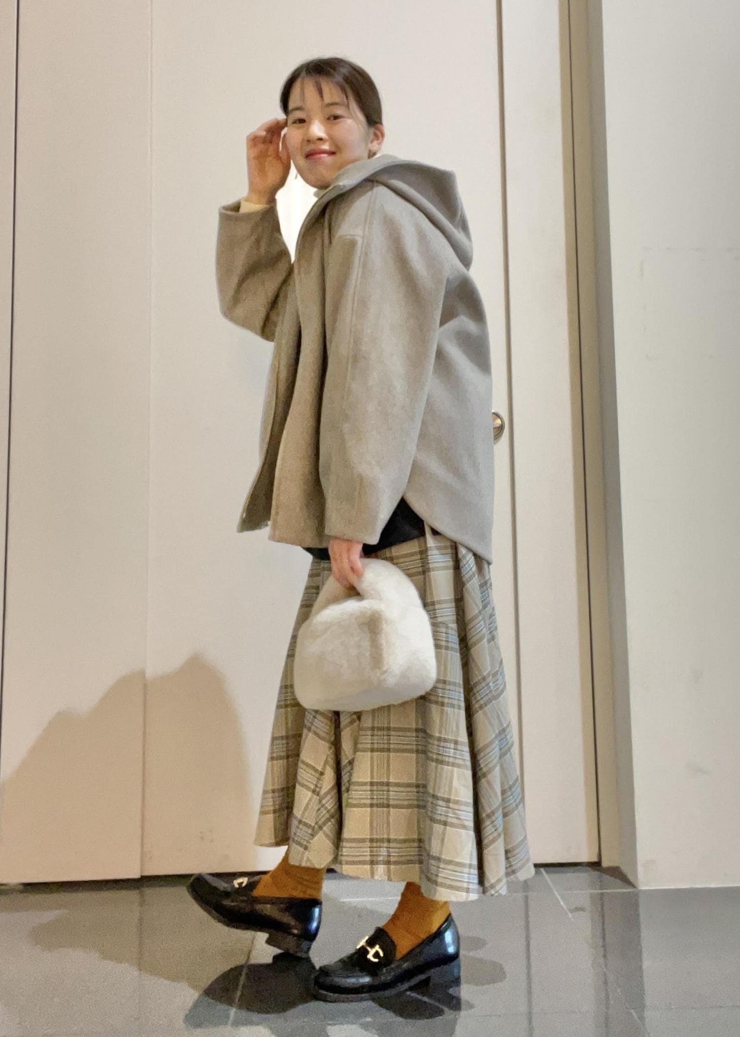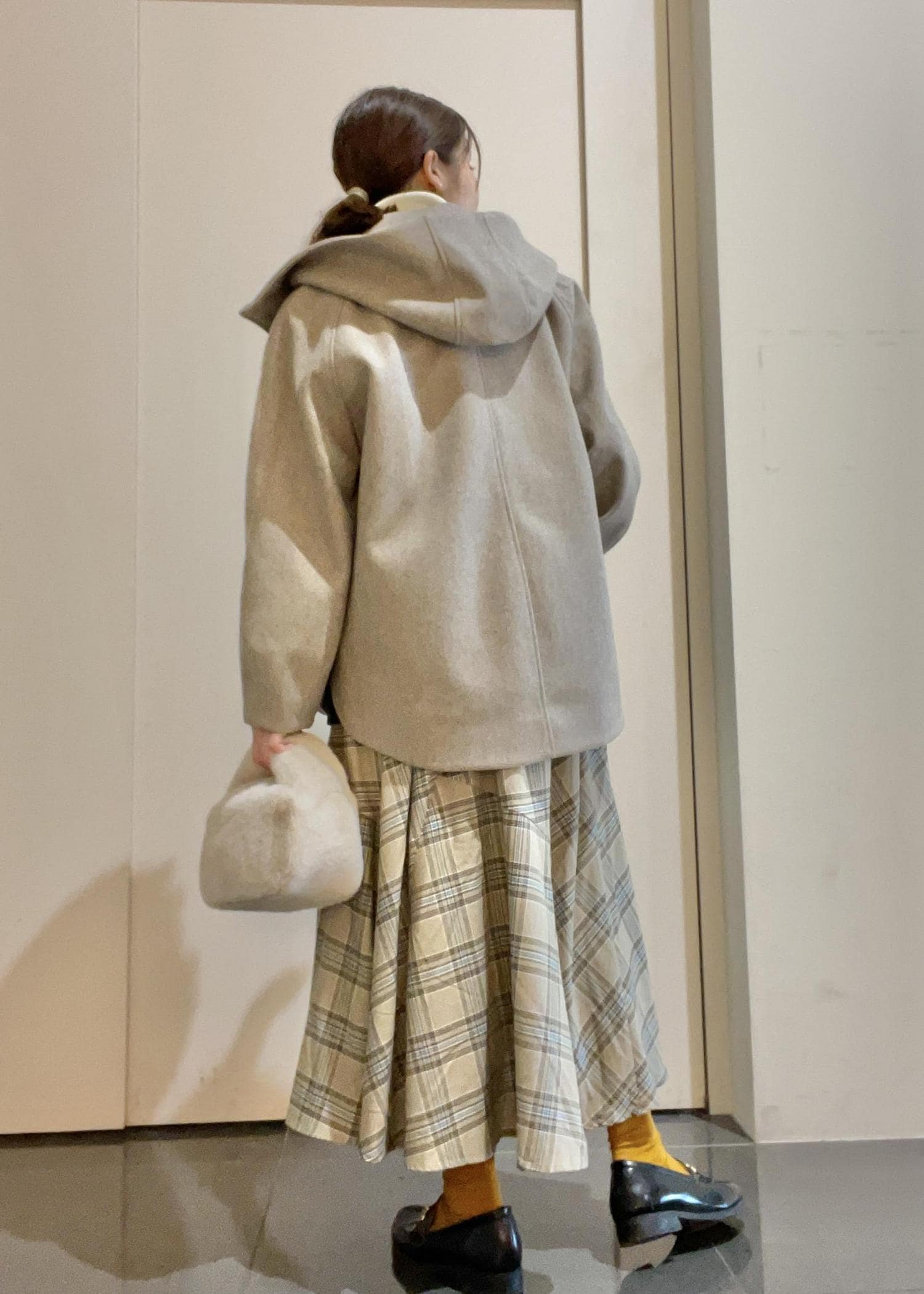 フーディアウターにチェックのボリュームスカートを合わせたナチュラルなカジュアルスタイルです!