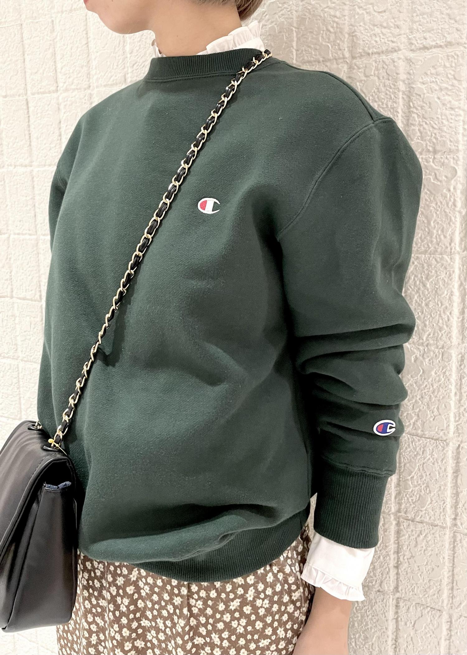 ゆるっとしたスウェットに、フリルシャツや小花柄スカートを合わせて女性らしさをプラスしたコーディネート。