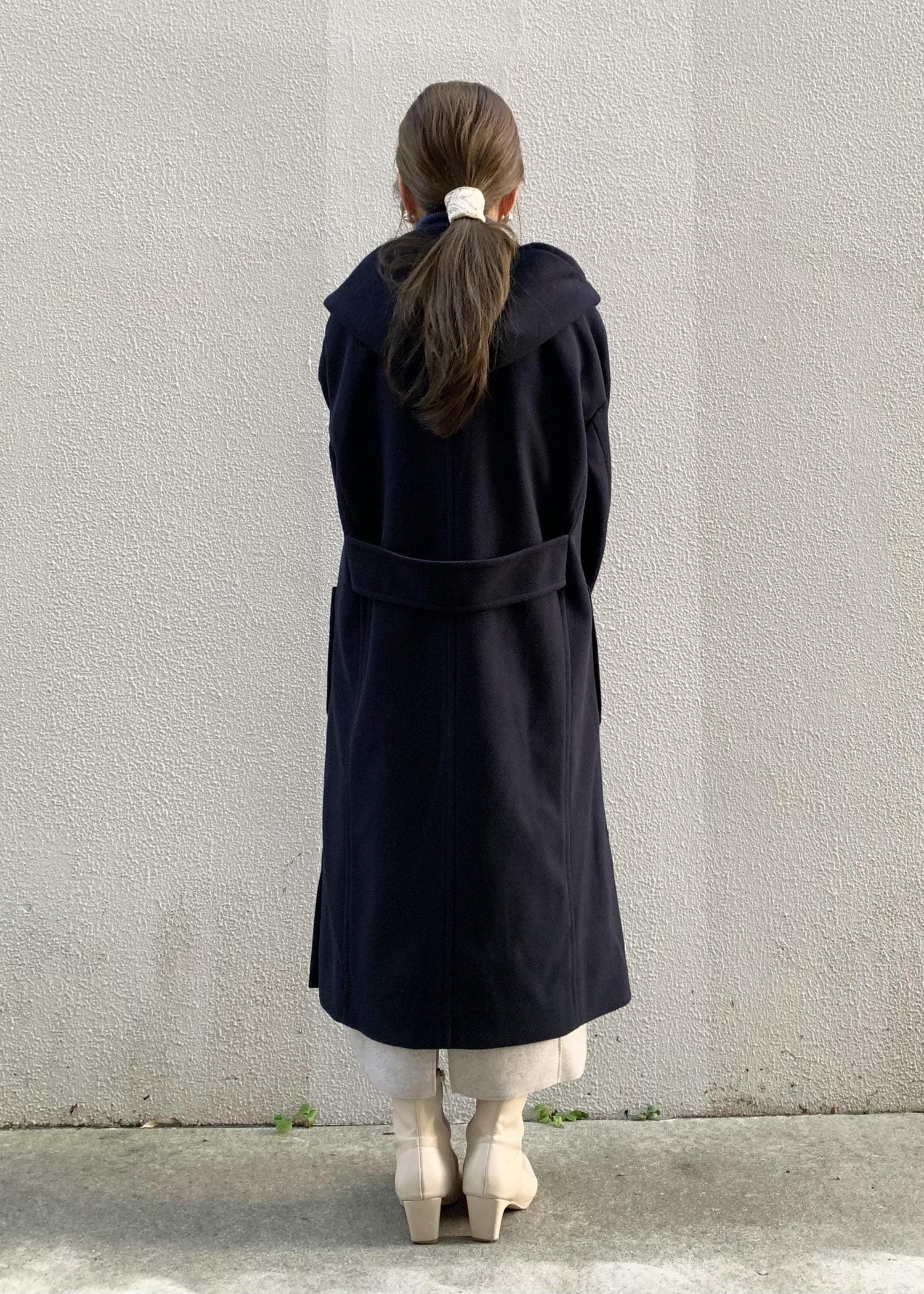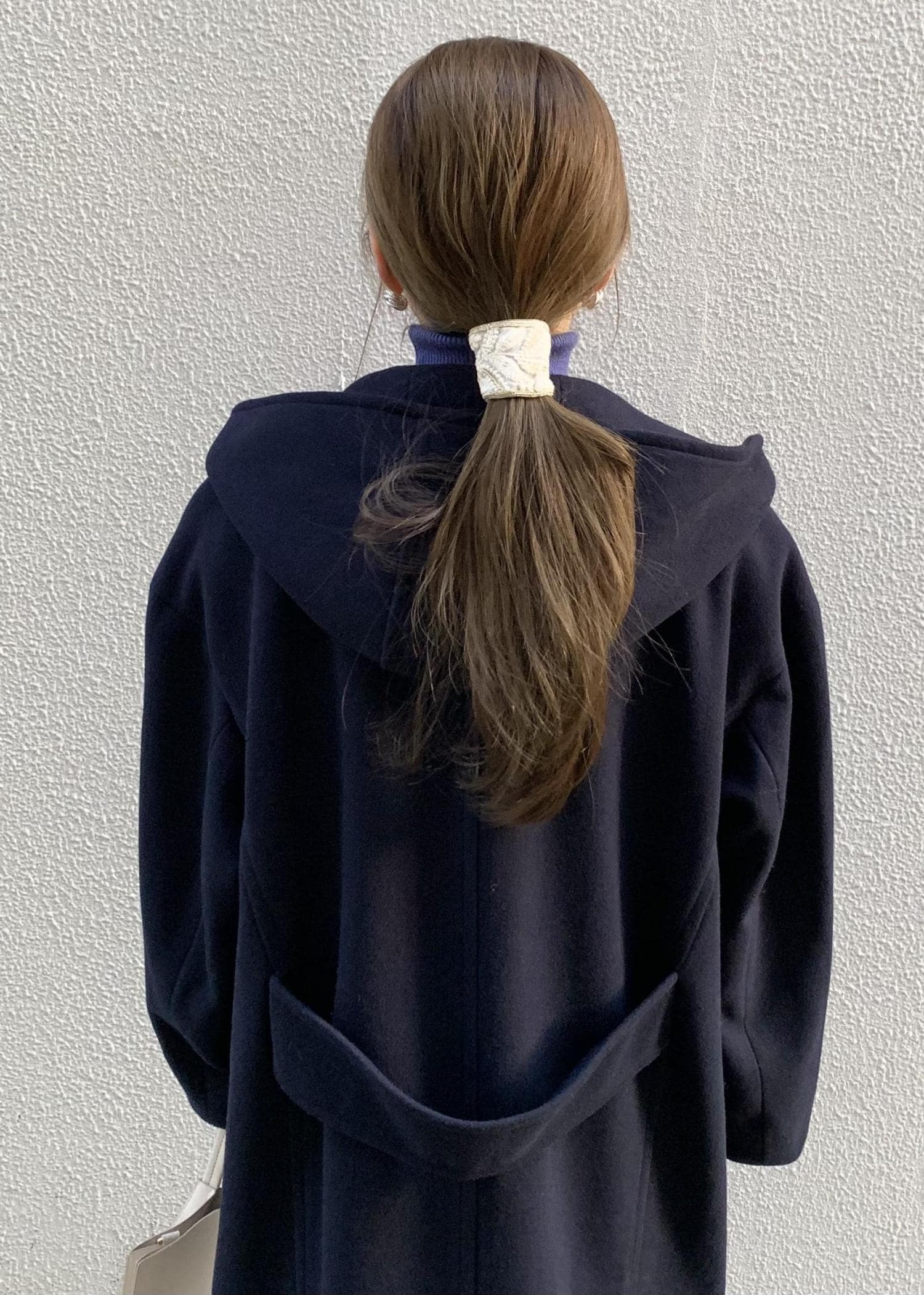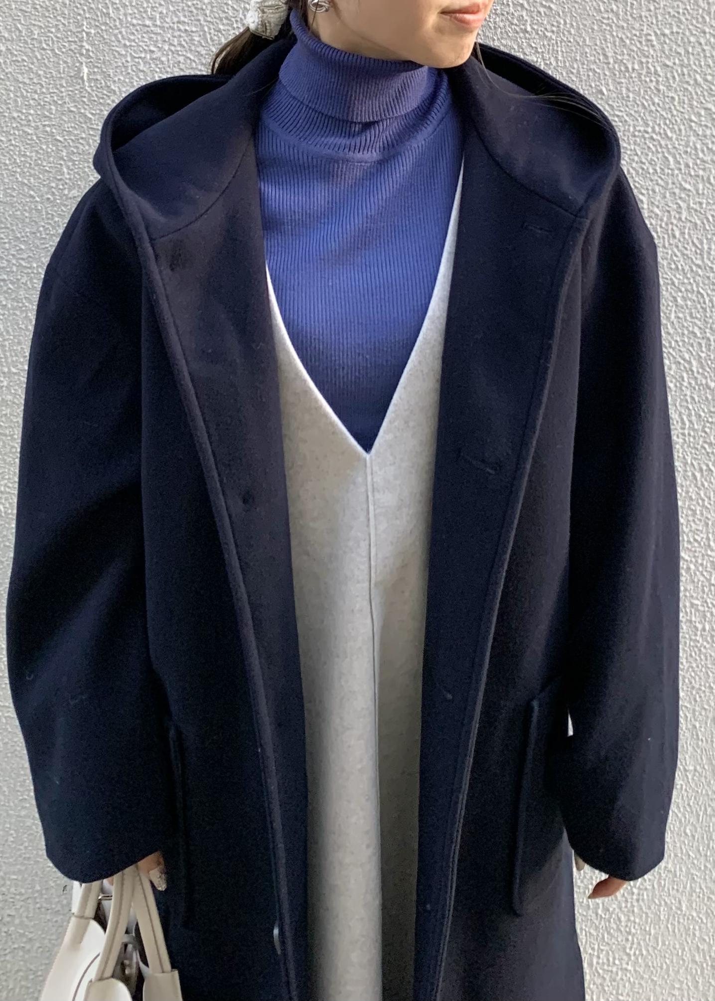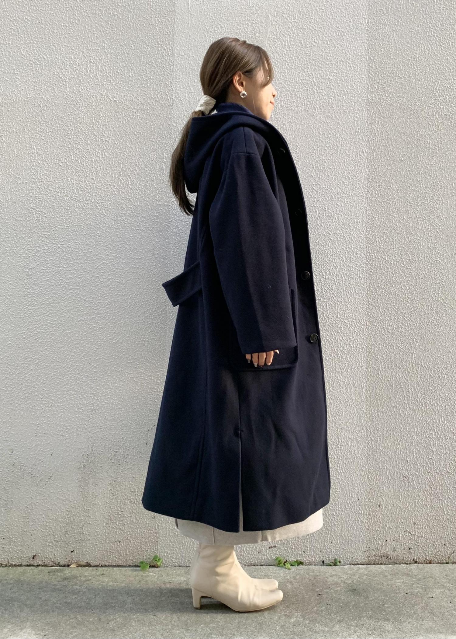 ジャンスカにフード付きのコートを合わせた、きれいめカジュアルコーデです。