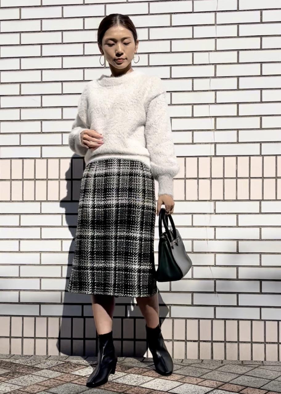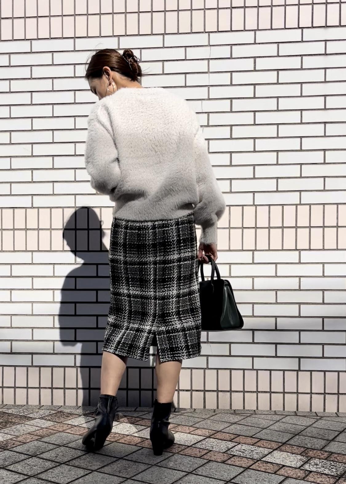 ツイードスカートで華やかさを出した分、色味はモノトーンで落ち着いた印象にまとめました。