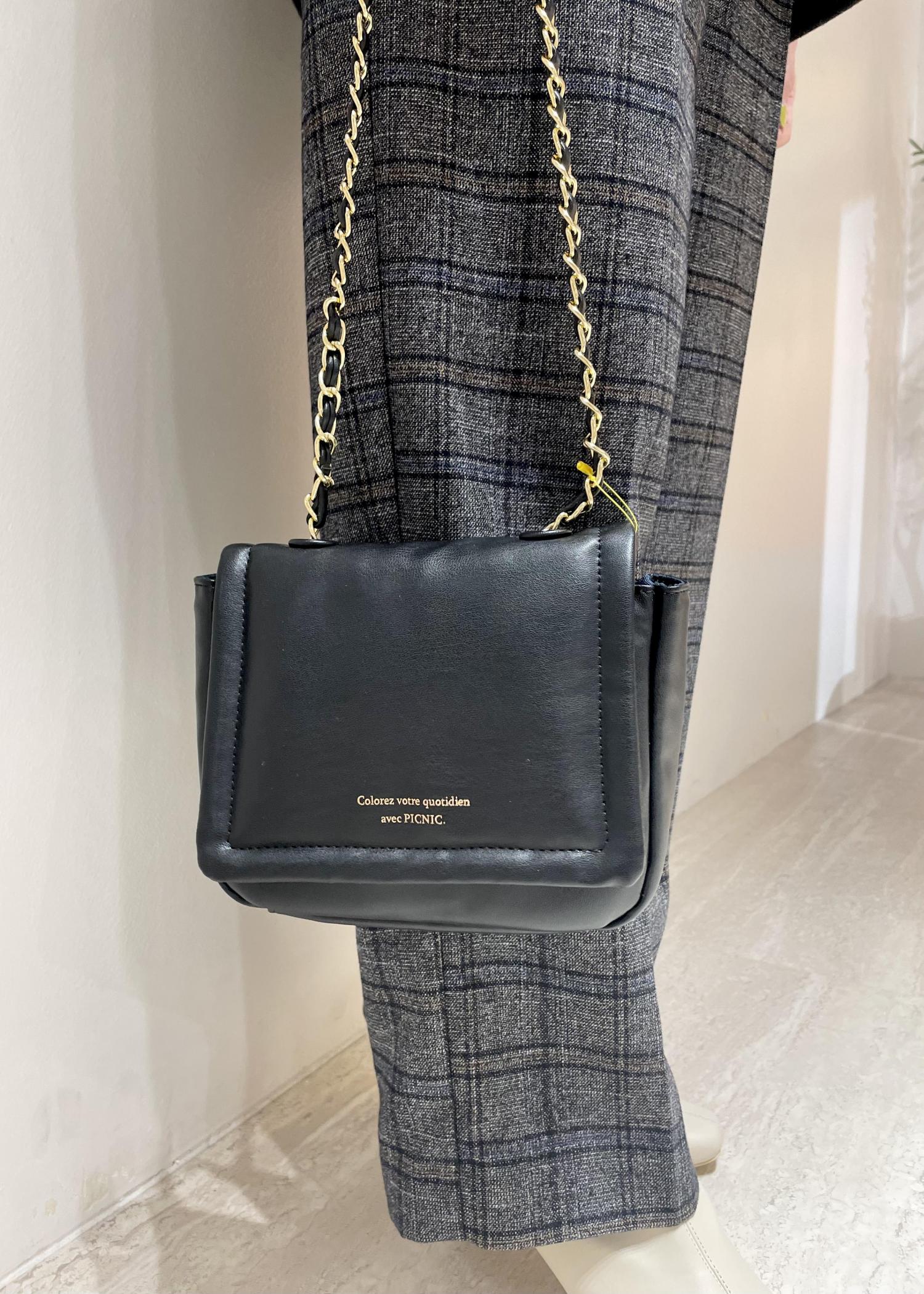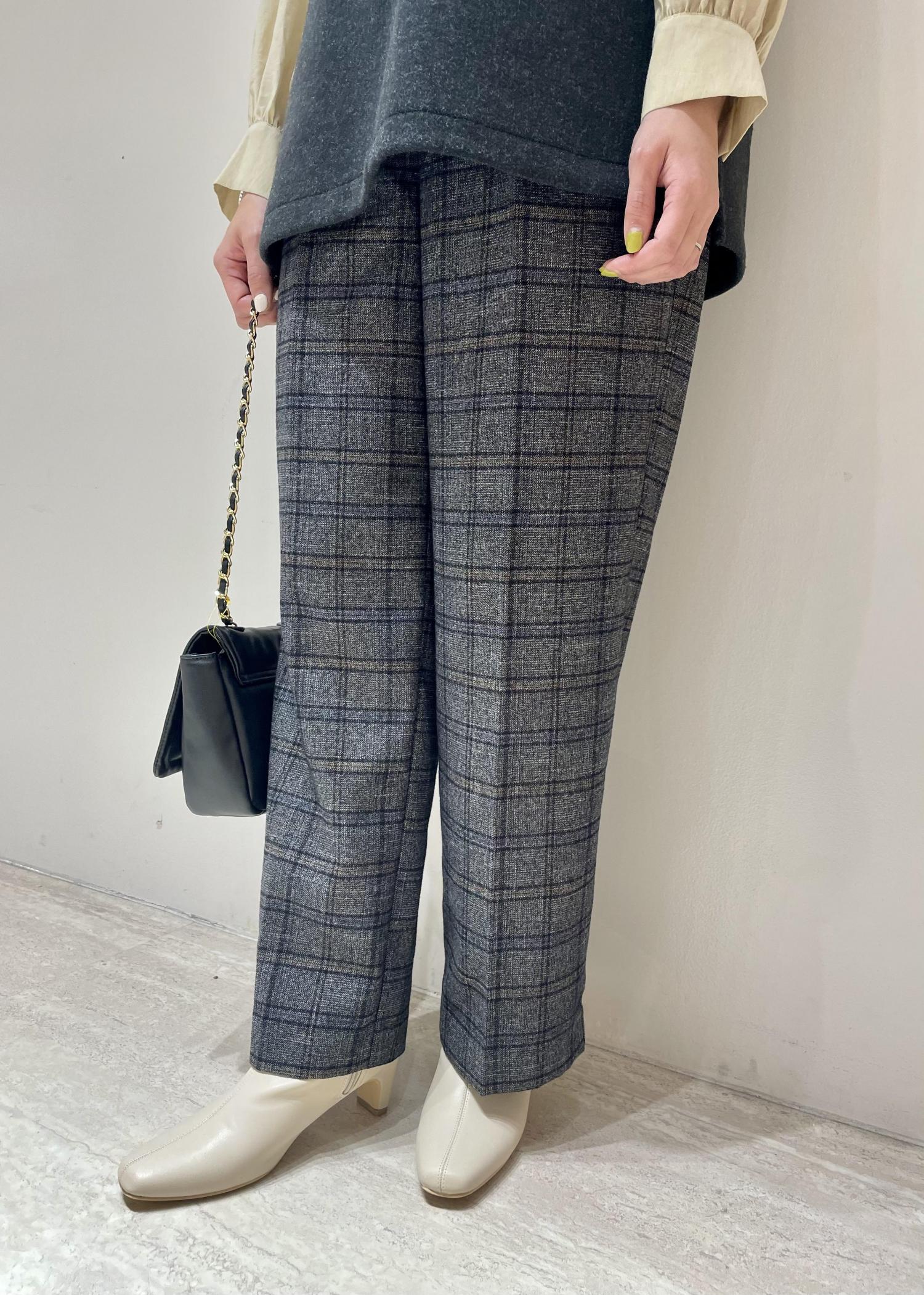 チェックワイドパンツを合わせてカジュアルダウンしつつも、ヒールのショートブーツやチェーンバッグを合わせて、女性らしく着こなしてみました。