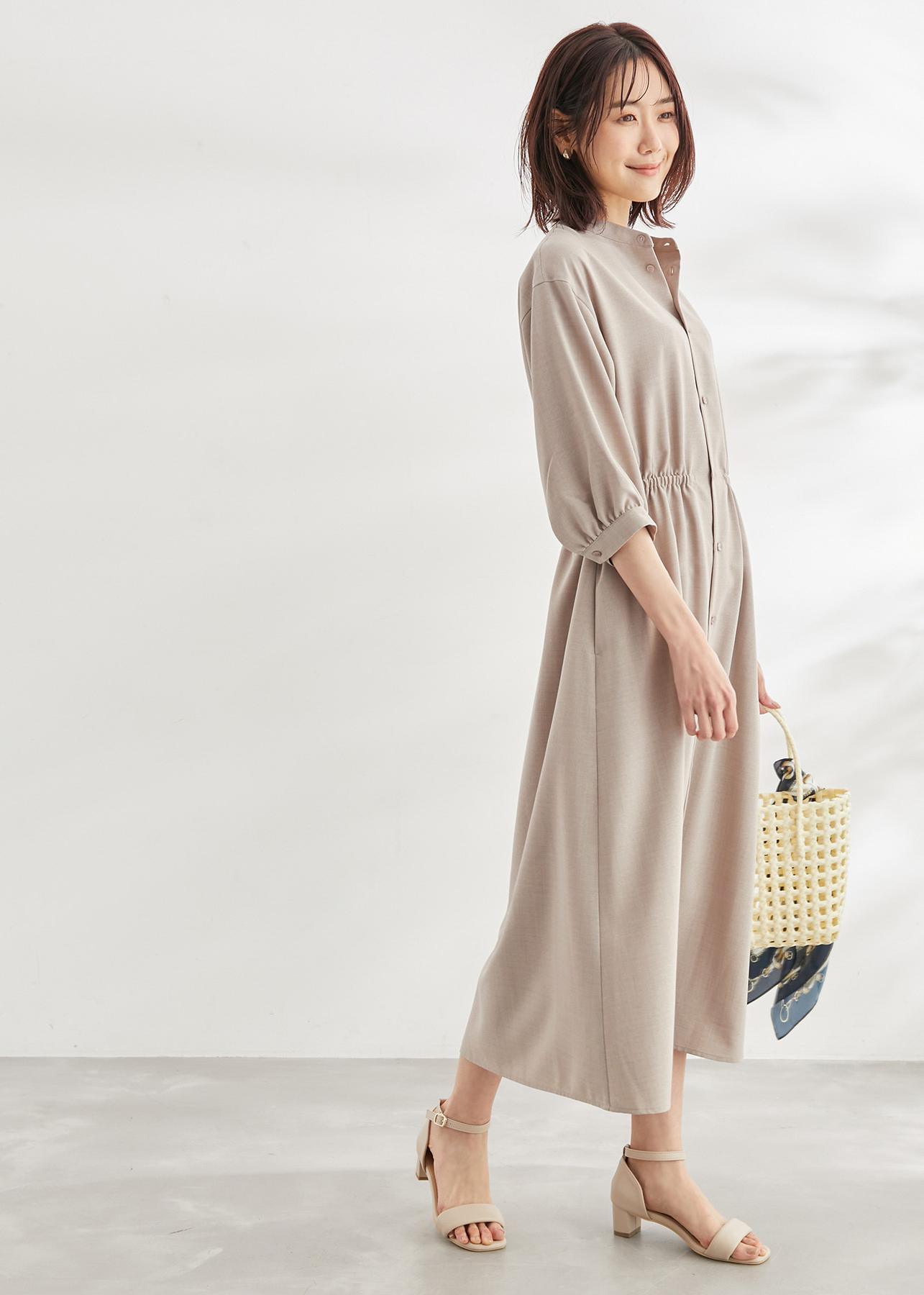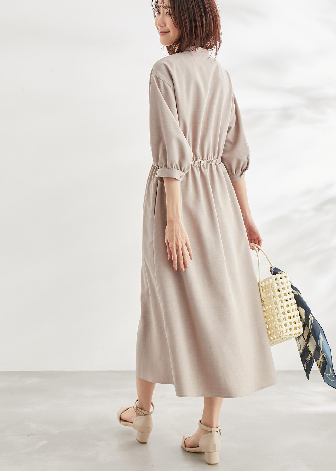 麻調の5分袖ワンピースは春夏にぴったり。
