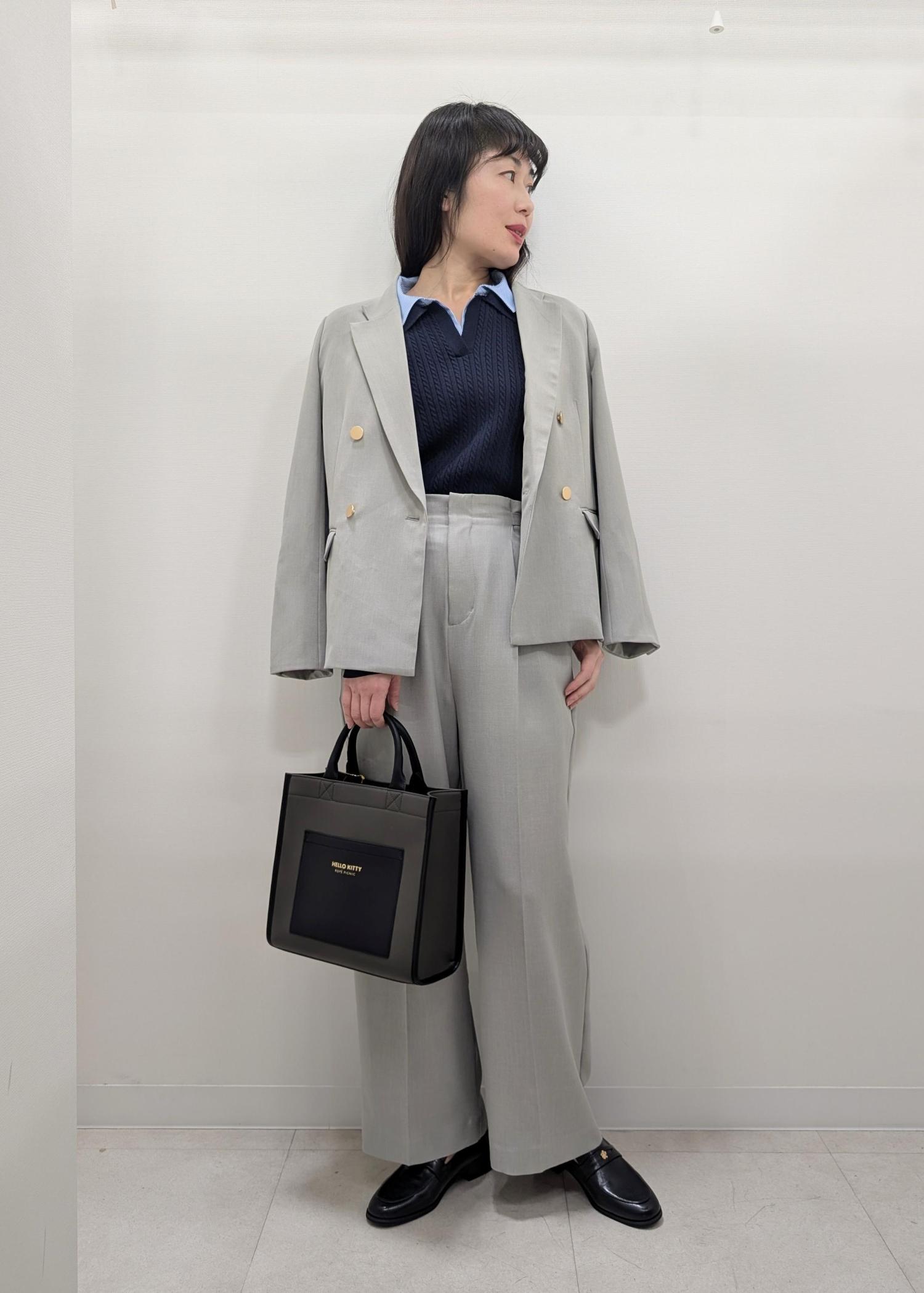 お洒落感のあるツイードのジャケットにシアーのボウタイブラウス、スカートは普段使いもしやすいプリーツスカートを合わせました。