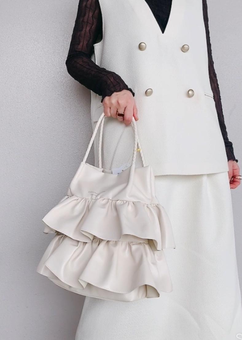 ポイントに大きめフリルが目を引くバッグを合わせた春のデートスタイルにも歳的なコーディネートです。