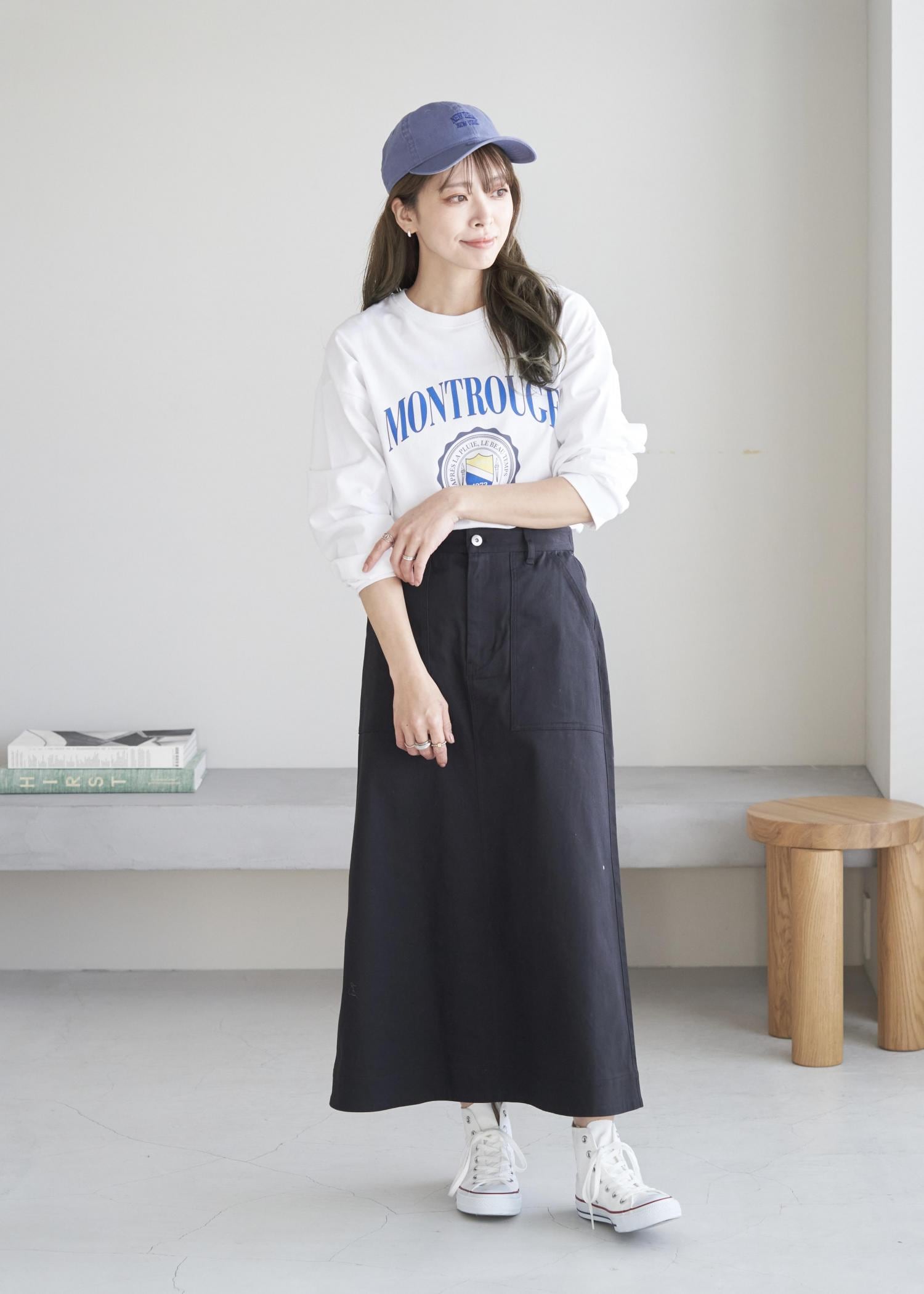 白のロンTにロングスカートを合わせたシンプルなカジュアルコーデです。